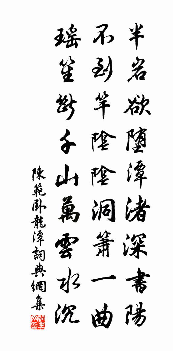 詩詞名句歷史字典書法欣賞書法字典國語詞典說文解字康熙字典古漢語字典標 題 作 者 詩 句 臥龍潭作者:陳范 朝代:宋代臥龍潭原文半岩欲墮潭渚深。書陽不到竿陰陰。洞簫一曲瑤笙斷,千山萬雲水沉。詩詞問答問:臥龍潭的作者是誰?答:陳范問:臥龍潭寫於哪個朝代?答:宋代陳范臥龍潭書法欣賞臥龍潭書法作品詩詞推薦杏花雜詩元好問〔金代〕裊裊纖條映酒船,綠嬌紅小不勝憐。長年自笑情緣在,猶要春風慰眼前。送許季韶粹桂林李洪〔宋代〕除墨猶新濕詔黃,題輿不稱愧龍光。且觀百粵蛟鱷徙,勿羨九霄鸞鵠翔。漢宮春(重和)徐鹿卿〔宋代〕吏隱南昌,問盤根幾世,長子孫枝。仙風道骨如此,信不吾欺。素姿傾國,□難昏、坐覺愆期。算好與、水仙作配寄江居耿處士齊己〔唐代〕野癖雖相似,生涯即不同。紅霞禪石上,明月釣船中。醉倒蘆花白,吟緣蓼岸紅。相思何以寄,吾道本空空。次韻周公謹見寄馬廷鸞〔宋代〕空山學仙子,滿耳笙簫聽。誰知九天上,雲扉本不扃。度世同御風,蓬蓬隨飄零。又如芬陀花,出火而青青。靜法師東齋王昌齡〔唐代〕築室在人境,遂得真隱情。春盡草木變,雨來池館清。琴書全雅道,視聽已無生。閉戶脫三界,白雲自虛盈。早春晁說之〔宋代〕日日江頭騁望頻,東風去歲舊相親。庾郎於作披香賦,未有花開未是春。題靈山寺張喬〔唐代〕樹涼清島寺,虛閣敞禪扉。四面閒雲入,中流獨鳥歸。湖平幽徑近,船泊夜燈微。一宿秋風裡,煙波隔搗衣。二月二日夢中作陸游〔宋代〕零落薔薇委道傍,更堪微雨漬殘香!象床玉尺人何在?腸斷新裁錦一方。贈李愬僕射王建〔唐代〕唐州將士死生同,盡逐雙旌舊鎮空。獨破淮西功業大,新除隴右世家雄。知時每笑論兵法,識勢還輕立戰功。次第楊仲承秘書蹉跎三年今得榮州文學冬日貽書以王洋〔宋代〕昔年曾嘆小差池,官帶榮名自有時。二火併光君有漸,一茅覆屋兩相宜。心田自樂緣知足,世路無求亦少思。好是清波引姜夔〔宋代〕冷雲迷浦。倩誰喚、玉妃起舞。歲華如許。野梅弄眉嫵。屐齒印蒼蘚,漸為尋花來去。自隨秋雁南來,望江國、渺題司理采芙蓉圖方岳〔宋代〕紉之以湘纍秋蘭之佩,載之以剡溪夜雪之舟。漱之以清冰寒露之壺,澆之以碧玉晴雲之甌。著童船尾書船頭,荷化翻憂晁說之〔宋代〕歲暮窮途惱白頭,況加一歲更荒州。家禽聚處無居屋,野水分時便斷流。何物不堪供佛淚,誰人可與共咨謀。一生風篁嶺董嗣杲〔宋代〕橫陳翠葆列煙屏,聯步蒼林想典刑。二老相分龍井嶺,一時如過虎溪亭。風搜貼石業篁碧,雨剝題名暈蘚青。更有朅來吳汝弌〔宋代〕嶺上朅來弄明月,千里銀光寒不缺。蝦{左蟲右麻}魍魎走死盡,直數秋毫上金闕。心如此月月如心,嗒然獨據無慶雲章陳子昂〔唐代〕崑崙元氣,實生慶雲。大人作矣,五色氤氳。昔在帝媯,南風既薰。叢芳爛熳,鬱郁紛紛。曠矣千祀,慶雲來止,春雨絕句陸游〔宋代〕千點猩紅蜀海棠,誰憐雨里作啼妝?殺風景處君知否,正伴鄰翁救麥忙。除夜吟曹勛〔宋代〕咚咚夜漏嚴軍鼓,鼓聲入云云欲舞。寒風奰屓頑無聲,野色埋光暗塵土。梅花隨臘散胡笳,胡笳曉色明春圃。春風採桑子晏幾道〔宋代〕日高庭院楊花轉,閒淡春風。昨夜匆匆,顰入遙山翠黛中。金盆水冷菱花淨,滿面殘紅。欲洗猶慵,弦上啼烏此夜名句推薦曾苦傷春不忍聽,鳳城何處有花枝李商隱《流鶯》 三月三日天氣新,長安水邊多麗人。杜甫《麗人行》 莫莫高山,深谷逶迤佚名《紫芝歌》 待把酒送君,恰又清明後。何夢桂《摸魚兒·記年時人人何處》 無父無君,是禽獸也。孟子《孟子·滕文公章句下·第九節》 昔時人已沒,今日水猶寒。駱賓王《於易水送人 / 於易水送別》 身同而懼同,以其至畏而刑之,其人固屈。來俊臣《羅織經·問罪卷第十》 君子少思長,則學;老思死,則教;有思窮,則施也。荀子《荀子·法行》 台在山腰,一峰突起,離水十餘丈。沈復《浮生六記·浪遊記快》 今朝此為別,何處還相遇。韋應物《初發揚子寄元大校書》