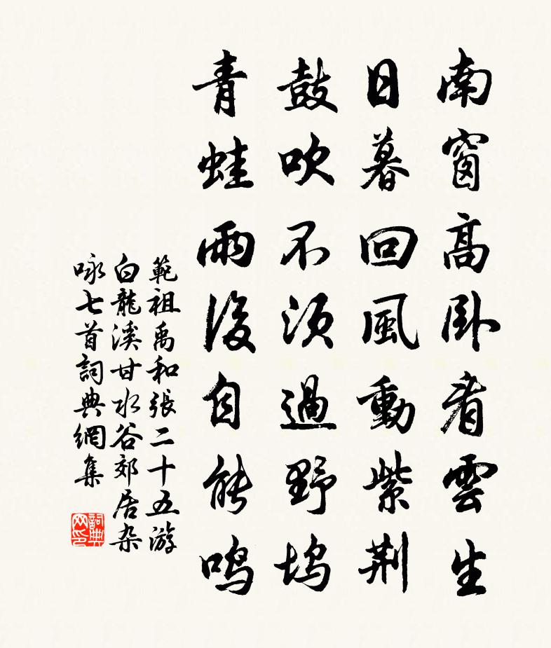 詩詞名句歷史字典書法欣賞書法字典國語詞典說文解字康熙字典古漢語字典標 題 作 者 詩 句 和張二十五游白龍溪甘水谷郊居雜詠七首作者:范祖禹 朝代:宋代原文南窗高臥看雲生,日暮迴風動紫荊。鼓吹不須過野塢,青蛙雨後自能鳴。詩詞問答問:《和張二十五游白龍溪甘水谷郊居雜詠七首》的作者是誰?答:范祖禹問:該詩寫於哪個朝代?答:宋代書法欣賞和張二十五游白龍溪甘水谷郊居雜詠七首書法作品詩詞推薦食梅沈說〔宋代〕兒時摘青格,葉底尋彈丸。所恨襟袖窄,不憚頰舌穿。我年不自覺,以我齒尚完。嘗新試一薦,喉棘眉先攢。豈味與兒輩小集陸游〔宋代〕老子秋來樂事稠,吳粳新搗酒新篘。矮黃不待園官送,小白每煩溪女留。頓飽可憐頻夢與,半酣自喜有兒酬。不如多雨仇遠〔宋代〕菜色青肥麥漸黃,雨多泥滑野畦荒。官田昨夜方車水,早起看來又渺茫。題芭蕉葉賀鑄〔宋代〕十畝荒池漲綠萍,南風不見芰荷生。隔窗賴有芭蕉葉,未負瀟湘夜雨聲。郊廟歌辭祭汾陰樂章太簇角盧從願〔唐代〕坤元載物,陽樂發生。播殖資始,品匯鹹亨。列俎棋布,方壇砥平。神歆禋祀,後德惟明。句丁謂〔宋代〕天門九重開,終當掉臂人。遠遊篇壽立齋金履祥〔宋代〕我歌遠遊篇,西望心悠然。孰能為此游,渺渺重山川。和鸞車班班,珩佩聲珊珊。塊視幾丘陵,帶視幾流泉。正氣連日大寒夜坐復苦飢戲作短歌陸游〔宋代〕翁飢不能具小餐,兒凍何由成復褌?藏書充棟讀至老,固願少出蘇黎元。念當萬事度可否,肯使一恨彌乾坤。古來酬皇甫侍御見寄,時前相國姑臧公初臨郡劉長卿〔唐代〕離別江南北,汀洲葉再黃。路遙雲共水,砧迥月如霜。歲儉依仁政,年衰憶故鄉。佇看宣室召,漢法倚張綱。謾成史安叔〔宋代〕閒較新詩意未降,吟髭撚斷數莖霜。忽然得句笑聲發,驚起花間蝶也狂。水調歌頭呂頤浩〔宋代〕一片蒼崖璞,孕秀自天鍾。渾如暖煙堆里,乍放力猶慵。疑是犀眠海畔,貪玩爛銀光彩,精魄入蟾宮。潑墨陰雲妒揚州偶會前洛陽盧耿主簿(應物頃貳洛陽常有連騎之游)韋應物〔唐代〕楚塞故人稀,相逢本不期。猶存袖裡字,忽怪鬢中絲。客舍盈樽酒,江行滿篋詩。更能連騎出,還似洛橋時。寄林處士景初連文鳳〔宋代〕詩書歲月久,到老未忘情。一自文風變,長憂雅道輕。時人空見忌,聖主舊知名。更有孤高節,冰霜無此清。福州黃檗寺翁卷〔宋代〕天下兩黃檗,此中山是真。碑看前代刻,僧值故鄉人。一宿禪房雨,經時客路塵。將行更瞻禮,十二祖師身。出郊用劭農韻三首吳潛〔宋代〕連檣載米去輸官,只得將為樂土看。餉互豚蹄秋願了,飽均雞犬午舂殘。門前掃刮犁鋤淨,屋上鋪添稾秸乾。識字鷓鴣天(不寐)辛棄疾〔宋代〕老病那堪歲月侵。霎時光景值千金。一生不負溪山債,百藥難治書史淫。隨巧拙,任浮沈。人無同處面如心。不妨遠山齊己〔唐代〕天際雲根破,寒山列翠回。幽人當立久,白鳥背飛來。瀑濺何州地,僧尋幾嶠苔。終須拂巾履,獨去謝塵埃。寄題玉山周晦叔家似賢齋陳文蔚〔宋代〕人心殊嗜好,黑白互相形。農臭不自悟,熒熒飛青蠅。一日對此君,炯然又眼明。子猷雖借宅,綠陰仍滿庭。雅淨送棗陽軍使劉似之兼棗陽令姜特立〔宋代〕四方男子志,當在壯年時。民社非輕異,才猷且小施。附庸今列邑,大國古稱隨。莫謂朝廷遠,行看召驛馳。送別史友六首敖陶孫〔宋代〕煙霏巧濕行李,鐘鼓初分去舟。中有錦衣尚褧,旁看泥軾垂油。名句推薦兒童漫相憶,行路豈知難。元好問《倪莊中秋》 東風惆悵欲清明,公子橋邊沉醉。張泌《滿宮花·花正芳》 孤鴻號外野,翔鳥鳴北林。阮籍《詠懷八十二首·其一》 但夢想、一枝瀟灑,黃昏斜照水周邦彥《花犯·小石梅花》 山無陵,江水為竭。佚名《上邪》 傳屐朝尋藥,分燈夜讀書。於鵠《題鄰居》 落木蕭蕭,琉璃葉下瓊葩吐。王十朋《點絳唇·素香丁香》 輔弼之臣瓦解,而邪諂之人並進班固《漢書·傳·東方朔傳》 學之興廢,隨世輕重。顏之推《顏氏家訓·勉學篇》 秋靜見旄頭,沙遠席羈愁李賀《塞下曲》