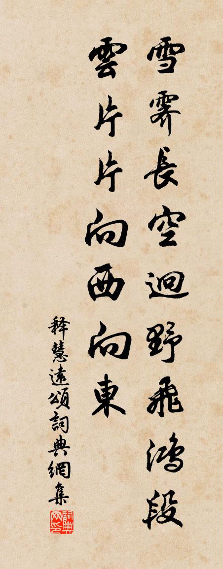 詩詞名句歷史字典書法欣賞書法字典國語詞典說文解字康熙字典古漢語字典標 題 作 者 詩 句 頌作者:釋慧遠 朝代:宋代頌原文雪霽長空,迥野飛鴻。段雲片片,向西向東。詩詞問答問:頌的作者是誰?答:釋慧遠問:頌寫於哪個朝代?答:宋代釋慧遠頌書法欣賞頌書法作品詩詞推薦暮春對花崔櫓〔唐代〕病香無力被風欺,多在青苔少在枝。馬上行人莫回首,斷君腸是欲殘時。偈頌六十八首釋法薰〔宋代〕曲曲彎彎,平平坦坦。七穿八穴,十字縱橫。是汝諸人,不妨東行西行,第一莫教撞著跛腳老雲門。游沖虛觀蔡襄〔宋代〕真人玉骨輕,御氣升瑤台。俯首視下方,萬落腥塵埃。香火久寂寞,山川空徘徊。舊樹絡青蔓,虛壇生紫苔。宴坐食櫻筍二首蘇轍〔宋代〕林竹抽萌不忍挑,誰家盈束伴晨樵。籜龍似欲號無罪,食客安知惜後凋。不願鹽梅調鼎味,姑從律呂應簫韶。林間送德隆山主釋重顯〔宋代〕霜葉凋殘,岩風凜寒。彼之禪老,忽下崇巒。衲有雲兮曾卷未卷,琴無弦兮解彈不彈。迢迢既行,宜聽斯語。明暗代陳季若上張帥林光朝〔宋代〕銅柱參天桂葉稠,公侯遺愛在南州。繩橋竹屋連溪曲,大貝明珠盡海頭。詩贈晚學李君邢仙老〔宋代〕人稀境盡絕塵埃,野客尋源或到來。怪石結成真洞府,亂山堆就假樓台。久窮至理難期老,獨放真機學未該。得共鷓鴣天佚名〔宋代〕五百人中第一仙。等閒平步上青天。綠袍乍著君恩重,黃榜初開御墨鮮。龍作馬,玉為鞭。花如羅綺柳如綿。時人長沙勸耕真德秀〔宋代〕田裡工夫著得勤,翻鋤須熟糞須均。插秧更要當時節,趁取陽和三月春。早梅陸游〔宋代〕東塢梅初動,香來托意深。明知在籬外,行到卻難尋。雨窗釋永頤〔宋代〕江湖春水欲生時,開盡梅花雁北飛。風雨滿庭人不寐,小窗燈火夜深微。念金鑾子二首白居易〔唐代〕衰病四十身,嬌痴三歲女。非男猶勝無,慰情時一撫。一朝舍我去,魂影無處所。況念夭化時,嘔啞初學語。始知酒中十詠酒樽皮日休〔唐代〕犧樽一何古,我抱期幽客。少恐消醍醐,滿擬烘琥珀。猿窺曾撲瀉,鳥蹋經欹仄。度度醒來看,皆如死生隔。出真陽峽十首楊萬里〔宋代〕江楓新染綠衣衫,知費春風幾杷藍。道是春光在桃李,試除桃李盡教參。念奴嬌(三和)劉克莊〔宋代〕四朝遺老,鬚眉白、巧曆不知其紀。真喚九重為座主,肯謁侯門王邸。晚會耆英,未論爵德,鄉曲無如齒。酒酣度柳絮王諶〔宋代〕解作漫天雪,終成滿地灰。行空無罣礙,入幕任徘徊。巧趁蜂須去,輕隨燕翼來。顛狂渾不定,飛舞過樓台。金縷曲·次女繡孫俞樾〔清代〕次女繡孫,倚此詠落花,詞意悽惋。有云:“嘆年華,我亦愁中老”,余謂少年人不宜作此,因廣其意,亦成一闋驀山溪劉一止〔宋代〕王家人地,奕奕爭高秀。金紫照青春,想當日、烏衣巷口。聲名氣概,今見兩朱轓,詩似錦,酒如澠,屬意風光厚浣溪沙孫覿〔宋代〕弱骨輕肌不耐春。一枝江路玉梅新。巡檐索笑為何人。素影徘徊波上月,醉香搖盪竹間雲。酒醒人散夢仙村。景福東廂詩觀試騎射司馬光〔宋代〕閶闔風正清,觚稜日初媚。材雄集便殿,玉座親臨視。三河俠少兒,初識天子貴。天山汗血騮,蹀躞金環轡。揚鞭名句推薦綠暗汀州三月暮,落花風靜帆收。晁補之《臨江仙·綠暗汀洲三月暮》 寂寞深閨,柔腸一寸愁千縷。李清照《點絳唇·閨思》 攜來百侶曾游,憶往昔崢嶸歲月稠。 * 《沁園春·長沙》 心者修裔之根,未有根不植而枝葉榮茂者。洪應明《菜根譚·概論》 戲馬台南山簇簇,山邊飲酒歌別曲。張籍《送遠曲》 金剛則折,革剛則裂。劉向《說苑·敬慎》 盡道豐年瑞,豐年事若何羅隱《雪》 昨夜東風入武陽,陌頭楊柳黃金色。李白《早春寄王漢陽》 慎在於畏小;智在於治大尉繚《尉繚子·十二陵》 誰教歲歲紅蓮夜,兩處沉吟各自知。姜夔《鷓鴣天·元夕有所夢》