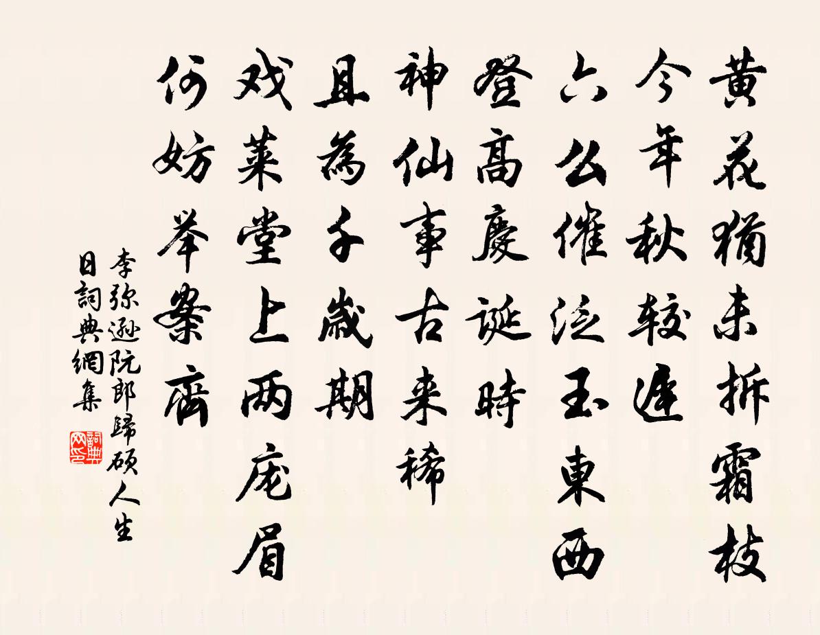 詩詞名句歷史字典書法欣賞書法字典國語詞典說文解字康熙字典古漢語字典標 題 作 者 詩 句 阮郎歸(碩人生日)作者:李彌遜 朝代:宋代阮郎歸(碩人生日)原文黃花猶未拆霜枝。今年秋較遲。六么催泛玉東西。登高慶誕時。神仙事,古來稀。且為千歲期。戲萊堂上兩龐眉。何妨舉案齊。詩詞問答問:阮郎歸(碩人生日)的作者是誰?答:李彌遜問:阮郎歸(碩人生日)寫於哪個朝代?答:宋代問:阮郎歸(碩人生日)是什麼體裁?答:詞李彌遜阮郎歸(碩人生日)書法欣賞阮郎歸(碩人生日)書法作品詩詞推薦安期生蘇軾〔宋代〕安期本策士,平日交蒯通。嘗乾重瞳子,不見隆準公。應如魯仲連,抵掌吐長虹。難堪踞床洗,寧挹扛鼎雄。事既客去劉翰〔宋代〕送客歸來月滿檐,梅花微笑隔疏簾。酒醒今夜銀屏冷,沉水薰爐旋旋添。金人捧露盤(丙午錢塘)羅志仁〔宋代〕濕苔青,妖血碧,壞垣紅。怕精靈、來往相逢。荒煙瓦礫,寶釵零亂隱鸞龍。吳峰越巘,翠顰鎖、苦為誰容。浮屠偈頌六十五首釋普濟〔宋代〕擊鼓升堂,不談世法。冬至月頭,賣被買牛。冬至月尾,賣牛買被。過高台寺張栻〔宋代〕著屋懸崖畔,開窗疊嶂秋。半欹雲榭冷,不斷石泉流。茗碗味能永,竹風聲更幽。平生版庵老,得句似此情。蝶戀花王安中〔宋代〕巧剪明霞成片片。欲笑還顰,金蕊依稀見。拾翠人寒妝易淺。濃香別注唇膏點。竹雀喧喧煙岫遠。晚色溟濛,六出游道場山何山蘇軾〔宋代〕道場山頂何山麓,上徹雲峰下幽谷。我從山水窟中來,尚愛此山看不足。陂湖行盡白漫漫,青山忽作龍蛇盤。山高今旦張耒〔宋代〕今旦寒氣至,晨坐進一杯。一杯未能已,三酌道空罍。我有胸臆事,欲言誰使陪。往往中夜嘆,鬱結無由開。賴此剡縣解雨五龍潭等處送神辭陳著〔宋代〕稼如茨兮黍與粳,十日不雨兮彼蒼。御龍君兮徼祥,環嵊之土兮雨其滂。焦捲髮秀兮搖晚涼,田水泱泱兮秋風香。初到郡齋三首宋祁〔宋代〕我里誠雲樂,公今況釋勞。秋蒪不下豉,霜蟹恣持螯。林靜來晨燎,江喧入夜濤。功成奮嘉藻,寧欲傍離騷。宣仁聖烈皇后輓辭五首蘇頌〔宋代〕辰極閟軒輝,天人覆玉衣。兩朝臨大寶,九載運璇璣。永巷私門絕,通閨外族稀。蕃厘崇構閟,應待媼神歸。點絳唇仇遠〔宋代〕千里平闌,水天低處山無數。斷城孤樹。城外人來去。欲問青鸞,杳杳隨煙霧。空懷古。巴山何處。自翦鐙聽雨。司徒工開府韓國富公輓辭四首司馬光〔宋代〕太呂功名重,鴻毛軒冕輕。閒居容愈盛,暫出市皆傾。溟海涵容大,龍門謁見榮。謙光儼在目,慟哭望佳城。縱步過資福寺僧留飲出示淨度文三教一理認經陳文蔚〔宋代〕一編淨度出玄文,因甜書窗醉酒尊。儒釋未須談一二,且於花下立黃昏。點絳唇王之道〔宋代〕珠幰霜蕤,晚來芬馥清香吐。流鶯飛去。應上花梢住。一曲陽春,聊對東風訴。無多語。韶光暗度。恨到分攜處。再賦程公許〔宋代〕物華過眼半黃凋,萬竅號風夜栗憀。一寸古心難石轉,三生妄念易冰消。鉛共汗筆千年夢,白黑文枰幾路饒。勘破寄杜仲觀賀鑄〔宋代〕中春雨收霽,與子登叢台。形勝宛然在,太行西北來。無情百尺土,千載未摧頹。四顧發悲嘯,淒風振頤頦。淩高漁父趙汝回〔宋代〕衡岳早來雨,湘江增綠波。小舟浮似屋,香草結為蓑。水定見魚影,夜清聞櫂歌。悠悠百年夢,醒少醉時多。旅食有作趙蕃〔宋代〕旅食頻年倦,田居樂事遙。春余桑枯靜,波泛鷺鷗驕。折竹深防筍,撐船滿載苗。新詩隨見寫,舊發不勝凋。續薛令之題壁李隆基〔唐代〕啄木觜距長,鳳凰羽毛短。苦嫌松桂寒,任逐桑榆暖。名句推薦聞道皇華使,方隨皂蓋臣。王維《送李判官赴東江》 不畏浮雲遮望眼,只緣身在最高層王安石《登飛來峰》 血染紅箋,淚題錦句。西湖豈憶相思苦。劉將孫《踏莎行·閒遊》 見人惡,即內省。有則改,無加警。李毓秀《弟子規·信》 言不中,行不謹,辱也。王通《中說·卷一·王道篇》 人不見,春在綠蕪中。祖可《小重山·誰向江頭遺恨濃》 薊庭蕭瑟故人稀,何處登高且送歸。王之渙《九日送別》 蘭帳玉人睡覺,怪春衣、雪沾瓊綴。章楶《水龍吟·燕忙鶯懶芳殘》 月兒彎彎照九州,幾家歡樂幾家愁。佚名《月兒彎彎照九州》 己所不欲,勿施於人。孔子弟子《論語·顏淵篇》