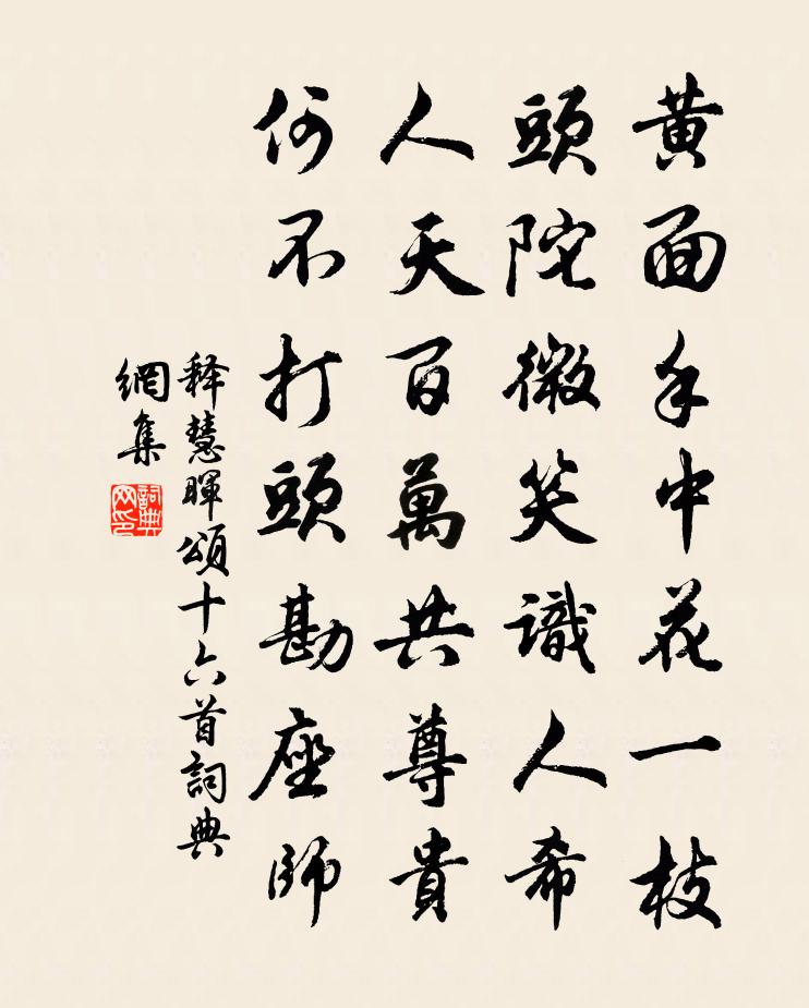 詩詞名句歷史字典書法欣賞書法字典國語詞典說文解字康熙字典古漢語字典標 題 作 者 詩 句 頌十六首作者:釋慧暉 朝代:宋代頌十六首原文黃面手中花一枝,頭陀微笑識人希。人天百萬共尊貴,何不打頭勘座師。詩詞問答問:頌十六首的作者是誰?答:釋慧暉問:頌十六首寫於哪個朝代?答:宋代釋慧暉頌十六首書法欣賞頌十六首書法作品詩詞推薦皇雅十首《西師》六章尹洙〔宋代〕主用西師,岷梁弗賓。匪曰負固,實交晉人。予訓予誓,合我將臣。正厥有罪,無庸傷民。晚望貫休〔唐代〕曠望危橋上,微吟落照前。煙霞濃浸海,川岳闊連天。白鳥格不俗,孤雲態可憐。終期將爾輩,歸去舊江邊。隨邊使過五原儲嗣宗〔唐代〕偶逐星車犯虜塵,故鄉常恐到無因。五原西去陽關廢,日漫平沙不見人。送夢英大師楊徽之〔唐代〕獨攜瓶錫欲春殘,深入終南路屈盤。萬象幽玄吟里見,一心圓寂定中觀。翠微寺在杉松老,紫閣峰高水石寒。莫憑五祖演禪師真贊黃庭堅〔宋代〕問道白雲端,蹋著自家底。無心萬事禪,一月千江水。路逢摩登伽,石上漫澆水。赤土畫簸箕,也有第一義。誰言侯荊曾鞏〔宋代〕侯蠃夷門白髮翁,荊軻易水奇節士。偶邀禮數車上足,暫飽腥羶館中侈。師回拔劍不顧生,酒酣拂衣亦送死。磊落村居即事林尚仁〔宋代〕外事少曾聞,深居似隱君。溪明花照影,風細水行文。蠶室寒初閉,蜂房早已分。偶因尋藥去,踏破一村雲。句劉望之〔宋代〕地連巴楚峰嵐見,節近清明柳色知。新栽葦魏野〔宋代〕臨砌復臨流,栽初尚未稠。長因帶風雨,遠似在汀洲。靜閒宜紅蓼,閒棲稱白鷗。前春應更好,江上夢潛休。上雲樂 方丈曲蕭衍〔南北朝〕方丈上。崚層雲。挹八玉。御三雲。金史教授獨善堂王安石〔宋代〕湖海十年舊,林塘三畝余。靜非談者隱,貧勝富人居。列鼎亦何有,幅巾聊自如。猶應不獨善,學子滿階除。絕句陳師道〔宋代〕斫水水可斷,續弦弦可完。如何鄭公客,不作百年看。幽窗韓偓〔唐代〕刺繡非無暇,幽窗自鮮歡。手香江橘嫩,齒軟越梅酸。密約臨行怯,私書欲報難。無憑諳鵲語,猶得暫心寬。連雨坐湖莊曹彥約〔宋代〕泥濘政如許,出門安所之。龍公無倦日,老子有閒時。適意家常酒,忘懷獨自棋。困來饒一睡,百慮本何思。送陳行之寺丞守南劍二首楊萬里〔宋代〕我召公先倒,公歸我亦行。三年如夢爾,一笑可憐生。野店綠山去,春風並轡輕。先愁饒水上,話別若為情。己卯十月一日至燕越五日罹狴犴有感而賦文天祥〔宋代〕心期耿耿浮雲上,身事悠悠落日西。千古興亡何限錯,百年生死本來齊。沙邊莫待哀黃鵠,雪裡何須問牧羝。此處欽慈皇后輓詞二首張耒〔宋代〕淑德承明舊,徽音固有來。據龍符聖嗣,合劍會軒台。玉冷衣銷馥,鸞昏鏡集埃。傷心國西道,寂寞送車回。三高祠劉寅〔宋代〕人謂吳痴信不虛,建崇越相果何如。千年亡國無窮恨,只合江邊祀子胥。不恨方回〔宋代〕鼓腹千年有,平心一物無。粗能全晚節,不敢恨窮途。豈少真君子,何求老腐儒。春風香百劃,千丈古松枯。送職方張員外領荊湖北漕宋庠〔宋代〕粉闥仙郎鬢未秋,懿文精力允僉求。新榮毫忌祠神館,更按喬卿露冕州。楚匭貢茅紛騎置,蜀艘移粟蔽江流。富人名句推薦回鞭指長安,西日落秦關。李白《登敬亭北二小山余時送客逢崔侍御並登此地》 一場幽夢同誰近,千古情人獨我痴。曹雪芹《紅樓夢·第五回》 山泉散漫繞階流,萬樹桃花映小樓。元稹《離思五首》 賭近盜,淫近殺。馮夢龍《警世通言·卷三十五》 香餌之下,必有懸魚;重賞之下,必有死夫。黃石公《三略·上略》 得其所利,必慮其所害;樂其所成,必顧其所敗。劉向《說苑·敬慎》 過春風十里,盡薺麥青青。姜夔《揚州慢·淮左名都》 叢菊兩開他日淚,孤舟一系故園心。杜甫《秋興八首·其一》 舊時王謝堂前燕,飛入尋常百姓家。劉禹錫《烏衣巷》 湖闊兼雲霧,樓孤屬晚晴。杜甫《陪裴使君登岳陽樓》