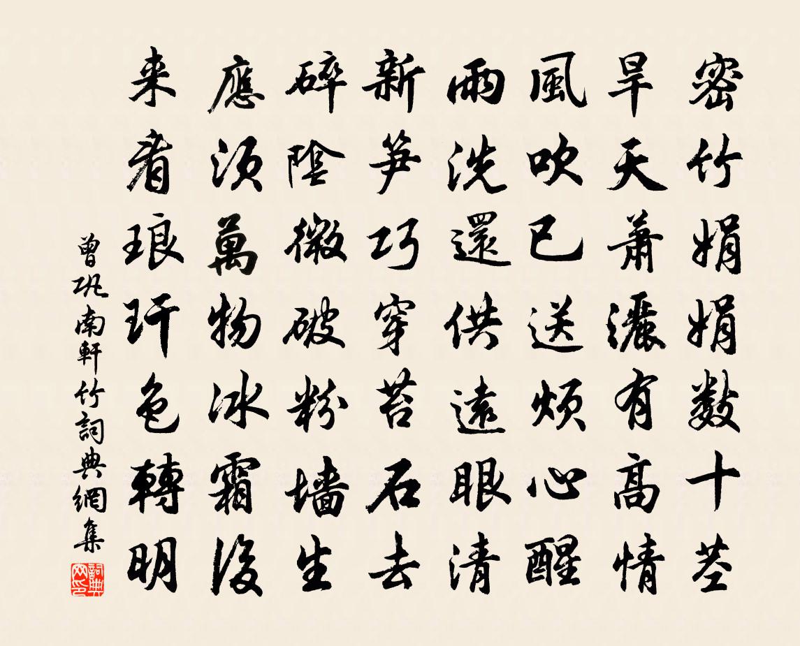 詩詞名句歷史字典書法欣賞書法字典國語詞典說文解字康熙字典古漢語字典標 題 作 者 詩 句 南軒竹作者:曾鞏 朝代:宋代南軒竹原文密竹娟娟數十莖,旱天蕭灑有高情。風吹已送煩心醒,雨洗還供遠眼清。新筍巧穿苔石去,碎陰微破粉牆生。應須萬物冰霜後,來看琅玕色轉明。詩詞問答問:南軒竹的作者是誰?答:曾鞏問:南軒竹寫於哪個朝代?答:宋代曾鞏南軒竹書法欣賞南軒竹書法作品詩詞推薦鷓鴣天元好問〔金代〕短髮如霜久已拚。無冠可掛更須彈。初聞古寺多倀鬼,又說層冰有熱官。閒處坐,靜中看。時情天意酒杯乾。籬邊漁家傲歐陽修〔宋代〕八月微涼生枕簟。金盤露洗秋光淡。池上月華開寶鑑。波瀲灩。故人千里應憑檻。蟬樹無情風苒苒。燕歸碧海珠簾感舊寇準〔宋代〕長思密勿侍甘泉,丹地翱翔獨少年。重到文昌倍惆悵,秋風霜鬢共蕭然。同王稚川晏叔原飯寂照房黃庭堅〔宋代〕高人住寶坊,重客款齋房。市聲猶在耳,靜虛生白光。幽子遺淡墨,窗間見瀟湘。蒹葭落鳧雁,秋色媚橫塘。博山再用前韻趙善括〔宋代〕我是忘機士,初非學二疏。瓮醅常得醉,瓶粟任無餘。天下眾生病,山中四壁虛。昔年芻豢口,今日伴鍾魚。橫吹曲辭驄馬(一曰驄馬驅)李群玉〔唐代〕浮云何權奇,絕足勢未知。長嘶青海風,躞蹀振雲絲。由來渥窪種,本是蒼龍兒。穆滿不再活,無人昆閬騎。君識群玉山董居誼〔宋代〕頃看嘗入道山來,天上圖書不受埃。今日有懷群玉府,又從人世得蓬萊。同長安君鍾山望王安石〔宋代〕解裝相值得留連,一望江南萬里天。殘雪離披山韞玉,新陽杳靄草含煙。餘生不足償多病,樂事應須委少年。惟有張滁州輓詞二首方回〔宋代〕上庠同補處,祖父昔通家。書在燈俱續,舟移劍共差。故都箕子麥,晚憶邵平瓜。五福公無恨,吾生自可嗟。多景樓吳錫疇〔宋代〕欄乾投北是神州,莫怪諸公怯上樓。千載潮聲如有恨,猶能含怒到瓜洲。孫莘老報狀帖贊岳珂〔宋代〕遺墨之四行,煜其如晨星之爛。是曰元佑之名臣,所當考而申之以贊。朝中措(人日蟆頤席間和韻)李壁〔宋代〕東風歌吹髮重闉。飛旆入山新。小雨不妨酥潤,江頭一併霜晴。年年心似,輸他釵燕,蟠帶迎春。怎得尊前避酒,送鄭太保瀛州都監梅堯臣〔宋代〕秋氣入關河,匈奴久已和。琱弓聊可試,寶劍不須磨。草木將搖落,牛羊自寢訛。能知塞垣景,持以贈吾歌。送李著作知柳州李覯〔宋代〕到官十五月,太半在他邦。惠術示施一,公心無與雙。剖符新使粵,盡室始浮江。地理將分嶺,行程即下瀧。旅愁滿庭芳佚名〔宋代〕桐葉霜乾,蘆花風軟,曉來一色新秋。碧光無際,良夜月明樓。瑞應長庚入夢,鍾奇秀、特產賢侯。堪夸處,雄姿攀鞍態/迎春樂賀鑄〔宋代〕逢迎一笑金難買。小櫻唇、淺蛾黛。玉環風調依然在。想花下、攀鞍態。佇倚碧雲如有待。望新月、為誰雙拜。細游應聖宮余靖〔宋代〕驅羸遠遠出嚴闉,雲構祠宮絕世塵。伴鶴不知龜甲子,斸山多見藥君臣。雨昏仙穴丹砂井,雲映樓居玉洞人。只待南鄉子·生甲更生庚蕭廷之〔宋代〕生甲更生庚。此是丹頭切要明。藥嫩采來歸土釜,煎烹。文武剛柔次第行。片餉結丹成。沐浴防危更守城。到此不示二子歐陽鈇〔宋代〕先君以官貧,我仍遺以安。但願兩兒健,扶持一翁孱。何須待門生,悠然柴桑閒。採桑子 書博山道中壁辛棄疾〔宋代〕煙迷露麥荒池柳,洗雨烘晴。洗雨烘晴,一樣春風幾樣青。提壺脫褲催歸去,萬恨千情。萬恨千情,各自無聊各自名句推薦悲霜雪之俱下兮,聽潮水之相擊。屈原《九章》 山遠翠眉長。高處淒涼。菊花清瘦杜秋娘。吳文英《浪淘沙·九日從吳見山覓酒》 柳條將舒未舒,柔梢披風,麥田淺鬣寸許。袁宏道《滿井遊記》 一日不思量,也攢眉千度。柳永《晝夜樂·洞房記得初相遇》 粉墮百花洲,香殘燕子樓。曹雪芹《唐多令·柳絮》 烽火城西百尺樓,黃昏獨上海風秋。王昌齡《從軍行七首》 浮雲終日行,遊子久不至。杜甫《夢李白二首·其二》 君子以遠小人,不惡而嚴。佚名《易傳·象傳下·遯》 江水三千里,家書十五行。袁凱《京師得家書》 食之以時,用之以禮。孟子《孟子·盡心章句上·第二十三節》
