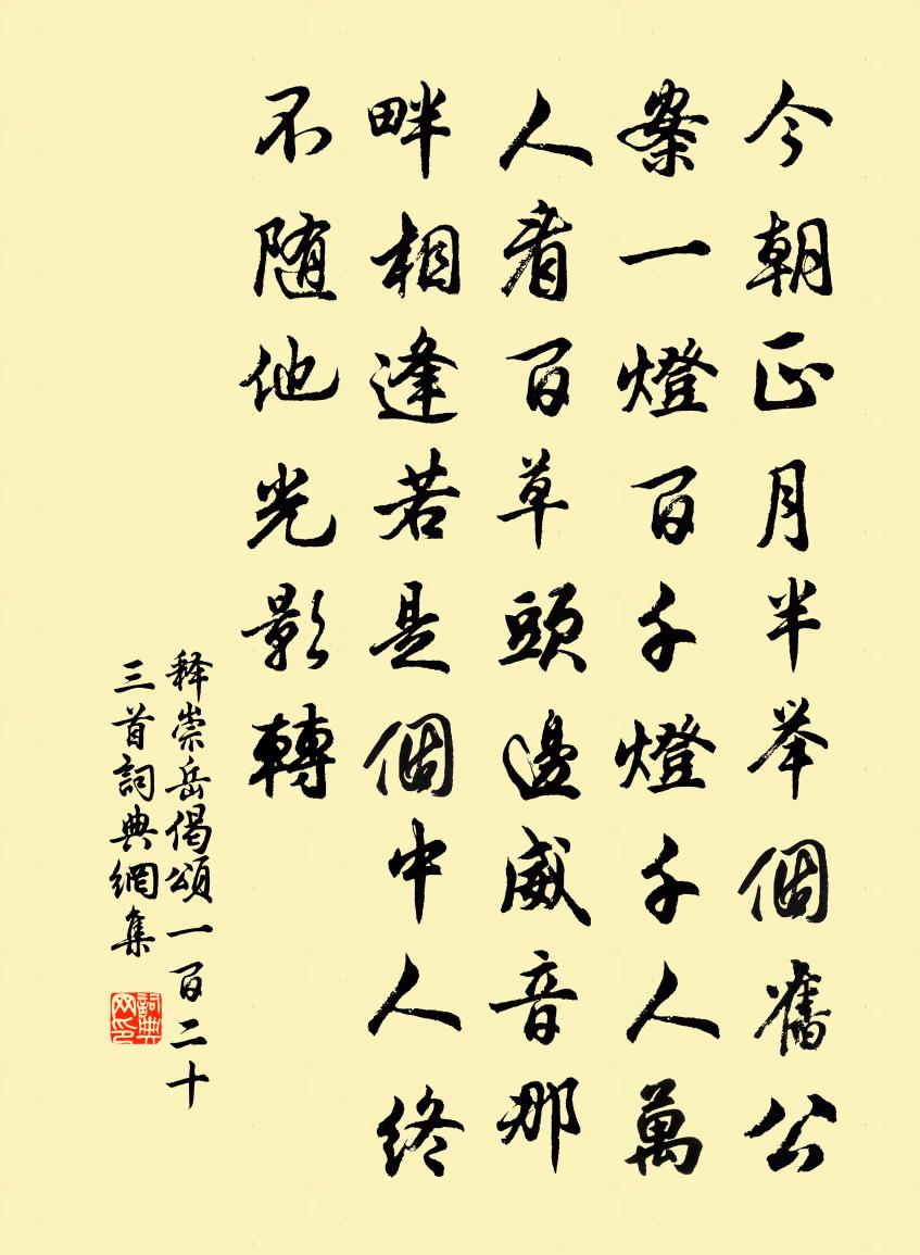 詩詞名句歷史字典書法欣賞書法字典國語詞典說文解字康熙字典古漢語字典標 題 作 者 詩 句 偈頌一百二十三首作者:釋崇岳 朝代:宋代偈頌一百二十三首原文今朝正月半,舉箇舊公案。一燈百千燈,千人萬人看。百草頭邊,威音那畔。相逢若是箇中人,終不隨他光影轉。詩詞問答問:偈頌一百二十三首的作者是誰?答:釋崇岳問:偈頌一百二十三首寫於哪個朝代?答:宋代釋崇岳偈頌一百二十三首書法欣賞偈頌一百二十三首書法作品詩詞推薦喜歲豐姜特立〔宋代〕六月禾將槁,天公一雨蘇。旱時苗化草,稔後米如珠。食足安田裡,年飢死路衢。豐凶才反手,捫腹愧微軀。示葛都院釋崇岳〔宋代〕從來佛法無多子,利益人天越古今。棒喝交馳難近傍,信知徹底老婆心。再次韻寄朱希真二首張嵲〔宋代〕初喜花明炬,還愁柳墮綿。時須杯里物,聊費杖頭錢。天上足官府,人間有地仙。卻慚營道嬾,渾似逆風船。漁家傲歐陽玄〔元代〕三月都城游賞競。宮牆官柳青相映。十一門頭車馬迸。清明近。豪家寒具金盤*。*祭流連芳草徑。歸來風送梨花後江行十絕岳珂〔宋代〕叫著漁郎急掉頭,一聲別浦聽蓮謳。山遙水遠應同趣,我亦青簾問酒樓。妄想劉克莊〔宋代〕妄想如冰已盡消,朱顏日向鏡中凋。玉關萬里曾投筆,草市三家卻負樵。弱水古來無路到,小山歲晚有人招。吾廬除夜寄盧菊磵劉過〔宋代〕見說盧夫子,詩成手自書。雪便金帳暖,雲蔭玉山居。椒葉儲名酒,萍虀薦野蔬。夜寒裩犢鼻,應念馬相如。秋夜風雨次韻陳某〔宋代〕獨臥苦不寐,燈殘知夜深。青氈猶是客,白髮最關心。繞屋鳥三匝,隔江龍一吟。誰家催寄遠,孤淚滴清砧。浣溪沙蘇軾〔宋代〕覆塊青青麥未蘇。江南雲葉暗隨車。臨皋煙景世間無。雨腳半收檐斷線,雪林初下瓦疏珠。歸來冰顆亂黏須。竹外海棠衛宗武〔宋代〕我有三徑園,今為牛馬皂。傍家尋丈地,昔未長荼蓼。琅玕數十挺,新培歲可考。幻出一庭陰,咫尺成深窈。客來和韋開州盛山十二首。上士泉瓶張籍〔唐代〕階上一眼泉,四邊青石甃。唯有護淨僧,添瓶將盥漱。新昌石佛樓鑰〔宋代〕費盡三生心與力,造成石像一百尺。相好端嚴具足尊,五彩黃金妙裝飾。道不是佛卻不得,若道便是也不得。上盡范才元道中雜興張元乾〔宋代〕遐想吳門人姓梅,高蹤千古共徘徊。橘中儻有商山樂,不必朝僧問劫灰。晝倦楊萬里〔宋代〕睡眼蒙松倦日長,卻拋詩卷步迴廊。狸奴桑自雙雙戲,忽見人來走似獐。夢得前所酬篇有煉盡美少年之句因思往事…以長句答之白居易〔唐代〕煉盡少年成白首,憶初相識到今朝。昔饒春桂長先折,今伴寒松取後凋。生事縱貧猶可過,風情雖老未全銷。聲華出橫山江口楊萬里〔宋代〕白壁當江岸,青旗定酒家。斷崖侵屋窄,細路入門斜。縣近瞻雙塔,洲橫隔一沙。何須後來客,始信此詩嘉。游都梁趙某〔宋代〕才入都梁郡,愁登第一山。不堪高處望,未得故疆還。漁父詞趙孟頫〔元代〕渺渺煙波一葉舟。西風落木五湖秋。盟鷗鷺,傲王侯。管甚鱸魚不上鐵如意謝翱〔宋代〕仙客五六人,月下斗婆娑。散影若雲霧,遺音杳江河。其一起楚舞,一起作楚歌。雙執鐵如意,擊碎珊瑚柯。一人村興陸游〔宋代〕身老交情見,孫生口數添。園丁上牛米,村婢博蠶鹽。粔籹堆盤白,鋹餭出釜甜。閉門君勿誚,衰病正相兼。名句推薦楓林凋翠,寒雁聲悲。趙長卿《柳梢青·過何郎石見早梅》 邊兵春盡回,獨上單于台。張蠙《登單于台》 安危在出令,存亡在所任。司馬遷《史記·楚元王世家》 西湖又還春晚,水樹亂鶯啼。仲殊《訴衷情·寶月山作》 自笑好山如好色,只今懷樹更懷人。閒愁閒恨一番新。辛棄疾《浣溪沙·偕叔高子似宿山寺戲作》 見而不見,聞而不聞,知而不知。韓非及後人《韓非子·主道》 以陽求陰,苞以德也;以陰結陽,施以力也。王詡《鬼谷子·捭闔》 名花傾國兩相歡,常得君王帶笑看。李白《清平調·名花傾國兩相歡》 女蘿發馨香,菟絲斷人腸。李白《古意》 風無纖埃,雨無微津。左思《三都賦》