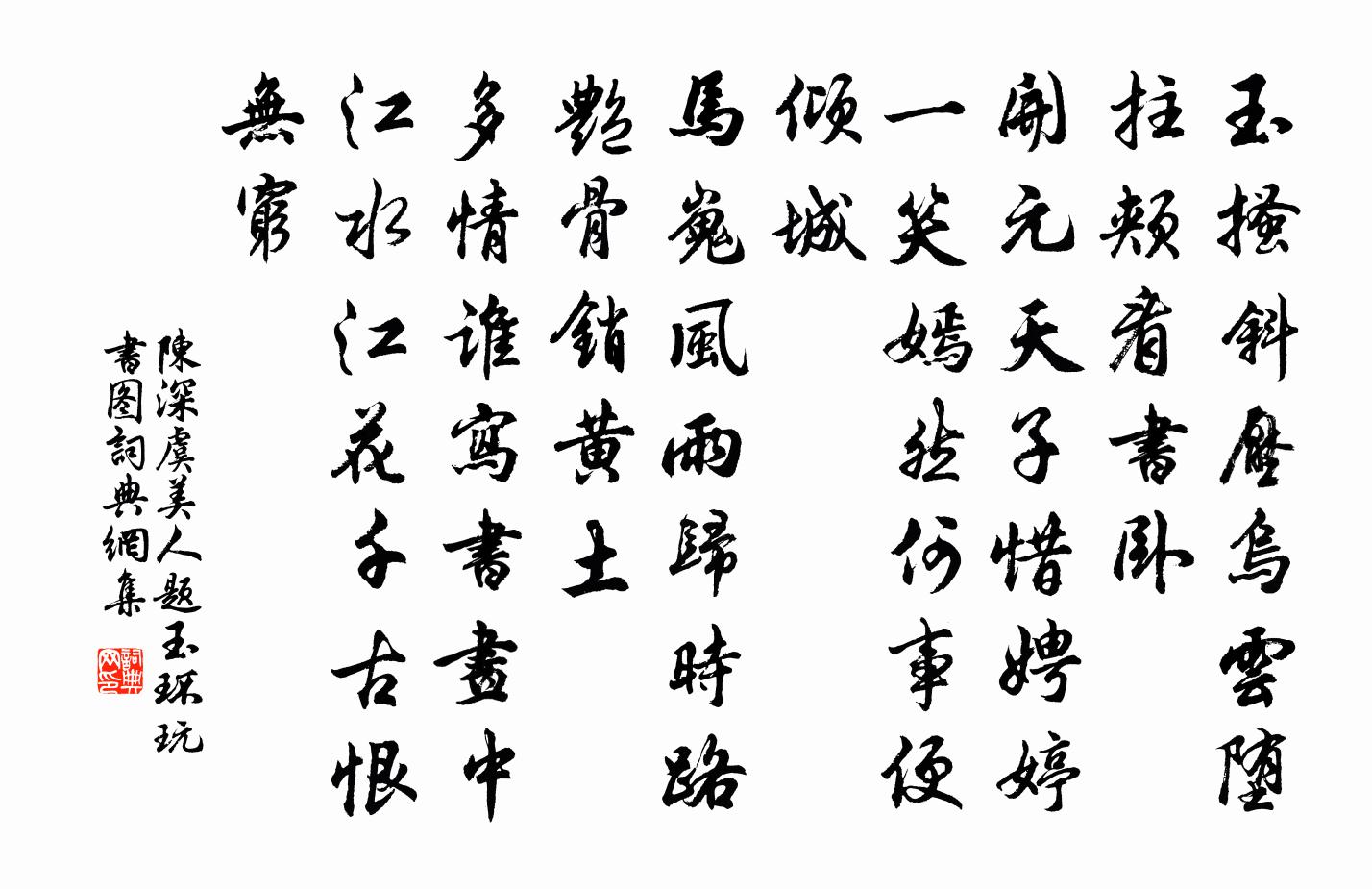 詩詞名句歷史字典書法欣賞書法字典國語詞典說文解字康熙字典古漢語字典標 題 作 者 詩 句 虞美人(題玉環玩書圖)作者:陳深 朝代:宋代虞美人(題玉環玩書圖)原文玉搔斜壓烏雲墮。拄頰看書臥。開元天子惜娉婷。一笑嫣然何事、便傾城。馬嵬風雨歸時路。艷骨銷黃土。多情誰寫書畫中。江水江花千古、恨無窮。詩詞問答問:虞美人(題玉環玩書圖)的作者是誰?答:陳深問:虞美人(題玉環玩書圖)寫於哪個朝代?答:宋代問:虞美人(題玉環玩書圖)是什麼體裁?答:詞陳深虞美人(題玉環玩書圖)書法欣賞虞美人(題玉環玩書圖)書法作品詩詞推薦薌林五十詠泛宅楊萬里〔宋代〕猶道山中淺,仍移水上居。俗人又剝啄,掉入白芙蕖。以坡公君如大江日千里我如此水千山底為韻作趙蕃〔宋代〕游從二年中,離闊三百日。政自跡如疏,不妨心故密。暑中閒詠六首方回〔宋代〕驚奔萬馬屯,豈料此身存。長日唯三飯,閒時或一樽。泉深添井索,果熟閉園門。老病更炎熱,收心此避喧。小樓雨中高翥〔宋代〕雲浮江雨暗,獨客苦淹留。白髮羞明鏡,青山對小樓。酒功書下下,心事付悠悠。安得并州翦,從頭翦斷愁。婺源道中方回〔宋代〕盤山莫訝去程賒,風俗真淳尚可嘉。行客門前方下馬,主人店裡已烹茶。百泉怒噴常疑雨,萬木陰森不見花。倚杖王氏碧雞園六詠鈍庵王灼〔宋代〕俗子如錐利,達士如椎鈍。乘除付造物,多智反自困。君看庵中翁,漫浪出方寸。臥聽松聲老,行觸蘭芳嫩。謀身南歌子(早春)趙長卿〔宋代〕春色烘衣暖,宮梅破鼻香。盡驅和氣入蘭堂。又是輕雲微雨、下巫陽。酒帶歡情重,醺醺氣味長。晚來拂拭略梳妝紅樓夢曲-留餘慶曹雪芹〔清代〕留餘慶,留餘慶,忽遇恩人,幸娘親,幸娘親,積得陰功。勸人生,濟困扶窮,休似俺那愛銀錢、忘骨肉的狠舅奸無可奈何歌白居易〔唐代〕無可奈何兮,白日走而朱顏頹。少日往而老日催,生者不住兮死者不回。況乎寵辱豐悴之外物,又何常不十去而一謝何學士王專推官王道士同見訪魏野〔宋代〕閒離錦帳帶紗巾,誰從東郊訪隱淪。舊在幕在珠履客,新游門下羽衣人。掃苔雖是開三徑,采蕨何繇致八珍。太史念奴嬌鄭域〔宋代〕東陵美景,有輕煙和月,斜風吹雨。一體龍鬚隨地轉,不學松蘿兒女。結就員青,收來掌握,猶帶金盤露。拍浮金和王微之登高齋三首王安石〔宋代〕六朝人物隨煙埃,金輿玉幾安在哉。鍾山石城已寂寞,只見江水雲端來。百年故老有存者,尚憶世宗初伐淮。魏王偈頌二十五首釋如淨〔宋代〕天童大解脫門豁開。衲僧自已透,乾坤無表里。萬里清風八面來,前樓後閣玲瓏起。寄劉與權與幾吳芾〔宋代〕君在桃源山下居,我家相距百里余。神仙襟韻固異稟,草木臭味曾不殊。一日京華定交契,十年太學論詩書。斷金照講師贊釋大觀〔宋代〕口哆眉厖,坐如釘椿。戒香逆風,孤行凌霜。一新受經重其本,三主法社持其綱。此其所以發毫端毗尼藏,而樹末金剛隨機無盡頌一相無相分第九釋印肅〔宋代〕離欲心無苦,藥病皆拈卻。眼耳有觀音,豈用安手腳。自題墨竹劉延世〔宋代〕酷愛此君心,常將墨點真。毫端雖在手,難寫淡精神。皇太后閣六首蘇軾〔宋代〕秘殿扶疏夏木深,雨余初有一蟬吟。應將嬴女乘鸞扇,更助南風長棘心。疇依王柏〔宋代〕流澤未遠,口耳復迷。纂組斷碎,倚托媚時。大本斲喪,擾擾胡為。淵源微矣,予將疇衣。浴日亭一首劉克莊〔宋代〕歸客飄然一葉身,尚能飛屐陟嶙峋。危亭下瞰嵎夷宅,積水上通河漢津。叱馭為臣前有志,乘桴從我更無人。暮年名句推薦萬樹寒無色,南枝獨有花。道源《早梅》 樸實渾厚,初無甚奇,然培子孫之元氣者,必此人也。王永彬《圍爐夜話·第十九則》 五更鼓角聲悲壯,三峽星河影動搖。杜甫《閣夜》 寒食不多時,牡丹初賣。晁沖之《感皇恩·寒食不多時》 辭多類非而是,多類是而非。是非之經,不可不分。呂不韋《呂氏春秋·論·慎行論》 萬里橋西一草堂,百花潭水即滄浪。杜甫《狂夫》 今士之用身,不若商人之用一布之慎也。墨子《墨子·47章 貴義》 鎖離愁,連綿無際,來時陌上初熏。韓縝《鳳簫吟·鎖離愁》 瘦雪一痕牆角,青子已妝殘萼。王庭筠《謁金門·雙喜鵲》 去年花里逢君別,今日花開已一年。韋應物《寄李儋元錫》