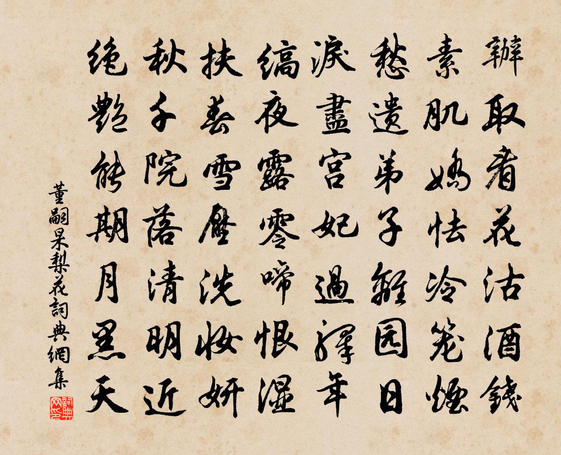 詩詞名句歷史字典書法欣賞書法字典國語詞典說文解字康熙字典古漢語字典標 題 作 者 詩 句 梨花作者:董嗣杲 朝代:宋代梨花原文辦取看花沽酒錢,素肌嬌怯冷籠煙。愁遺弟子離園日,淚盡宮妃過驛年。縞夜露零啼恨濕,扶春雪壓洗妝妍。鞦韆院落清明近,絕艷能期月黑天。詩詞問答問:梨花的作者是誰?答:董嗣杲問:梨花寫於哪個朝代?答:宋代董嗣杲梨花書法欣賞梨花書法作品詩詞推薦和陶飲酒二十首蘇軾〔宋代〕我不如陶生,世事 * 之。云何得一適,亦有如生時。寸田無荊棘,佳處正在茲。縱心與事往,所遇無復疑。偶得奉和幸安樂公主山莊應制李迥秀〔唐代〕詰旦重門聞警蹕,傳言太主奏山林。是日回輿羅萬騎,此時歡喜賜千金。鷺羽鳳簫參樂曲,荻園竹徑接帷陰。手舞酬皇甫賓客白居易〔唐代〕閒官兼慢使,著處易停輪。況欲逢新歲,仍初見故人。冒寒尋到洛,待暖始歸秦。亦擬同攜手,城東略看春。題趙伯駒團扇月宮圖冊宋高宗〔宋代〕清涼境界火雲藏,但覺仙家日更長。千歲壽松誰宴坐,星君午夜吐光芒。早發湘中楊憑〔唐代〕按節鳴笳中貴催,紅旌白旆滿船開。迎愁湓浦登城望,西見荊門積水來。還珠洞方信孺〔宋代〕歸舟多載小江春,重訪東岩舊屐痕。插水峭崖猶有路,垂天怪石本無根。金華仙伯真知已,薏苡將軍足斷魂。安得【正宮】塞鴻秋_春來時綽然張養浩〔元代〕春來時綽然亭香雪梨花會,夏來時綽然亭雲錦荷花會,秋來時綽然亭霜露黃花會,冬來時綽然亭風月梅花會。春夏酹江月(南康軍和蘇韻)文天祥〔宋代〕廬山依舊,淒涼處、無限江南風物。空翠晴嵐浮汗漫,還障天東半壁。雁過孤峰,猿歸危嶂,風急波翻雪。乾坤未湖州歌九十八首 其六十六汪元量〔宋代〕長蘆轉柁是通津,儘是東西南北人。日暮煙花簫鼓鬧,紅樓爛醉楚州春。江村陳允平〔宋代〕草舍蔬畦繞,柴門竹逕通。斷雲遮落日。細雨濕斜風。野艾抽花碧,山茄帶葉紅。煙深南浦遠,難認楚江楓。效孟浩然體寄呈邦憲明府吳頤〔宋代〕繆致棲鸞嘆,頻煩薦鶚書。未能拋斗米,豈不愛吾廬。與世多乖迕,論才信闊疏。故人應笑我,早晚遂歸歟。詠瓢張說〔唐代〕美酒酌懸瓢,真淳好相映。蝸房卷墮首,鶴頸抽長柄。雅色素而黃,虛心輕且勁。豈無雕刻者,貴此成天性。飲馬長城窟沈約〔南北朝〕介馬渡龍堆。塗縈馬屢回。前訪昌海驛。 * 宼輪台。旌幕捲菸雨。徒御犯冰埃。念奴嬌蔡伸〔宋代〕歲華晼晚,念羈懷多感,佳會難卜。草草杯盤聊話舊,同剪西窗寒燭。翠袖籠香,雙蛾斂恨,低按新翻曲。無情風惠山煎茶釋智朋〔宋代〕瓦瓶破曉汲清泠,石鼎移來壞砌烹。萬壑松風供一啜,自籠雙袖水邊行。壬子九日與群從子侄登烏石山用樊川韻劉克莊〔宋代〕垂髫登巘捷于飛,歲晚重來腳力微。壹死壹生群從少,某丘某水幾人歸。即今秉燭游清夜,自古無繩擊夕暉。莫憶天游觀陳元英〔宋代〕琅玕瑤草滿空山,月上丹台鶴未還。夜入瓊樓襟袖冷,始知身在白雲間。雨中花/夜行船晁端禮〔宋代〕小小中庭,深深洞戶,誰人笑里相迎。有三年窺宋,一顧傾城。舞態方濃,簫聲未闋,又黯離情。怎奈向,贏得多感事朱槔〔宋代〕大弓竅陽氏,神鼎淪泗淵。何須識微士,周魯必不全。武庫一朝火,斬蛇逐飛煙。傷心睨前事,氐虜定紛然。夜聞歌者 宿鄂州。白居易〔唐代〕夜泊鸚鵡洲,秋江月澄澈。鄰船有歌者,發調堪愁絕。歌罷繼以泣,泣聲通復咽。尋聲見其人,有婦顏如雪。獨倚名句推薦百星之明不如一月之光,十牖之開,不如一戶之明。劉安及其門客《淮南子·說林訓》 此時瞻白兔,直欲數秋毫。杜甫《八月十五夜月二首》 今日漢宮人,明朝胡地妾。李白《王昭君二首》 風雨如晦,雞鳴不已。佚名《風雨》 女兒年幾十五六,窈窕無雙顏如玉。蕭衍《東飛伯勞歌》 福善之門莫美於和睦,患咎之首莫大於內離。班固《漢書·傳·宣元六王傳》 忽聞歌古調,歸思欲沾巾。杜審言《和晉陵陸丞早春遊望》 月兒彎彎照九州,幾家歡樂幾家愁。佚名《月兒彎彎照九州》 芙蓉金菊斗馨香。天氣欲重陽。晏殊《訴衷情·芙蓉金菊斗馨香》 此心終合雪,去已莫思量。虛中《送遷客》