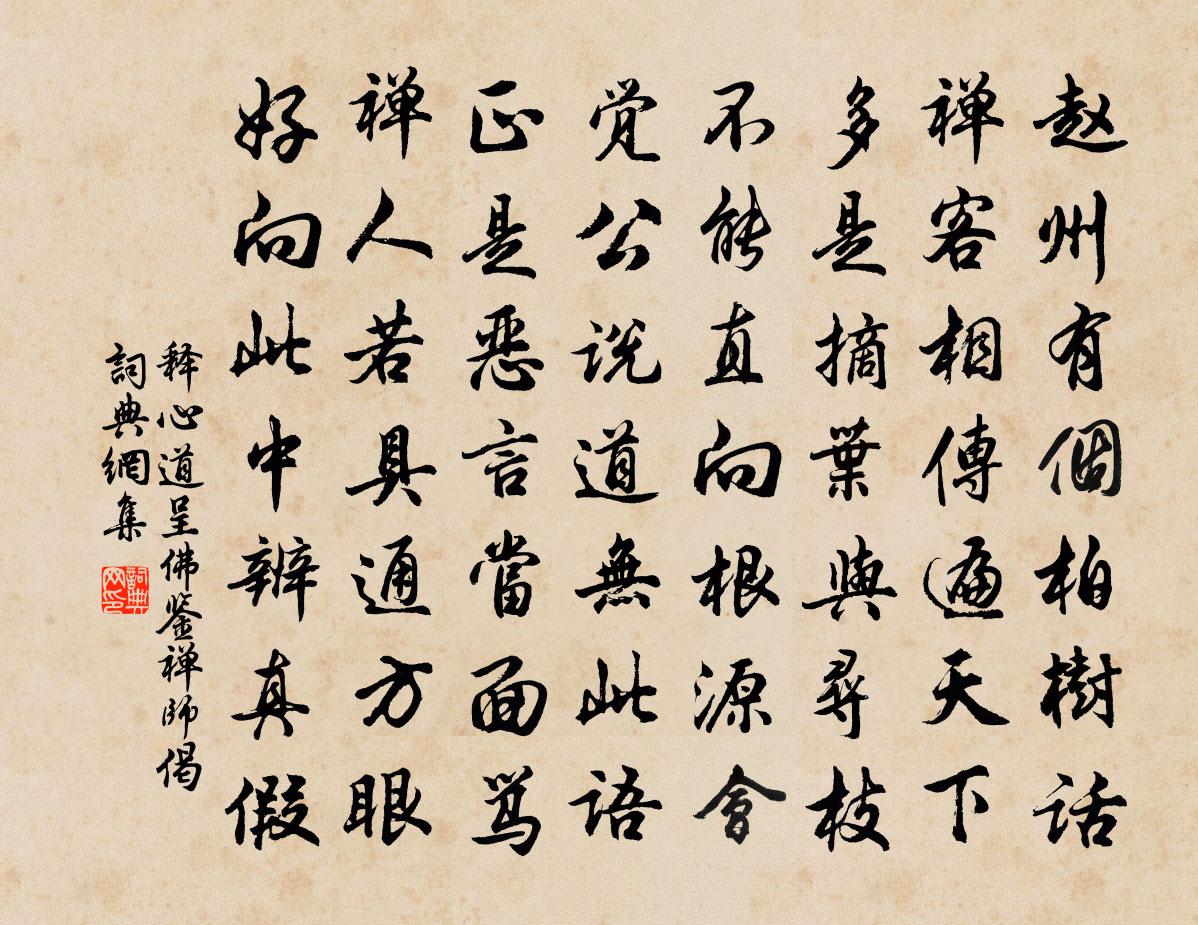 詩詞名句歷史字典書法欣賞書法字典國語詞典說文解字康熙字典古漢語字典標 題 作 者 詩 句 呈佛鑒禪師偈作者:釋心道 朝代:宋代呈佛鑒禪師偈原文趙州有個柏樹話,禪客相傳遍天下。多是摘葉與尋枝,不能直向根源會。覺公說道無此語,正是惡言當面罵。禪人若具通方眼,好向此中辨真假。詩詞問答問:呈佛鑒禪師偈的作者是誰?答:釋心道問:呈佛鑒禪師偈寫於哪個朝代?答:宋代釋心道呈佛鑒禪師偈書法欣賞呈佛鑒禪師偈書法作品詩詞推薦和劉編修潛夫讀近報蔣峴被逐二首王邁〔宋代〕讀報欣然共賦詩,古來忠佞各殊岐。彼猶愧見蔣穎叔,君盍自期劉器之。惡草剪除雖一快,芳蘭銷歇已多時。懷哉和道士陳天隱謝枋得〔宋代〕學道無魔道不成,神人得計是無名。光風自覺長瀟灑,明月何曾有死生。早悟梅山難養性,何如福地別尋盟。梅花縱茟一首劉克莊〔宋代〕不與人爭鹿,常留客膾鯨。遍參埋雪立,輕舉御風行。鳴止三千歲,游觀數十城。前篇方出喙,又報後篇成。贈林處士逋潘閬〔宋代〕雲翦烏妙霧翦衣,存神養氣語還稀。人人盡喚孫思邈,只恐身輕白日飛。平陰夏日作張祜〔唐代〕西來漸覺細塵紅,擾擾舟車路向東。可惜夏天明月夜,土山前面障南風。陳丞相燕息園梅堯臣〔宋代〕少仕既勤勞,暮節念君息。小車辭漢庭,緇衣賦衛國。廣園樹佳木,鳴鳥來野色。京水魚可緡,東陂雁可弋。豈不送文甫兄歸番陽二首馬廷鸞〔宋代〕少小追隨子佩表,如今相視鬢絲橫。式相好矣天倫重,歸去來兮世念輕。目送飛鴻雲縹緲,身憐病鶴影伶仃。聖恩東池詩蘇為〔宋代〕謝塘疏鑿時,滄洲聊可擬。高有智者情,淡如君子旨。秋光夜初永,漁唱幽宜起。白鷺閒不驚,圓荷翠相倚。宛然題畫卷五首范成大〔宋代〕秋晚黃蘆斷岸,江南野水連天。日色微明魚網,鴈飛行人蒼煙。五更仇遠〔宋代〕杭城打六更,市樓已攢點。流年莫催人,老色將冉冉。輕飆羅隱〔唐代〕輕飆掠晚莎,秋物慘關河。戰壘平時少,齋壇上處多。楚雖屈子重,漢亦憶廉頗。不及雲台議,空山老薜蘿。過食新城藕王安石〔宋代〕他年過食新城藕,枕藉船中載親友。今年卻到經行處,獨坐昏煙對舞柳。甘酸向口無所適,牢落盤餐與樽酒。冰房秋曉招隱寺東峰茶宴,送內弟閻伯均歸江州李嘉祐〔唐代〕萬畦新稻傍山村,數里深松到寺門。幸有香茶留稚子,不堪秋草送王孫。煙塵怨別唯愁隔,井邑蕭條誰忍論。莫怪頌古三十八首釋慧方〔宋代〕插鍬叉手異何同,要顯全機立大功。雖然有數通呈了,留得高傳振祖風。正月十九日四更起讀朱文公年譜至天大明賦十方回〔宋代〕草制無知傅伯壽,問詩不答陳傅良。王淮林栗胡紘輩,仲尼日月曾可傷。鵲橋仙(寄朋權)張繼先〔宋代〕神清心妙,山長水遠,有分何年瞻望。晴空一月彩雲飛,又起我、無窮想像。一陽門徑,九華恩露,惟願分明指向逍遙令高道寬〔元代〕君問道,只要穀神通。但把乾坤為鼎器,兩般訊息妙無窮。湛湛越澄清。瑤池客,方外運玄功。放下萬緣都不掛,贈同志釋文珦〔宋代〕我本面無生儔,面涉有乖素麵願。百年面直寄耳,倏忽如過電。猶記學語時,老色遽滿面。富貴非所希,吾道在貧入少密溪沈佺期〔唐代〕雲峰苔壁繞溪斜,江路香風夾岸花。樹密不言通鳥道,雞鳴始覺有人家。人家更在深岩口,澗水周流宅前後。游魚代曾魯仲挽蔣同叔母二首黃榦〔宋代〕不樂何蕃歲一歸,歐陽越客飲京師。腰間未許印如斗,堂上還驚鬢已絲。男子但知三釜計,人生合是百年期。他時名句推薦粉黛暗愁金帶枕,鴛鴦空繞畫羅衣,那堪辜負不思歸!顧敻《浣溪沙·雲淡風高葉亂飛》 相逢不用忙歸去,明日黃花蝶也愁。蘇軾《九日次韻王鞏》 樓前綠暗分攜路,一絲柳、一寸柔情。吳文英《風入松·聽風聽雨過清明》 日出入安窮?時世不與人同。佚名《日出入》 易漲易退山溪水,易反易覆小人心。佚名《增廣賢文·上集》 滿月飛明鏡,歸心折大刀。杜甫《八月十五夜月二首》 少小雖非投筆吏,論功還欲請長纓。祖詠《望薊門》 向來吟秀句,不覺已鳴鴉。韓翃《酬程延秋夜即事見贈》 無有定法如來可說。鳩摩羅什譯《金剛經·無得無說》 文章本天成,妙手偶得之。陸游《文章》