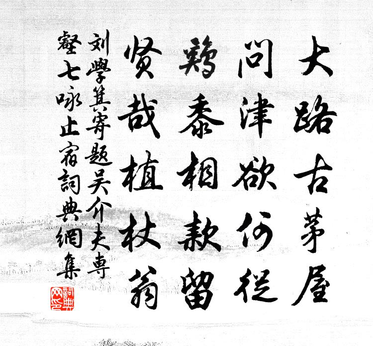 詩詞名句歷史字典書法欣賞書法字典國語詞典說文解字康熙字典古漢語字典標 題 作 者 詩 句 寄題吳介夫專壑七詠止宿作者:劉學箕 朝代:宋代寄題吳介夫專壑七詠止宿原文大路古茅屋,問津欲何從。雞黍相款留,賢哉植杖翁。詩詞問答問:寄題吳介夫專壑七詠止宿的作者是誰?答:劉學箕問:寄題吳介夫專壑七詠止宿寫於哪個朝代?答:宋代劉學箕寄題吳介夫專壑七詠止宿書法欣賞寄題吳介夫專壑七詠止宿書法作品詩詞推薦偶成龍輔〔宋代〕階下莓苔爛熳,牆邊竹色蕭疏。彩鳳繡來有恨,疏鴻讀外無書。閒身釋文珦〔宋代〕閒身出塵表,世鞅詎能絕。真若寒崖松,凌傲幾霜雪。枝葉任生枯,唯自老根節。更有無心雲,油然足怡悅。句王隨〔宋代〕數里竹溪藏野色,一軒松雨戰秋聲。和謝公定征南謠黃庭堅〔宋代〕傳聞交州初陵梁,東連五溪西氐羌。軍行不斷蠻標盾,謀主皆收漢畔亡。合浦譙門腥血沸,看興城下白骨荒。謀臣鄜州進白野鵲薛能〔唐代〕輕毛疊雪翅開霜,紅觜能深練尾長。名應玉符朝北闕,色柔金性瑞西方。不憂雲路填河遠,為對天顏送喜忙。從此贈在己上人韓維〔宋代〕人生天地間,萬物同一理。子今名已是,智要獨在己。乞詩東南歸,固已謝塵滓。東南美林壑,佛剎淨如水。勉當舟中新暑止酒楊萬里〔宋代〕新暑酒不宜,作熱妨夜睡。不如看人飲,亦自有醉意。彼飲吾為咽,所美過於味。同舟笑吾痴,吾不羨渠醉。安知朱氏天和堂趙挺之〔宋代〕華亭山水佳,秀色宛如畫。前賢有隱跡,卜築俟來者。高人養天和。放浪寄林野。安知歲月徂,但喜名利舍。傳家相思會/千年調曹組〔宋代〕人無百年人,剛作千年調。待把門關鐵鑄,鬼見失笑。多愁早老。惹盡閒煩惱。我醒也,枉勞心,謾計較。粗衣淡戲答陳元輿黃庭堅〔宋代〕平生所聞陳汀州,蝗不入境年屢豐。東門拜書始識面,鬢髮幸未成老翁。官饔同盤厭腥膩,茶甌破睡秋堂空。自言金鳳鉤·送春晁補之〔宋代〕春辭我,向何處?怪草草、夜來風雨。一簪華發,少歡饒恨,無計殢春且住。春回常恨尋無路,試向我、小園徐步題山寺井賈島〔唐代〕沈沈百尺余,功就豈斯須。汲早僧出定,鑿新蟲自無。藏源重嶂底,澄翳大空隅。此地如經劫,涼潭會共枯。和魏衍三日二首陳師道〔宋代〕林花女頰紅,春水瓜頭綠。步蹇我三休,來同君一足。苦嗟所歷小,不盡千里目。暮景向昏鴉,歸塗取修竹。行飯至湖桑堰東小市陸游〔宋代〕飽食無營是處游,偶然來到埭東頭。芒鞋也似雙鳧快,漁艇真如一葉浮。樵擔行歌沖暝色,酒旗遮路賣新篘。任朱秋雨歡虞儔〔宋代〕少昊欲行秋,驕陽猶跋扈。炎蒸不易滌,頗費天人雨。浸淫三日霖,雲氣政旁午。所慮早禾傷,佳實臥場圃。翻思寒夜曲朱渙〔宋代〕寒夜夜政長,愁人背燈立。驚風搖竹樹,棲鳥墮復集。山空接響多,室靜虛白入。怊悵不成眠,殘鍾曉邊急。漁家傲(詠魚籃觀音)壽涯禪師〔宋代〕深願弘慈無縫罅。乘時走入眾生界。窈窕丰姿都沒賽。提魚賣。堪笑馬郎來納敗。清冷露濕金襽壞。茜裙不把珠纓挽陳師復寺丞二首劉克莊〔宋代〕歲晚滄洲築草堂,卻將逢掖換軒裳。市朝共嘆鳳高翥,世俗或疑麟不祥。童子舉扶猶忼慨,門人要絰各淒涼。衰殘好事近張先〔宋代〕月色透橫枝,短葉小花無力。北客一聲長笛,怨江南先得。誰教強半臘前開,多情為春憶。留取大家沈醉,正雨休還別業尋龍華山寺廣宣上人段文昌〔唐代〕十里惟聞松桂風,江山忽轉見龍宮。正與休師方話舊,風煙幾度入樓中。名句推薦騁望因高雲外盡,鄉關回首愧煙蘿。石茂華《九月九日登長城關》 佳節久從愁里過,壯心偶傍醉中來。蘇洵《九日和韓魏公》 聖人之救危國也,以忠拂耳。韓非及後人《韓非子·安危》 喧啾百鳥群,忽見孤鳳凰。韓愈《聽穎師彈琴》 立盡黃昏淚幾行,一片鴉啼月。夏完淳《卜運算元·秋色到空閨》 看似尋常最奇崛,成如容易卻艱辛。王安石《題張司業詩》 南軒有孤松,柯葉自綿冪。李白《南軒松》 不怕慢,只怕站。佚名《增廣賢文·下集》 燕子歸來依舊忙。憶君王,月破黃昏人斷腸。謝克家《憶君王·依依宮柳拂宮牆》 蒼蒼竹林寺,杳杳鐘聲晚。劉長卿《送靈澈上人》