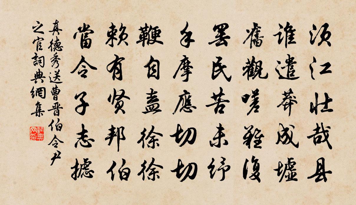 詩詞名句歷史字典書法欣賞書法字典國語詞典說文解字康熙字典古漢語字典標 題 作 者 詩 句 送曹晉伯令尹之官作者:真德秀 朝代:宋代送曹晉伯令尹之官原文須江壯哉縣,誰遣莽成墟。舊觀嗟難復,罷民苦未紓。手摩應切切,鞭自盍徐徐。賴有賢邦伯,當令子志攄。詩詞問答問:送曹晉伯令尹之官的作者是誰?答:真德秀問:送曹晉伯令尹之官寫於哪個朝代?答:宋代真德秀送曹晉伯令尹之官書法欣賞送曹晉伯令尹之官書法作品詩詞推薦與蘇運使詡四首趙蕃〔宋代〕筠陽有賢牧,典選得望郎。漢廷急獻納,使節乃輝光。翰墨一門盛,人才當代良。平生願識面,今日獲升堂。濠州七絕 觀魚台蘇軾〔宋代〕欲將同異較錙銖,肝膽猶能楚越如。若信萬殊歸一理,子今知我我知魚。次韻張中白元日方回〔宋代〕瓣香清曉肅冠紳,戶外遙山展翠顰。瘦影自憐耽醉叟,歡聲何限喜晴人。匆匆節序梅花老,袞袞塵埃世事新。自有題雷公井徐鉉〔唐代〕掩靄愚公谷,蕭廖羽客家。俗人知處所,應為有桃花。九日登玄武山旅眺邵大震〔唐代〕九月九日望遙空,秋水秋天生夕風。寒雁一向南去遠,遊人幾度菊花叢。賜馬廷鸞四首宋理宗〔宋代〕聖烈謨肇我加邦,鉅編詔後總宏綱。立心廣大侔天地,行事明通邁帝王。訓與六經相表裹,法垂萬世愈巍煌。講帷傅商卿借鵝陳造〔宋代〕吾家水豢慣秋春,谷飼欄棲又一新。友義何須換鵝帖,鄰牆防有嗾獒人。眠沙泛渚期它日,問俗充庖戒未仁。酬我山居書事周文璞〔宋代〕荼醾架倒無人架,全似老夫狂醉時。昨夜一場溪雨橫,又漂苔蘚到花枝。念奴嬌 後段第三句少一字佚名〔宋代〕鴛幃睡起,正飛花蘭徑,啼鶯瓊閣。對鏡梳妝,愁見那、怯怯容顏瘦弱。一任仙郎,題詩寄簡,屢訂西廂約。牆花破冢二首王安石〔宋代〕埋沒殘碑草自春,旋風時出地中塵。墦間夜半分珠玉,猶是當時乞祭人。奉和登陝州城樓應制許敬宗〔唐代〕挹河澄綠宇,御溝映朱宮。辰旂翻麗景,星蓋曳雕虹。學嚬齊柳嫩,妍笑發春叢。錦鱗文碧浪,繡羽絢青空。眷念老人村王溉〔宋代〕山前老澤經行路,百歲翁翁猶健步。非仙非佛非鬼神,不識人間鹽與醋。嗜欲既淺亦機深,窟宅宜與仙家鄰。送程給事知越州丁執禮〔宋代〕曉辭龍尾下青冥,持節東南一鎮並。共治蚤分天子寄,暮來今頌里民聲。吟高噸雪誰能擬,韻敵壺冰凜更清。遙想次韻王侍御夜宿高牙喻良能〔宋代〕相別三時久,相望望城賒。攜書期過雁,徙倚至昏鴉。風雨番君國,雲煙夔子家。何時趣歸覲,重許拜高牙。懷元度四首王安石〔宋代〕思君攜手安能得,上畫重城更上樓。時獨看雲淚橫臆,長安不見使人愁。郡中閒獨,寄微之及崔湖州白居易〔唐代〕少年賓旅非吾輩,晚歲簪纓束我身。酒散更無同宿客,詩成長作獨吟人。蘋洲會面知何日,鏡水離心又一春。兩處輓詞二首傅察〔宋代〕故里尊疏傅,群公慶孟億。方欣五福備,遽隔九原幽。歡息人何贖,褒榮禮獨優。翻疑脫仙骨,名字照丹丘。送顧處士歌皎然〔唐代〕吳門顧子予早聞,風貌真古誰似君。人中黃憲與顏子,物表孤高將片雲。性背時人高且逸,平生好古無儔匹。醉書南來苦熱戲作二首黃公度〔宋代〕大旱赤城金將流,火炎崑岡玉石休。六月王師萬貔貅,叢坐氊帳襲重裘。鄰人延燒已焦頭,未如三伏行南州。題梅四首袁甫〔宋代〕花勿盡開,盡開香歇。勿待月圓,纏圓即缺。名句推薦常恐秋節至,焜黃華葉衰。佚名《長歌行》 道人憔悴春窗底,悶損闌乾愁不倚李清照《玉樓春·紅酥肯放瓊苞碎》 綠池落盡紅蕖卻,荷葉猶開最小錢。楊萬里《秋涼晚步》 花明玉關雪,葉暖金窗煙。李白《折楊柳》 秋至搗羅紈,淚滿未能開。江淹《悼室人》 風乍暖,日初長,裊垂楊。陳子龍《訴衷情·春遊》 雲鬟綠鬢罷梳結,愁如回飆亂白雪。李白《久別離》 青山相待,白雲相愛,夢不到紫羅袍共黃金帶宋方壺《山坡羊·道情》 寵辱不驚,肝木自寧陳繼儒《小窗幽記·集靈篇》 我愛山中夏,空冥花雨下。元鵬《山中四詠》