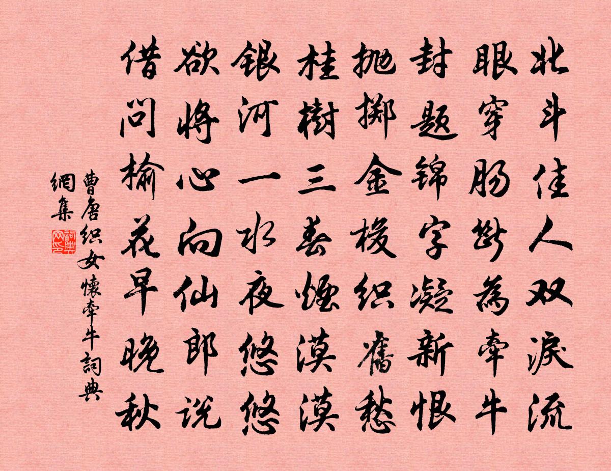 詩詞名句歷史字典書法欣賞書法字典國語詞典說文解字康熙字典古漢語字典標 題 作 者 詩 句 織女懷牽牛作者:曹唐 朝代:唐代織女懷牽牛原文北斗佳人雙淚流,眼穿腸斷為牽牛。封題錦字凝新恨,拋擲金梭織舊愁。桂樹三春煙漠漠,銀河一水夜悠悠。欲將心向仙郎說,借問榆花早晚秋。詩詞問答問:織女懷牽牛的作者是誰?答:曹唐問:織女懷牽牛寫於哪個朝代?答:唐代問:織女懷牽牛是什麼體裁?答:七律曹唐織女懷牽牛書法欣賞織女懷牽牛書法作品注釋全唐詩:卷640-11詩詞推薦送皎中庵住廣壽釋法薰〔宋代〕名字馨香滿道途,挽將洞水注南湖。他時把杖來輕探,莫謂從前一滴無。宿華嚴寺陸游〔宋代〕夜宿華嚴寺,人扶到上方。喚僧同看畫,避佛旋移床。小雨不成雪,烈風還作霜。鍾殘燈漸暗,趺坐默焚香。胡端逸結庵於清江之草鞋甲歲晏言別始知猶有陳杰〔宋代〕千羊濈濈擁初平,有抵封人反哺羹。自說老來行欲倦,忽聞親在座皆驚。白雲飛動能無思,寒雀啁啾故有聲。回首八聲甘州 秋日西湖泛舟,午後遇雨張翥〔元代〕向芙蓉湖上駐蘭舟,淒涼勝游稀。但西泠橋外,北山堤畔,殘柳依依。追憶鶯花舊夢,回首冷煙霏。惟有盟鷗好,臨江仙 孤雁納蘭性德〔清代〕霜冷離鴻驚失伴,有人同病相憐。擬憑尺素寄愁邊,愁多書屢易,雙淚落燈前。莫對月明思往事,也知消減年年。上欽成皇后冊寶六首真宗〔宋代〕酌彼玉瓚,有椒其聲。融假無言,雍容在庭。生莫興崇,於赫厥聲。祀事孔明,神格是聽。蘇溪特護坐禪岩釋智朋〔宋代〕當機突出鴨吞螺,奈此懸崖峭壁何。等是蘇溪蹲坐處,且非蒼檜影婆娑。先天應令張說〔唐代〕三陽麗景早芳辰,四序嘉園物候新。梅花百般障行路,垂柳千條暗回津。鳥驚直為飛風葉,魚躍都由怯岸人。唯願武后明堂樂章。宮音武則天〔唐代〕履艮包群望,居中冠百靈。萬方資廣運,庶品荷財成。神功諒匪測,盛德實難名。藻奠申誠敬,恭祀表惟馨。偈頌六十首釋曇華〔宋代〕一莖兩莖斜,其意毒如蛇。三莖四莖曲,無疑入地獄。言下若知非,心空及第歸。堪笑蔣山老,無端入荒草。次繆仲右韻二首洪咨夔〔宋代〕窗暖楊花撲,庭空燕子過。年侵歡易減。春惱病宜多。攬涕論兵事,扶頭讀凱歌。日來能飲未,正好醉亡何。沖卿席上得行字王安石〔宋代〕二年相值喜同聲,並轡塵沙眼亦明。新詔各從天上得,殘樽同向月邊傾。已嗟後會歡難必,更想前官責尚輕。黽勉酬張太祝晚秋臥病見寄白居易〔唐代〕高才淹禮寺,短羽翔禁林。西街居處遠,北闕官曹深。君病不來訪,我忙難往尋。差池終日別,寥落經年心。露濕偈頌八十七首釋慧開〔宋代〕眼如鼻孔口如槌,業識忙忙喚不回。南浦西山耕未遍,披毛戴角又重來。次韻衡山徐監酒同考府學試八首項安世〔宋代〕祝融峰下築糟邱,此段輸君一流。誤到塵中踏塵土,卻思江上駕漁舟。十二時頌釋文準〔宋代〕日南午,理事相諳更相互。三門拈向燈籠頭,休問他家覓歸路。東軒陸游〔宋代〕終日在東廂,閒消百刻香。一枰分黑白,雙硯列朱黃。荷氣侵簾馥,桐陰覆井涼。前知今夕夢,孤榜上瀟湘。示兒定孫二絕陳淳〔宋代〕丈夫尚志志高明,勿效卑卑世俗情。從上一條平坦路,千賢萬聖所通行。食晚菘新筍陳造〔宋代〕化兒出奇安此腹,下稱智囊不盛肉。飢雷收聲才脫粟,薦以藻芹仍杞菊。園丁可是監河侯,供我朝昏三畝綠。即今西洪嶺陳岩〔宋代〕眾壑中分嶺勢回,數家茅店傍山開。長風吹入松梢去,一片笙簧動地來。名句推薦君子不怨天,不尤人。孟子《孟子·公孫丑章句下·第十三節》 憶君遙在瀟湘月,愁聽清猿夢裡長。王昌齡《送魏二》 當年得意如芳草。日日春風好。辛棄疾《虞美人·賦虞美人草》 千淘萬漉雖辛苦,吹盡狂沙始到金。劉禹錫《浪淘沙九首》 良賈深藏若虛,君子盛德容貌若愚。司馬遷《史記·七十列傳·老子韓非列傳》 故人離別盡,淇上轉驂騑。王維《送魏郡李太守赴任》 正蹇驢吟影,茶煙灶冷,酒亭門閉。吳文英《無悶·催雪》 江上旗亭,送君還是逢君處吳大有《點絳唇·送李琴泉》 萬歲山前珠翠繞,蓬壺殿里笙歌作岳飛《滿江紅·登黃鶴樓有感》 日落君山雲氣,春到沅湘草木,遠思渺難收。張孝祥《水調歌頭·過岳陽樓作》