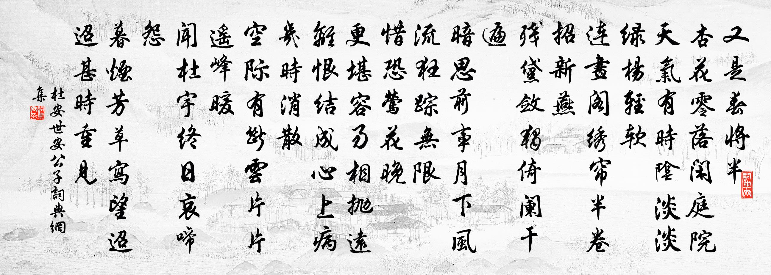 詩詞名句歷史字典書法欣賞書法字典國語詞典說文解字康熙字典古漢語字典標 題 作 者 詩 句 安公子作者:杜安世 朝代:宋代安公子原文又是春將半。杏花零落閒庭院。天氣有時陰淡淡,綠楊輕軟。連畫閣、繡簾半卷。招新燕。殘黛斂、獨倚闌乾遍。暗思前事,月下風流,狂蹤無限。惜恐鶯花晚。更堪容易相拋遠。離恨結成心上病,幾時消散。空際有、斷雲片片。遙峰暖。聞杜宇、終日哀啼怨。暮煙芳草,寫望迢迢,甚時重見。詩詞問答問:安公子的作者是誰?答:杜安世問:安公子寫於哪個朝代?答:宋代問:安公子是什麼體裁?答:詞杜安世安公子書法欣賞安公子書法作品詩詞推薦送胡澳下第歸蒲津薛能〔唐代〕無媒甘下飛,君子尚 * 。歲月終榮在,家園近且歸。山光臨舜廟,河氣隔王畿。甚積湯原思,青青宿麥肥。七月二十一日午睡夢泛江風濤甚壯覺而有賦陸游〔宋代〕夢中不記適何邦,風飽蒲颿入大江。久矣眼中無此快,蹴天雪浪濺船窗。宿桐廬館,同崔存度醉後作白居易〔唐代〕江海漂漂共旅遊,一尊相勸散窮愁。夜深醒後愁還在,雨滴梧桐山館秋。挽宜人李氏曾豐〔宋代〕僧戒阿誰受,法儀何處迎。兩回經夢境,三嘆悟人生。食已難為強,衣猶不憚更。得非禪力重,去住目由情。和武相錦樓玩月得濃字(時為西川營田副使)柳公綽〔唐代〕此夜年年月,偏宜此地逢。近看江水淺,遙辨雪山重。萬井金花肅,千林玉露濃。不唯樓上思,飛蓋亦陪從。羲娥謠楊萬里〔宋代〕羲和夢破欲啟行,紫金畢逋啼一聲。聲從天上落人世,千村萬落雞爭鳴。素娥西征未歸去,簸弄銀盤浣風露。一丸梁園吟李白〔唐代〕我浮黃雲去京闕,掛席欲進波連山。天長水闊厭遠涉,訪古始及平台間。平台為客憂思多,對酒遂作梁園歌。卻憶歸雁亭次東坡韻王洋〔宋代〕平時何憚不成歸,猶向亭前送雁飛。弱羽可堪繒繳密,寒沙那得稻梁稀。燕吳真恐音書絕,城郭猶疑今古非。若為六月十二日喜雨陳文蔚〔宋代〕麟經書雨意何如,可喜非常故可書。膏澤未觀南畝遍,嫩涼且覺北窗虛。采持好入豐年頌,把酒聊娛化日舒。懷抱茶灶梅堯臣〔宋代〕山寺碧溪頭,幽人綠岩畔。夜火竹聲乾,春甌茗花亂。茲無雅趣兼,薪桂煩燃爨。題龍興觀壁馬湘〔唐代〕世有無窮事,生知遂百春。問程方外路,宜是上清人。水調歌頭 贈劉居士李道純〔元代〕在俗心不俗,塵里不沾塵。處身中正,何妨鬧市與山林。踐履不偏不易,日用無爭無執,只此是全真。方寸莫教昧遊仙詞三十三首王鎡〔宋代〕金鐘三響紫微宮,玉樹煙飄輦路風。彩鳳已銜仙詔去,九天朝罷五雲中。陪竇侍御靈雲南亭宴詩,得雷字高適〔唐代〕人幽宜眺聽,目極喜亭台。風景知愁在,關山憶夢回。只言殊語默,何意忝游陪。連唱波瀾動,冥搜物象開。新秋鵑啼曲何夢桂〔宋代〕蠶業花鑿靈兩丘土,玉壘靈關一荒莽。杜鵑銜哀訴千古,萬里遊魂腥血污。冤聲無路叫天公,吻血灑地花為紅。巴西江月(春半)朱淑真〔宋代〕辦取舞裙歌扇,賞春只怕春寒。捲簾無語對南山,已覺綠肥紅淺。去去惜花心懶,踏青閒步江乾。恰如飛鳥倦知還次韻答樊伯撝見拉釣陳著〔宋代〕好共溪山結晚緣,竹枝深夜響漁椽。風清月朗滄溟外,魚躍鳶飛枕幾邊。茶灶煙銷回野艇,竹竿霜冷釣秋天。少年長思仙侯善淵〔元代〕看清音。見浮沉。法眼星眸運古今。紅蓮兩間侵。火珠林。水真金。不比他方去遠尋。承當認本心。寶嚴寺舒坦〔宋代〕四山煙雨收,雙沼漾晴碧。白鳥忽飛來,點破檐前色。五月南山蛟壞民田百畝胡英彥有詩次韻周必大〔宋代〕旌陽昔屠蛟,勛塞天宇大。涵淹此遺種,千歲不悔過。良苗蔚懷新,倏作渺茫墮。懦夫愧鼻祖,無策祗愁臥。勇哉名句推薦拆桐花爛漫,乍疏雨、洗清明。柳永《木蘭花慢·拆桐花爛漫》 人告之以有過則喜。孟子《孟子·公孫丑章句上·第八節》 道之以政,齊之以刑,民免而無恥。孔子弟子《論語·為政篇》 晚日寒鴉一片愁。柳塘新綠卻溫柔。辛棄疾《鷓鴣天·晚日寒鴉一片愁》 舜其大知也與!舜好問而好察邇言。隱惡而揚善。子思《中庸·第六章》 恩仇不可太明,明則人起攜貳之志。洪應明《菜根譚·概論》 相思了無益,悔當初相見。朱彝尊《憶少年·飛花時節》 又有牆頭千葉桃,風動落花紅蔌蔌。元稹《連昌宮詞》 雨中禁火空齋冷,江上流鶯獨坐聽。韋應物《寒食寄京師諸弟》 纖雲弄巧,飛星傳恨,銀漢迢迢暗度。秦觀《鵲橋仙·纖雲弄巧》