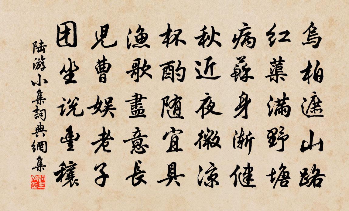 詩詞名句歷史字典書法欣賞書法字典國語詞典說文解字康熙字典古漢語字典標 題 作 者 詩 句 小集作者:陸游 朝代:宋代小集原文烏柏遮山路,紅蕖滿野塘。病蘇身漸健,秋近夜微涼。杯酌隨宜具,漁歌盡意長。兒曹娛老子,團坐說豐穰。詩詞問答問:小集的作者是誰?答:陸游問:小集寫於哪個朝代?答:宋代問:陸游的名句有哪些?答:陸游名句大全陸游小集書法欣賞小集書法作品詩詞推薦法駕導引劉克莊〔宋代〕樵柯爛,丹灶熟,一跳出紅塵。斗紫一雙龍奮贄,帝青九萬里為程。赤腳踏層雲。鞭鸞上,騎麟下,彷佛睹崑崙。滿江紅佚名〔宋代〕誰知恩愛,變成怨恨。登龍尾道南望憶廬山舊隱白居易〔唐代〕龍尾道邊來一望,香爐峰下去無因。青山舉眼三千里,白髮平頭五十人。自笑形骸紆組綬,將何言語掌絲綸?君恩飲酒姜特立〔宋代〕平生嗜酒不耽酒,不愛深斟愛淺斟。嵇阮詎能知此味,可憐一世只醺沈。樓中月夜韋應物〔唐代〕端令倚懸檻,長望抱沉憂。寧知故園月,今夕在茲樓。衰蓮送餘馥,華露湛新秋。坐見蒼林變,清輝愴已休。送范漕赴召八絕洪咨夔〔宋代〕走卒兒童口是碑,百年幾見好監司。浣花鏡月經行處,草木江山亦去思。竹間亭歐陽修〔宋代〕啾啾竹間鳥,日夕相嚶鳴。悠悠水中魚,出入藻與萍。水竹魚鳥家,伊誰作斯亭。翁來無車馬,非與彈戈並。潛者奉和江沖陶居二十韻汪炎昶〔宋代〕高人厭齋紛,不肯樓平地。木末敞軒窗,吒此超然意。念奴嬌(記夢)毛並〔宋代〕阿環家住閬風頂,絳闕瑤台相接。翳鳳乘鸞人不見,隱隱霓裳雲衱。秀骨貞風,長眉翠淺,映白喉紅頰。非煙深處江漢答孟郊韓愈〔唐代〕江漢雖雲廣,乘舟渡無艱。流沙信難行,馬足常往還。淒風結衝波,狐裘能禦寒。終宵處幽室,華燭光爛爛。苟能寄湘中鄭明府黃滔〔唐代〕縣與白雲連,滄洲況縣前。岳僧同夜坐,江月看秋圓。琴拂莎庭石,茶擔乳洞泉。莫耽雲水興,疲俗待君痊。重憶舊句蘇泂〔宋代〕太飽傷清氣,微寒最好詩。白鷗沒浩蕩,天馬謝羈維。矯矯真無敵,飄飄信所之。百年龍變化,萬事燕差池。戲題睡屏趙必象〔宋代〕一別相如直至今,床頭綠綺暗生塵。當年自是文君誤,未必琴心解挑人。偈頌六十五首釋普濟〔宋代〕一天星斗大家看,獨有渠儂見處偏。打失眼晴拈得口,至今腳下墨漫漫。周南仲輓詞翁卷〔宋代〕志以古人期,今人焉得知。學非無用處,命自不逢時。華省官如夢,閒居謗亦隨。喪君於此日,師友最相悲。費子范以予銘其父墓持錦物相餉盡歸之姑留洮晁公溯〔宋代〕大費家聲星斗垂,乃翁名跡世人知。平生於此辭無愧,不減東京有道碑。次韻王司戶梅花五絕下得用古人意及比婦人玉王之望〔宋代〕可耐幽花發較遲,殷勤為情曉風吹。朝來策杖探訊息,香處初開一兩枝。梅天陸游〔宋代〕稻隴移初遍,梅天澀未晴。輕陰昏茗色,余潤咽琴聲。時傍菱塘立,還尋沙逕行。杜門終此世,更誓未來生。文昌寓直鄭谷〔唐代〕何遜空階夜雨平,朝來交直雨新晴。落花亂上花磚上,不忍和苔蹋紫英。胠篋莊周〔先秦〕將為胠篋、探囊、發匱之盜而為守備,則必攝緘縢、固扃鐍;此世俗之所謂知也。然而巨盜至,則負匱、揭篋、擔名句推薦粉色全無飢色加,豈知人世有榮華。杜荀鶴《蠶婦》 聞道長安燈夜好,雕輪寶馬如雲。毛滂《臨江仙·都城元夕》 婦人依倚子與夫,同居貧賤心亦舒。張籍《征婦怨》 把酒對斜日,無語問西風。楊炎正《水調歌頭·把酒對斜日》 霰雪紛其無垠兮,雲霏霏而承宇。屈原《九章》 跨馬出郊時極目,不堪人事日蕭條杜甫《野望》 湛湛長江去,冥冥細雨來。杜甫《梅雨》 恐鳳靴,挑菜歸來,萬一灞橋相見。史達祖《東風第一枝·詠春雪》 五月天山雪,無花只有寒。李白《塞下曲六首·其一》 滾滾長江東逝水,浪花淘盡英雄。楊慎《臨江仙·滾滾長江東逝水》