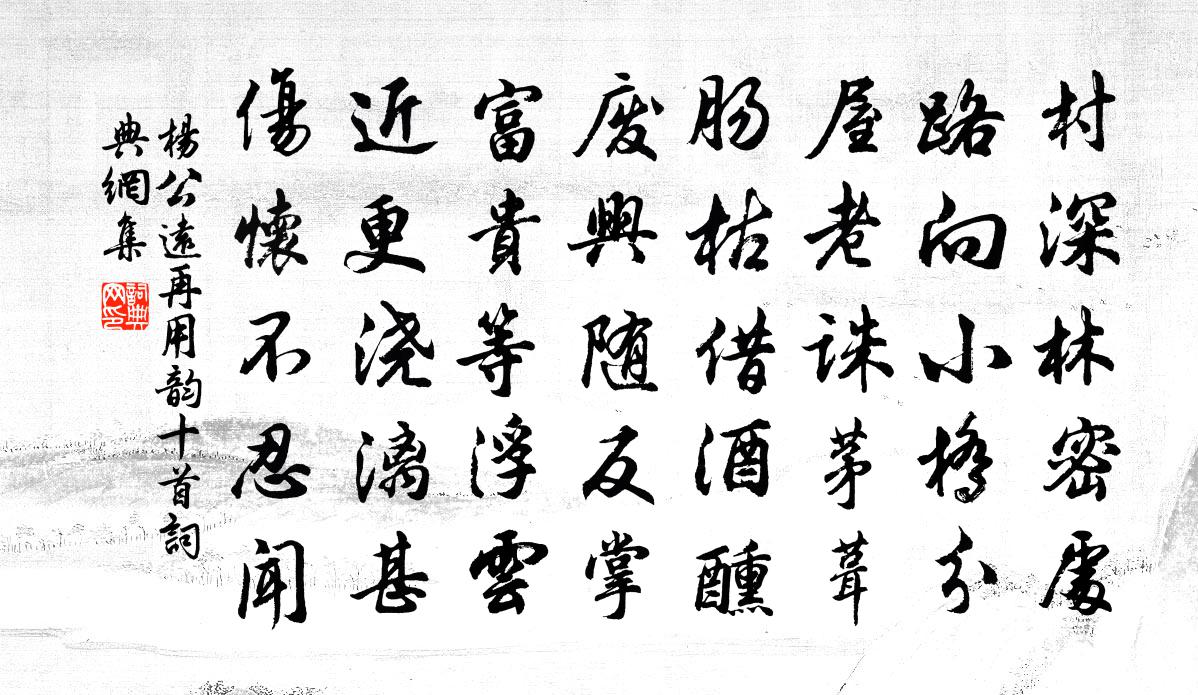 詩詞名句歷史字典書法欣賞書法字典國語詞典說文解字康熙字典古漢語字典標 題 作 者 詩 句 再用韻十首作者:楊公遠 朝代:宋代再用韻十首原文村深林密處,路向小橋分。屋老誅茅葺,腸枯借酒醺。廢興隨反掌,富貴等浮雲。近更澆漓甚,傷懷不忍聞。詩詞問答問:再用韻十首的作者是誰?答:楊公遠問:再用韻十首寫於哪個朝代?答:宋代楊公遠再用韻十首書法欣賞再用韻十首書法作品詩詞推薦七月六日夜雨陳普〔宋代〕蒼生一一共胞胎,日夜無端心上來。半月驕陽四更雨,豳風夏校夢初回。重陽侍老人飲陳文蔚〔宋代〕九十慈親鬢髮播,今年菊早去年花。一尊細說重陽事,似此清歡有幾家。李端端落籍圖唐寅〔明代〕善和坊里李端端,信是能行白牡丹。誰信揚州金滿市,胭脂價到屬窮酸。劉仙嚴胡銓〔宋代〕縣崖怪石水潺湲,宜有神龍隱此間,窮勝不妨歸險洞,尋春那止看群山。攀龍行即天邊去,躍馬聊同野外還。好景感物艾性夫〔宋代〕有山莫栽桃,有地宜種竹。此竹豈不佳,清陰蔽茅屋。朝有孤鳳翔,暮有白鶴宿。桃花艷春風,蜂蝶趁麄俗。花謝夜離零陵以避同僚追送之勞留二絕簡諸友楊萬里〔宋代〕已坐詩臞病更贏,諸公剛欲餞湘湄。夜浮一葉逃盟去,已被沙鷗聖得知。常寧道中懷許介之樂雷發〔宋代〕雨過池塘路未乾,人家桑柘帶春寒。野巫豎石為神像,稚子搓泥作藥丸。柳下兩姝爭餉路,花邊一犬吠征鞍。行吟貧病丘葵〔宋代〕貧似山僧瘦似猿,病軀只合老山村。空床{左臬右兀}{左兀右危}無氈臥,破褐襤縿有虱捫。作甫里翁垂釣艇,送道士楊見素南遊蘇轍〔宋代〕黃河春漲入隋溝,往意隨波日夜流。萬里尋山如野鶴,一身浮水似輕鷗。湖風送客那論驛,岳寺留人暗度秋。遲子詠懷二首宋祁〔宋代〕盡信書奚信,難言命敢言。竟誰成簡冊,無客問乾坤。值狩麟猶泣,遭君鶴乃軒。滔滔千古事,惟有付芳樽。新晴錢時〔宋代〕宿雲穿日薄,商略作新晴。燕子先期社,海棠今日春。溪山雙白鬢,天地一閒身。無語東風裹,飛花亂撲人。送章四十舅翁東歸楊億〔宋代〕鄉黨共推賢,乾名二十年。早懷荊岫璞,遲下祖生鞭。敢諫書無報,徒行履欲穿。聖朝公道在,搔首賦歸田。思歸黃公度〔宋代〕醉眼乾坤大,歸心日夜長。風霜歲雲暮,塵土鬢成蒼。俗物猶能在,危機只自防。可無田種秫,三徑未宜荒。題周子中司戶乘成台三首楊萬里〔宋代〕不煩營築便成台,自有青松不用栽。只道先生忙更懶,也須一日一回來。憶秦娥朱熹〔宋代〕梅花發。寒梢掛著瑤台月。瑤台月。和羹心事,履霜時節。野橋流水聲嗚咽。行人立馬空愁絕。空愁絕。為誰凝佇送權郡詹通判劉克莊〔宋代〕鎮靜一如無,頒條甫月餘。來惟居傳舍,去不識兵廚。健判風生筆,精祈雨灑車。丈夫何必假,行矣兩輪朱。重到霅隴衛宗武〔宋代〕少壯記曾游,茲來營首丘。青山不改色,白髮自多愁。寂寂千年晚,蕭蕭風雨秋。世緣何日了,一笑問盟鷗。用樵侄漁舟韻錢時〔宋代〕樂天知命吾付求,粗繒大布心休休。小山松桂歲寒友,一日不見中三秋。白雲岩上飛相逐,白雲岩前一窗足。秋花山行見野櫻桃花趙蕃〔宋代〕徐行歷歷轉深豅,人意何如鳥語同。山路梅花渾掃跡,春風盡屬野櫻紅。御命郊勞使客,船過崇德縣三首楊萬里〔宋代〕水面光浮赤玉盤,也應知我牽尖寒。滿河圭璧無人要,吹入詩翁凍筆端。名句推薦寧我負人,毋人負我。陳壽《三國志·魏書·武帝紀》 報導先生歸也,杏花春雨江南。虞集《風入松·寄柯敬仲》 手種黃柑二百株,春來新葉遍城隅。柳宗元《柳州城西北隅種柑樹》 百結愁腸郁不開,此生惆悵異鄉來。秋瑾《九日感賦》 紙上得來終覺淺,絕知此事要躬行。陸游《冬夜讀書示子聿》 人心統耳目官骸,而於百體為君,必隨處見神明之宰王永彬《圍爐夜話·第十二則》 江亭暇日堪高會,醉諷離騷不解愁邊貢《午日觀競渡》 九華山路雲遮寺,清弋江村柳拂橋。杜牧《宣州送裴坦判官往舒州時牧欲赴官歸京》 閒倚博山長嘆,淚流沾皓腕。韋莊《歸國遙·春欲晚》 待何年歸去,談笑各爭雄。顧太清《高山流水·次夫子清風閣落成韻》