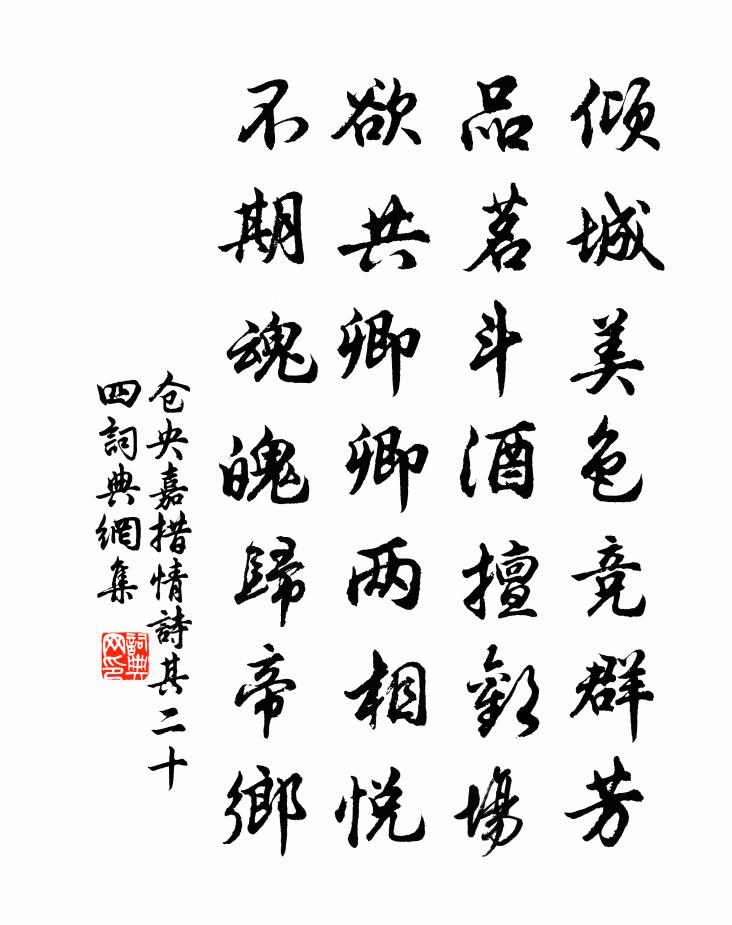 詩詞名句歷史字典書法欣賞書法字典國語詞典說文解字康熙字典古漢語字典標 題 作 者 詩 句 情詩其二十四作者:倉央嘉措 朝代:清代情詩其二十四原文傾城美色競群芳,品茗斗酒擅歡場。欲共卿卿兩相悅,不期魂魄歸帝鄉。詩詞問答問:情詩其二十四的作者是誰?答:倉央嘉措問:情詩其二十四寫於哪個朝代?答:清代問:情詩其二十四是什麼體裁?答:七絕倉央嘉措情詩其二十四書法欣賞情詩其二十四書法作品詩詞推薦小詩招僚友晚游後園二首司馬光〔宋代〕五陵年少競春暉,肥馬銀鞍白玉羈。何以楹間煮新茗,更來花底覆殘棋。耍娘歌張祜〔唐代〕宜春花夜雪千枝,妃子偷行上密隨。便喚耍娘歌一曲,六宮生老是蛾眉。洞溪慶道人歸上都楊億〔宋代〕精廬宴坐十經秋,瓶缽近為千里游。又是浮杯過淪海,便應飛錫入皇州。彌天談論降時彥,結社因緣背俗流。此去晚道過鏡山寺借憩未及曙而返丘葵〔宋代〕晚風殘照岸烏巾,小借禪床憩旅身。坐對新花忘故我,行看古月照今人。聊為江畔騎驢客,難會雲間駕鶴賓。泡沫紹興以後蜡祭四十二首佚名〔宋代〕[太簇為徽]三時不害,四方順成。酬功報始,以我齊明。引頌土鼓,樂此嘉平。降祥幅員,惠於函生。問月二首楊萬里〔宋代〕月入雲中去,呼他不出來。明宵教老子,何面更相陪。訪曾雲巢戴復古〔宋代〕一老今無恙,諸公昔與儔。隨時難苟合,懷道早歸休。苦似陶元亮,全如秦少游。筆端鋒銳別,有待續春秋。烏棲曲 [一作李端詩]王昌齡〔唐代〕白馬逐朱車,黃昏入狹邪。柳樹鳥爭枝,爭枝未得飛上屋。東房少婦婿從軍,每聽烏啼知夜分。和王才鼎懷錢塘鄭剛中〔宋代〕錢塘叛卒又嬰城,報至令人失意驚。天子於今猶自將,藩臣何以不知兵。官我良吏因循致,廟有成謨次第平。所惜和吳梅庵同登白龍對月韻朱南傑〔宋代〕秋容滿目帶微寒,帆穩蘭舟駕碧瀾。照我湖我天共色,襲人花氣露初乾。笑談紅袖日中舞,驚動蒼龍水底蟠。最是世弼病方家不善論蛤蜊之功戲答黃庭堅〔宋代〕伯樂無傳驥空老,重華不見士長飢。從來萬事乖名實,豈但藥翁論蛤蜊。久雨妨於農收,因訪子上有嘆楊萬里〔宋代〕君能過我意殊傾,我每看君腳便輕。若為泥塗斷還往,端令老病底心情。未霜楊柳秋猶碧,既雨芙蓉晚更明。旱歲送任漕吳芾〔宋代〕聖主方將大有為,有如二老盍來歸。不應飛挽留江表,且使澄清向日畿。四海英豪從古少,一時耆舊似君稀。相將洞仙歌(留春)晁補之〔宋代〕花恨月惱。更夏有涼風,冬軒雪皎。閒事不關心,算四時皆好。從來又說,春台登覽,人意多同,常是惜、春過了偈頌一百六十首釋宗杲〔宋代〕四月十五這公案,七月十五方結絕。即今這裡許多人,人人有理難分雪。神雞枕史鳳〔唐代〕枕繪鴛鴦久與棲,新裁霧縠斗神雞。與郎酣夢渾忘曉,雞亦留連不肯啼。逍遙詠宋太宗〔宋代〕不爭多氣力,容易可成功。意馬須調伏,如塵幻夢中。任持從雅淡,樂道定雌雄。修煉知勤苦,因緣自契約。送奭公抄化翁卷〔宋代〕一錫出林去,風霜前路寒。自言緣事了,方得此身安。飄葉隨禪步,飢食傍野餐。舊房惟有佛,開著任人看。晚渡蘇泂〔宋代〕小雨濕詩人,人疑過渡頻。望山高著眼,就樹巧遮身。有句尋鷗說,無家認鶴親。明朝上京去,釃酒酹溪神。和曼叔憩永惠院韓維〔宋代〕立春月在季,我時如滍皋。驚風揚紅塵,頗有行役勞。自駭茲剎勝,願言憩驂鑣。前對高花繁,後視萬竹交。虛堂名句推薦不充詘於富貴,不遑遑於所欲。姚察、姚思廉《梁書·列傳·卷五十》 碧雲無渡碧天沉,是湖心,是儂心。張惠言《江城子·填張春溪西湖竹枝詞》 烏啼隱楊花,君醉留妾家。李白《楊叛兒》 開花必早落,桃李不如松。李白《箜篌謠》 錢塘江上潮信來,今日方知我是我。施耐庵《水滸傳·第一百一十九回》 黯然銷魂者,唯別而已矣!江淹《別賦》 台在山腰,一峰突起,離水十餘丈。沈復《浮生六記·浪遊記快》 飛鳥盡,良弓藏;狡兔死,走狗烹。司馬遷《史記·越王勾踐世家》 學而不思則罔,思而不學則殆。孔子弟子《論語·為政篇》 玉勒雕鞍遊冶處,樓高不見章台路。歐陽修《蝶戀花·庭院深深深幾許》