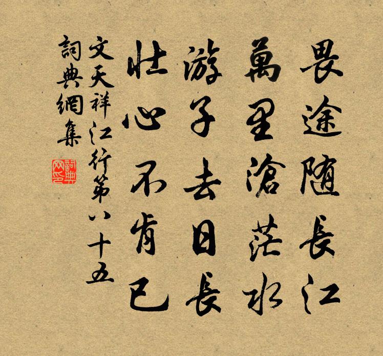 詩詞名句歷史字典書法欣賞書法字典國語詞典說文解字康熙字典古漢語字典標 題 作 者 詩 句 江行第八十五作者:文天祥 朝代:宋代江行第八十五原文畏途隨長江,萬里滄茫水。遊子去日長,壯心不肯已。詩詞問答問:江行第八十五的作者是誰?答:文天祥問:江行第八十五寫於哪個朝代?答:宋代問:文天祥的名句有哪些?答:文天祥名句大全文天祥江行第八十五書法欣賞江行第八十五書法作品詩詞推薦戈陽縣學北堂見夾竹桃花有感而書李覯〔宋代〕暖碧覆晴殷,依依近朱欄。異類偶相合,勁節何能安。同地盡妖艷,無地容檀欒。移根既不可,潔心誠為難。外貌晝坐張弋〔宋代〕出門無所往,獨自坐胡床。雨濯殘梅盡,風吹百草長。近邊人喜戰,偶病客傳方。不奈春愁密,思君對酒觴。秘閣鄭公移節鄉部置酒餞別詩以侑之張栻〔宋代〕嗜僻寡同好,意合難語離。傾蓋今年年,盍簪愜心期。況復王事可,退食陪委蛇。窺君肺腑中,落落無藩籬。獨有居茅山作劉誼〔宋代〕曾跨江西使者鞍,直言才上便休官。三茅得夢全清瘦,頭髮鬅鬙布襖寬。好事近汪莘〔宋代〕春早不知春,春晚又還無味。一點日中星鳥,想堯民如醉。不寒不暖杏花天,花到半開處。正是太平風景,為人間頌古一○一首釋子淳〔宋代〕一片靈明本妙圓,箇中非正亦非偏。寶峰瑞草無根蒂,不待春功色自鮮。初年樂城館中臥疾懷歸作孟浩然〔唐代〕異縣天隅僻,孤帆海畔過。往來鄉信斷,留滯客情多。臘月聞雷震,東風感歲和。蟄蟲驚戶穴,巢鵲眄庭柯。徒對嘉泰三年皇后冊寶十三首佚名〔宋代〕玉璽瑤同,既祗既承。繡裀藻度,載躋載升。柔各肅穆,瑞命端凝。永膺多福,如川方增。早起鄭獬〔宋代〕頭疼宿酒未能解,獨怕曉寒簾卷遲。懊恨桃花愛飄蕩,夜來壓折海棠枝。西山桐十詠桐風陳翥〔唐代〕分材植梧桐,桐茂成翠林。日日來輕風,時時自登臨。拂乾動微毳,吹葉破圓陰。虛涼可解慍,輕鼓如調琴。莫傳到夔州冉居常〔宋代〕縹緲飛樓壓舊城,年年來聽峽猿吟。衣裳慣見秋風冷,夢寐常愁塞日陰。霜露園林千古事,波濤鷗鷺一生心。只應紫微舍人宋公愛子侄三人同日得第作詩以紀盛強至〔宋代〕君王賜第御靈和,兄弟同時捷雋科。名占風雷 * 遍,恩沾雨露一門多。衣冠盛事喧金榜,里巷榮歸綴玉珂。他日寄匡阜諸公二首齊己〔唐代〕松頭柏頂碧森森,虛檻寒吹夏景深。靜社可追長往跡,白蓮難問久修心。山圍四面才容寺,月到中宵始滿林。爭學讀淵明集文同〔宋代〕吏人已散門闌靜,公事才休耳目清。窗下好風無俗客,案頭遺集有先生。文章簡要惟華袞,滋味醇醲是太羹。也待詠史詩葉縣胡曾〔唐代〕葉公丘墓已塵埃,雲矗崇墉亦半摧。借問往年龍見日,幾多風雨送將來。高士詠玄晏先生吳筠〔唐代〕士安逾弱冠,落魄未修飾。一朝因感激,志學忘寢食。著書窮天人,辭聘守玄默。薄葬信昭儉,可為將來則。聞崇安縣學立碑熊禾〔宋代〕出山未逾月,輒復入山去。平生武夷志,茲游適真遇。誅茅倘可遂,豈但山水趣。扶搖欣夙心,躊躇動長慮。恭惟多景樓陳允平〔宋代〕懷古心情獨倚樓,荻花楓葉滿江秋。地雄吳楚東南會,水接荊揚上下流。鐵瓮百年春雨夢,銅駝萬里夕陽愁。西風西江月 常足暢懷尹志平〔元代〕盡日觀山玩水,終朝常足心休。老來佚樂更何求。保我陽生九九。幸得為人通道,道中別有歸投。功成雲步看瀛洲濛濛雨中春鄭剛中〔宋代〕濛濛雨中春,回首失殘臘。茸茸亭前草,新舊已相雜。纍囚守僧窗,日懼萬鈞壓。有罪可糜軀,無仆堪荷鍤。門前名句推薦閣雪雲低,卷沙風急,驚雁失序。吳文英《永遇樂·探梅次時齋韻》 慷慨十年長劍在,登樓一笑暮山橫。崔允《花馬池詠》 便做無情,莫也愁人苦朱淑真《蝶戀花·送春》 一身虜雲外,萬里胡天西。岑參《早發焉耆懷終南別業》 扁舟去作江南客,旅雁孤雲。朱敦儒《採桑子·彭浪磯》 不興其藝,不能樂學。戴聖《禮記·學記》 為惡而畏人知,惡中猶有善路;為善而急人知,善處即是惡根。洪應明《菜根譚·概論》 日暮蒼山遠,天寒白屋貧。劉長卿《逢雪宿芙蓉山主人》 黃昏鼓角似邊州,三十年前上此樓。李益《上汝州郡樓》 香爐瀑布遙相望,回崖沓嶂凌蒼蒼。李白《廬山謠寄盧侍御虛舟》