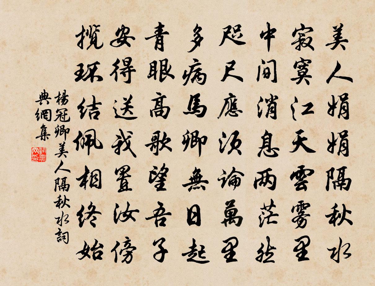 詩詞名句歷史字典書法欣賞書法字典國語詞典說文解字康熙字典古漢語字典標 題 作 者 詩 句 美人隔秋水作者:楊冠卿 朝代:宋代美人隔秋水原文美人娟娟隔秋水,寂寞江天雲霧裡。中間訊息兩茫然,咫尺應須論萬里。多病馬卿無日起,青眼高歌望吾子。安得送我置汝傍,攬環結佩相終始。詩詞問答問:美人隔秋水的作者是誰?答:楊冠卿問:美人隔秋水寫於哪個朝代?答:宋代楊冠卿美人隔秋水書法欣賞美人隔秋水書法作品詩詞推薦傷曾秀才馬劉威〔唐代〕買得龍媒越水濆,輕桃細杏色初分。秋歸未過陽關日,夜魄忽銷陰塞雲。吳練已知隨影沒,朔風猶想帶嘶聞。臨軒偈三首釋慧方〔宋代〕達磨祖師在腳底,踏不著兮提不起。子細當頭放下看,病在當時誰手裡。張公會看脈,李公會使藥,兩個競頭醫,蘭陵王(和清真)葉隆禮〔宋代〕大堤直。裊裊游雲蘸碧。蘭舟上,曾記那回,拂粉塗黃弄春色。施顰托傾國。金縷尊前勸客。陽台路,煙樹萬重,過海得子由書蘇軾〔宋代〕經過廢來久,有弟忽相求。門外三竿日,江關一葉秋。蕭疏悲白髮,漫浪散窮愁。世事江聲外,吾生幸且休。南柯子侯善淵〔元代〕太上玄元祖,生居浩劫先。首初傳教五千言。演正無疑,誰曉此幽玄。盡吃迷心藥,誰餐續命丹。邪門曲教自 * 賀新郎 酬辛幼安,再用韻見寄陳亮〔宋代〕離亂從頭說。愛吾民,金繒不愛,蔓藤累葛。壯氣盡消人脆好,冠蓋陰山觀雪。虧殺我,一星星發。涕出女吳成倒戲贈趙使君美人杜審言〔唐代〕紅粉青娥映楚雲,桃花馬上石榴裙。羅敷獨向東方去,謾學他家作使君。第六十三卷寄蔣世范彭景行〔宋代〕知命灰心況寵名,故求窮僻守孤城,舉頭但對青山色,近聽唯聞綠水聲。感皇恩(彥逢弟生日)王之道〔宋代〕宿霧霽晨霜,江山明秀。照眼黃花亂晴晝。當年今日,正是懸弧時候。一杯聊獻祝,同親舊。莫問窮通,休論貧富句陳伯震〔宋代〕修眉濃淡裹,寸碧有無間。菊坡朱應龍〔宋代〕口有綺語債,長詠菊坡詩。最好重陽景,母雞肥熟時。觀物吟邵雍〔宋代〕耳目聰明男子身,洪鈞賦與不為貧。因探月窟方知物,未躡天根豈識人。乾過異時觀月窟,地逢雷處看天根。天根宋頌九首莫醜石介〔宋代〕乃謀於渭,乃將於美。王師膺揚,涉江萬里。登大明寺塔宋庠〔宋代〕寂寞南朝寺,徘徊北顧人。鐘聲含曉籟,塔相涌仙輪。弔古千齡恨,觀空萬法塵。三車何處在,歸鞅欲迷津。和劉後村梅花百詠方蒙仲〔宋代〕披衣徒倚天方曙,秉燭吟喔夜忽中。不是被他驅使得,愛他意政與人同。和因上人三首王之道〔宋代〕一枰蘭若復誰家,坐見羲和下日車。燥吻未濡蓮社酒,枯腸空攪玉川茶。搖風綠竹初翻籜,過雨紅葵甚放花。得句送張諫議武元衡〔唐代〕漢庭從事五人來,回首疆場獨未回。今日送君魂斷處,寒雲寥落數株梅。元夕獨坐王柏〔宋代〕頗聞燈火鬧熒熒,何似書窗一點青。尚喜今年民意樂,一般簫鼓兩般聽。直方大李石〔宋代〕梧桐角可磨,江沙玉能錯。由來剛強徒,未易勝軟弱。是在六二坤,對病可為藥。吾生任天真,三者不自度。中年壽星寺晃詠之〔宋代〕石磴插青雲,禪宮入渺冥。歸雲侵客座,流水亂松聲。天近月逾白,竹多山更青。從來丘壑志,不獨付孫登。名句推薦聰以知遠,明以察微。司馬遷《史記·五帝本紀》 黃雞白酒,君去村社一番秋。辛棄疾《水調歌頭·送楊民瞻》 非鬼亦非仙,一曲桃花水辛棄疾《生查子·獨游雨岩》 冬宜密雪,有碎玉聲。王禹偁《黃岡竹樓記》 露蓼香涇,記年時相識吳文英《尾犯·甲辰中秋》 釣者之恭,非為魚賜也;餌鼠以蟲,非愛之也。墨子《墨子·49章 魯問》 柳絲長,桃葉小。深院斷無人到。晏幾道《更漏子·柳絲長》 東風惡,歡情薄。陸游《釵頭鳳·紅酥手》 燕子又將春色去。紗窗一陣黃昏雨。司馬槱《黃金縷·家在錢塘江上住》 何當載酒來,共醉重陽節。孟浩然《秋登蘭山寄張五》