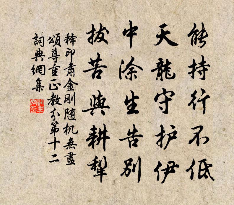 詩詞名句歷史字典書法欣賞書法字典國語詞典說文解字康熙字典古漢語字典標 題 作 者 詩 句 金剛隨機無盡頌尊重正教分第十二作者:釋印肅 朝代:宋代原文能持行不低,天龍守護伊。中塗生告別,拔苦與耕犁。詩詞問答問:《金剛隨機無盡頌尊重正教分第十二》的作者是誰?答:釋印肅問:該詩寫於哪個朝代?答:宋代書法欣賞金剛隨機無盡頌尊重正教分第十二書法作品詩詞推薦得失吟邵雍〔宋代〕人有賢愚,事無巨細。得不艱難,失必容易。徐南卿招飯陳造〔宋代〕白晝曲肱睨東壁,鴬斯空復賊糧食。晚途自笑硯生埃,少日頗嘗韋串冊。生世恐隨草木腐,忍使功言兩無得。長安同裴觀察東湖望山歌顧況〔唐代〕浴鮮積翠棲靈異,石洞花宮橫半空。夜光潭上明星啟,風雨壇邊樹如洗。水淹徐孺宅恆乾,繩墜洪崖井無底。主人詠蝶舒岳祥〔宋代〕前身曾學昭儀舞,時樣工為京兆眉。揀盡好枝無可意,倦尋芳草歇多時。曉畦霧重狂須減,風檻花飛悞與隨。不但霜角 水西煙雨張可久〔元代〕沙淺波平。孤舟長日橫。淡墨瀟湘八景,誰移向、富山城。淨名。疏磬聲。暮歸何處僧。明日披雲風頂,呼太白、頌古二十首釋了一〔宋代〕禮佛無端撞趙州,卻將知見作冤讐。如今四海平如掌,雲自高飛水自流。浪淘沙李萊老〔宋代〕寶押繡簾斜。鶯燕誰家。銀箏初試合琵琶。柳色春羅裁袖小,雙戴桃花。芳草滿天涯。流水韶華。晚風楊柳綠交加宮詞王珪〔唐代〕七寶欄乾白玉除,新開涼殿幸金與。一溝泛碧流春水,四面瓊鉤搭綺疏。永昭陵輓詞三首歐陽修〔宋代〕行殿沉沉畫翣重,淒涼挽鐸出深宮。攀號不悟龍胡遠,侍從猶穿豹尾中。日薄山川長起霧,天寒松◇自生風。斯民年根雨雪行舒岳祥〔宋代〕霧雨弊弊生窮歲,雞寒入屋犬竇吠。老衾破絮少溫存,濕薪吐汁無氣勢。一冬已近四月晴,殘歲垂垂點滴聲。人心壬戌三月五日先孺人生日痛成錢載〔清代〕籠翮思飛孰與哀,哺雛未返母先摧。茫茫縱使重霄徹,杳杳難將萬古回。廚下米薪如手辦,堂前風雨莫花開。讀書寄吳肅秀才林逋〔宋代〕肄業寄僧房,暑天湖上涼。竹風過枕簟,梅雨潤巾箱。引步青山影,供吟白鳥行。明年重訪舊,身帶桂枝香。澆花喻良能〔宋代〕花木蒙沾潤,根堅枝亦驕。懸知如舌本,端藉酒杯澆。早秋夜坐貫休〔唐代〕微涼砧滿城,林下石床平。發豈無端白,詩須出世清。鄰僧同樹影,砌月浸蛩聲。獨自更深坐,無人知此情。南樓令(壽月溪)張炎〔宋代〕天淨雨初晴。秋清人更清。滿吟窗、柳思周情。一片香來松桂下,長聽得,讀書聲。閒處卷黃庭。年年兩鬢青。佩至揚州文天祥〔宋代〕路逢敗屋作雞棲,白屋荒荒鬼哭悲。袖有金錢無米糴,假饒有米亦無炊。書懷張籍〔唐代〕自小信成疏懶性,人間事事總無功。別從仙客求方法,時到僧家問苦空。老大登朝如夢裡,貧窮作活似村中。未能秋懷 其六王冕〔元代〕驅驅上南國,依約金張里。舊日三重階,風雨埋荊杞。王山故無恙,流水猶未已。幽幽樹底禽,哀歌為誰起?頌古二十九首釋師體〔宋代〕兵行詭道,賊是家親。無功受祿,有理難伸。崔成州將赴官招客劇飲次袁主管韻項安世〔宋代〕段家池館已灰煙,更說江家六百年。但有小橋通綠水,不妨高閣看青天。鐘山月到東城有,淮口潮來上閘邊。兩行名句推薦黃鳥翩翩楊柳垂,春風送客使人悲。高適《東平別前衛縣李寀少府 / 送前衛縣李宷少府》 貧者士之常也,死者人之終也,處常得終,當何憂哉?列子及其弟子《列子·天瑞》 審其名實,慎其所謂。公孫龍《公孫龍子·名實論》 此去與師誰共到,一船明月一帆風。韋莊《送日本國僧敬龍歸》 馬穿山徑菊初黃,信馬悠悠野興長。王禹偁《村行·馬穿山徑菊初黃》 中夜四五嘆,常為大國憂。李白《經亂離後天恩流夜郎憶舊遊書懷贈江夏韋太守良宰》 老翁逾牆走,老婦出門看。杜甫《石壕吏》 殘螢棲玉露,早雁拂金河。許渾《早秋三首·其一》 凡軍欲其眾也,心欲其一也,三軍一心則令可使無敵矣。李昉、李穆、徐鉉《太平御覽·兵部·卷二》 重岡已隔紅塵斷,村落更年豐。元好問《人月圓·重岡已隔紅塵斷》