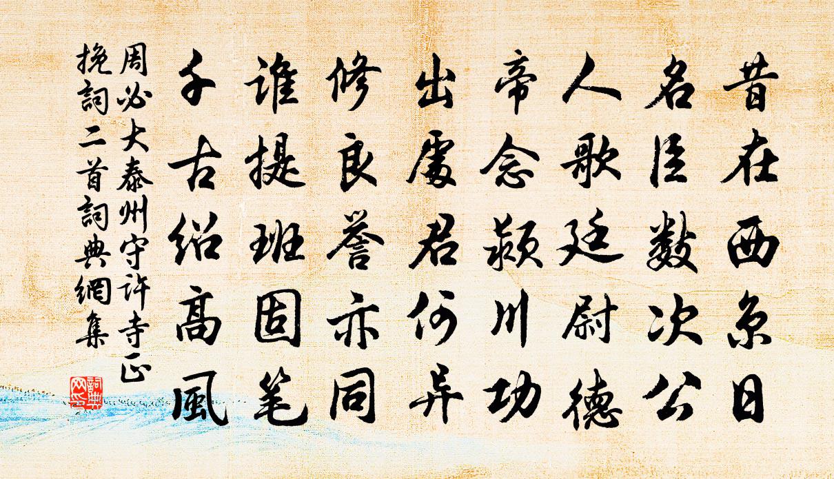 詩詞名句歷史字典書法欣賞書法字典國語詞典說文解字康熙字典古漢語字典標 題 作 者 詩 句 泰州守許寺正輓詞二首作者:周必大 朝代:宋代泰州守許寺正輓詞二首原文昔在西京日,名臣數次公。人歌廷尉德,帝念潁川功。出處君何異,修良譽亦同。誰提班固筆,千古紹高風。詩詞問答問:泰州守許寺正輓詞二首的作者是誰?答:周必大問:泰州守許寺正輓詞二首寫於哪個朝代?答:宋代周必大泰州守許寺正輓詞二首書法欣賞泰州守許寺正輓詞二首書法作品詩詞推薦題米元暉瀟湘圖二首尤袤〔宋代〕萬里江天杳靄,一村煙樹微茫。只欠孤篷聽雨,恍如身在瀟湘。往溪源祈雨賡李司法韻陳宓〔宋代〕一春雨脈發清泉,何以平疇旱欲然。太守自慚無善政,鈴齋朝夕謾祈天。玉蝴蝶孫光憲〔唐代〕春欲盡,景仍長,滿園花正黃。粉翅兩悠颺,翩翩過短牆。鮮飆暖,牽遊伴,飛去立殘芳。無語對蕭娘,舞衫沉麝陰雨向月餘三月初一聞鳩鳴有作舒岳祥〔宋代〕春雨濛濛來,花時昏昏過。山深多悲風,閉戶只欲臥。此村無杜鵑,不知桑葉大。灘聲自不惡,賴此洗塵堁。曉聞金縷曲·亡婦忌日有感納蘭性德〔清代〕此恨何時已。滴空階、寒更雨歇,葬花天氣。三載悠悠魂夢杳,是夢久應醒矣。料也覺、人間無味。不及夜台塵土垂虹亭葉茵〔宋代〕東西耕釣窟,左右利名津。倚遍闌乾曲,知幾有幾人。頌證道歌證道歌釋印肅〔宋代〕上士一決一切了,十二時中常皎皎。擲劍揮空大丈夫,回頭自覺無邊表。書景蘇泂〔宋代〕黃衣鶯子一雙飛,飛到花間立少時。此際東風有情思,杏花吹折最繁枝。水調歌頭(為總得居士壽)張孝祥〔宋代〕隆中三顧客,圯上一編書。英雄當日感會,餘事了寰區。千載神交二子,一笑眇然茲世,卻願駕柴車。長憶淮南岸太伯廟蔣堂〔宋代〕太伯何為者,不以身為身。遜避天下位,奔走勾吳濱。隱德照來世,遺祀傳斯民。吁此廉讓國,合生廉讓民。雜曲歌辭。妾薄命孟郊〔唐代〕不惜十指弦,為君千萬彈。常恐新聲至,坐使故聲殘。棄置今日悲,即是昨日歡。將新變故易,持故為新難。青山舒州寄王介甫曾宰〔宋代〕官居隱几望灊山,不似茅檐舊日閒。顧我塵沙添白髮,憐君道路失朱顏。江涵秋老鱸魚美,岸入春風荻筍斑。此味戴時芳時可學子吳叔度文可載酒西坑勞苦陳著〔宋代〕驚魂何事到西坑,豈是三生願莫償。兩寺鼓鍾醒客夢,一村草木助吟香。人情物變多時樣,水色山光自古妝。我本姑孰溪李白〔唐代〕愛此溪水閒。乘流興無極。漾楫怕鷗驚。垂竿待魚食。波翻曉霞影。岸疊春山色。何處浣紗人。紅顏未相識。春日王安石〔宋代〕冉冉春行暮,菲菲物競華。鶯猶求舊友,雁不背貧家。室有賢人酒,門無長者車。醉眠聊自適,歸夢到天涯。贈薛濤(見張為主客圖)白居易〔唐代〕蛾眉山勢接雲霓,欲逐劉郎北路迷。若似剡中容易到,春風猶隔武陵溪。除夜潘牥〔宋代〕屈指頭顱三十一,年時又見煮酴酥。平生自謂妄男子,未死誰甘賤丈夫。歡逐兒童燒竹爆,自拈禿筆寫桃符。梅花六花飛(冊寶)曹勛〔宋代〕寅杓乍正,瑞雲開曉,罩紫府宮殿。聖孝虔恭,率宸庭冠劍。上徽稱、天明地察,奉玉檢、璇耀金輝,仰吾君,親繆朝宗第一百一十六文天祥〔宋代〕空荒咆熊羆,摧殘沒藜莠。平生江海心,其人骨已朽。晨起陸游〔宋代〕老尚貪書課,黎明即下床。不驚天乍冷,更覺意差強。蟾滴初添水,螭爐旋炷香。浮生又一日,開卷就窗光。名句推薦冬宜密雪,有碎玉聲。王禹偁《黃岡竹樓記》 關山別盪子,風月守空閨。薛道衡《昔昔鹽》 欲渡黃河冰塞川,將登太行雪滿山。李白《行路難·其一》 樹荊棘得刺,樹桃李得蔭馮夢龍《警世通言·卷十八》 營州少年厭原野,狐裘蒙茸獵城下。高適《營州歌》 末路驚風雨,窮邊飽雪霜文天祥《除夜》 大漠風塵日色昏,紅旗半卷出轅門。王昌齡《從軍行七首》 還背垂虹秋去,四橋煙雨,一宵歌酒。吳文英《瑞龍吟·送梅津》 家住層城臨漢苑,心隨明月到胡天。皇甫冉《春思》 黃雲萬里動風色,白波九道流雪山。李白《廬山謠寄盧侍御虛舟》