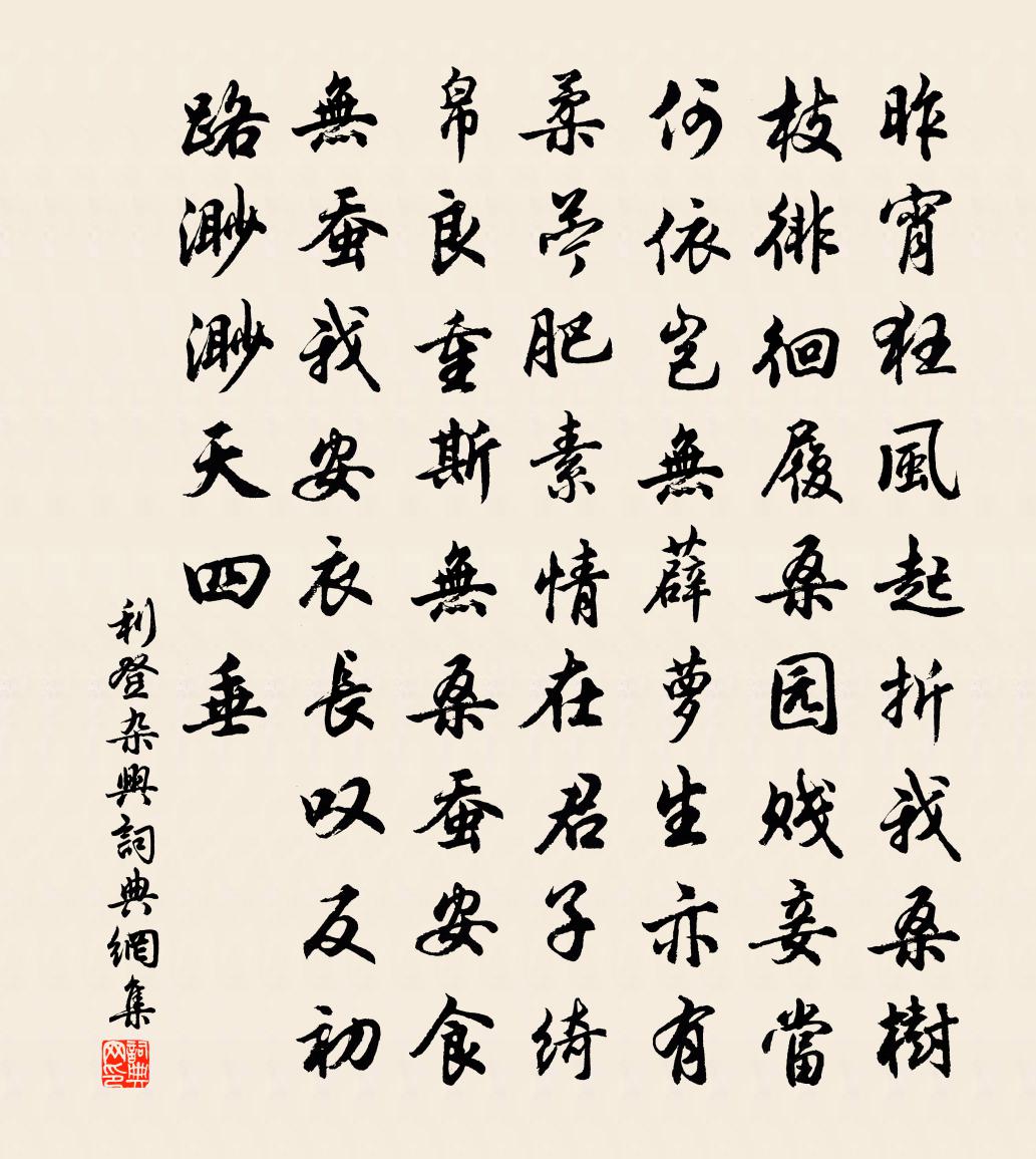 詩詞名句歷史字典書法欣賞書法字典國語詞典說文解字康熙字典古漢語字典標 題 作 者 詩 句 雜興作者:利登 朝代:宋代雜興原文昨宵狂風起,折我桑樹枝。徘徊履桑園,賤妾當何依。豈無薜蘿生,亦有柔苧肥。素情在君子,綺帛良重斯。無桑蠶安食,無蠶我安衣。長嘆反初路,渺渺天四垂。詩詞問答問:雜興的作者是誰?答:利登問:雜興寫於哪個朝代?答:宋代利登雜興書法欣賞雜興書法作品詩詞推薦鄞中和張世隆總管春曉即事孫應時〔宋代〕春欲歸時豈得留,杜鵑聲里翠陰稠。柳橋總是千絲恨,花徑真成萬點愁。東土雲山供我老,西湖風月稱公游。相逢次韻靖州貢士鹿鳴宴二首魏了翁〔宋代〕何處何時不產賢,黔中故地夜郎天。雖雲地脈元無閒,欲破天荒未有先。萬蟻場中春鎖棘,九賓庭下曉鳴鞭。便將對月了殘經贊釋紹曇〔宋代〕五教三乘,之繞葛藤。一言道盡,玉兔東升。依韻和永叔久在病告近方赴直道懷見寄二章梅堯臣〔宋代〕浴堂深殿近皇居,秋夕詞臣直宿初。宮女穿針爭落月,官奴持獨看殘書。萬家乞巧心無盡,斜漢飛光望有餘。枕上夜遊宮 記夢寄師伯渾陸游〔宋代〕雪曉清笳亂起,夢遊處、不知何地?鐵騎無聲望似水。想關河,雁門西,青海際。睡覺寒燈里,漏聲斷、月斜窗紙早起周容〔宋代〕四海人同夢,雞聲忽起予。千秋心未已,一日事何如?酒趣劉伶減,年華鄧禹虛。憑欄空自笑,抱瓮灌園蔬。花檻夏竦〔宋代〕曲檻橫欄百實裝,春風容冶看人狂。孤松瘦柏無顏色,只有青青待雪霜。有所教元稹〔唐代〕莫畫長眉畫短眉,斜紅傷豎莫傷垂。人人總解爭時勢,都大須看各自宜。題張曦顏兩花圖──玉梨范成大〔宋代〕雪薄冰輕不耐春,雨中愁緒月中真。莫教夢作雲忌去,留伴昭陽第一人。春草碧 亂後乍見故人,情文浹甚。老來共談邵亨貞〔元代〕以索寒梅之笑亂離避世無方略。何處可尋幽,須期約。桃源只在人間,爭得身輕跨寥鶴。空憶舊歡游,成今昨。自和李清卿雪王之望〔宋代〕浩蕩天花弄曉光,春風未轉忽芬芳。人躋物外紅塵遠,境墮壺中白晝長。風柳冷飄三月絮,寒梅幽寄一枝香。朝來明師見和梅詩再用韻兼奉送還福唐王銍〔宋代〕斲輪妙手聲名歇,誰信出門猶合轍。後來世外有高禪,凜凜蘭摧並玉折。久將生死付八還,不數圖書號三絕。詩來載酒過景仁不園韓維〔宋代〕地勝依危堞,城高若半峰。銜觴驚歲序,候雪仰雲容。不假貓滋竹,須防犬敗松。顧慚文俗吏,游步躡仙蹤。點絳唇趙彥端〔宋代〕秋入闌乾,亭亭波面虹千丈。一聲魚唱。畫個三高樣。江上風波,更泛吳松浪。寒潮漲。石魚酒舫。漫叟知何向。中秋前偶題陳宓〔宋代〕雨過雲衣已半除,深淵絢爛剖驪珠。陰晴明日猶難料,未必中秋此夜如。少年行(一作漢宮少年行)雍陶〔唐代〕不倚軍功有俠名,可憐球獵少年情。戴鈴健鶻隨聲下,撼珮驕驄弄影行。覓匠重裝燕客劍,對人新按越姬箏。豈知贊三十六祖頌釋印肅〔宋代〕破頭山下起清波,流注黃梅不奈何。四度敕宣端不動,尊威妙湛灌娑婆。贛州豐樂長老惠宣寫予真戲贊時年七十三周必大〔宋代〕少年日醉郁孤台,鼎立三禪屢往來。豪氣雖存誰復識,形容變盡鬢皚皚。謝制帥高卿剡四首陳造〔宋代〕去年來甬東,旄倪喜勸色。色今畫船西,行路亦嗟惜。去來本何心,民自作欣慼。達人了世緣,八極付揮斥。止泓亭趙希發〔宋代〕止泓清而明,如彼秋月滿。以此觀我心,澄源斯過本。名句推薦明者防於無形,治者制其未亂魏徵《隋書·列傳·卷四》 立身成敗,在於所染吳兢《貞觀政要·卷十·論慎終》 莫買沃洲山,時人已知處。劉長卿《送方外上人/送上人》 夜雨連明春水生,嬌雲濃暖弄陰晴。蘇舜欽《初晴游滄浪亭》 秦中花鳥已應闌,塞外風沙猶自寒。王翰《涼州詞二首》 去年今日臥燕台,銅鼓中宵隱地雷王守仁《元夕二首》 巴山重疊相逢處。燕子占巢花脫樹。張先《漁家傲·和程公辟贈》 春愁難遣強看山,往事驚心淚欲潸。丘逢甲《春愁》 舊苑荒台楊柳新,菱歌清唱不勝春。李白《蘇台覽古》 雨色秋來寒,風嚴清江爽。李白《酬裴侍御對雨感時見贈》