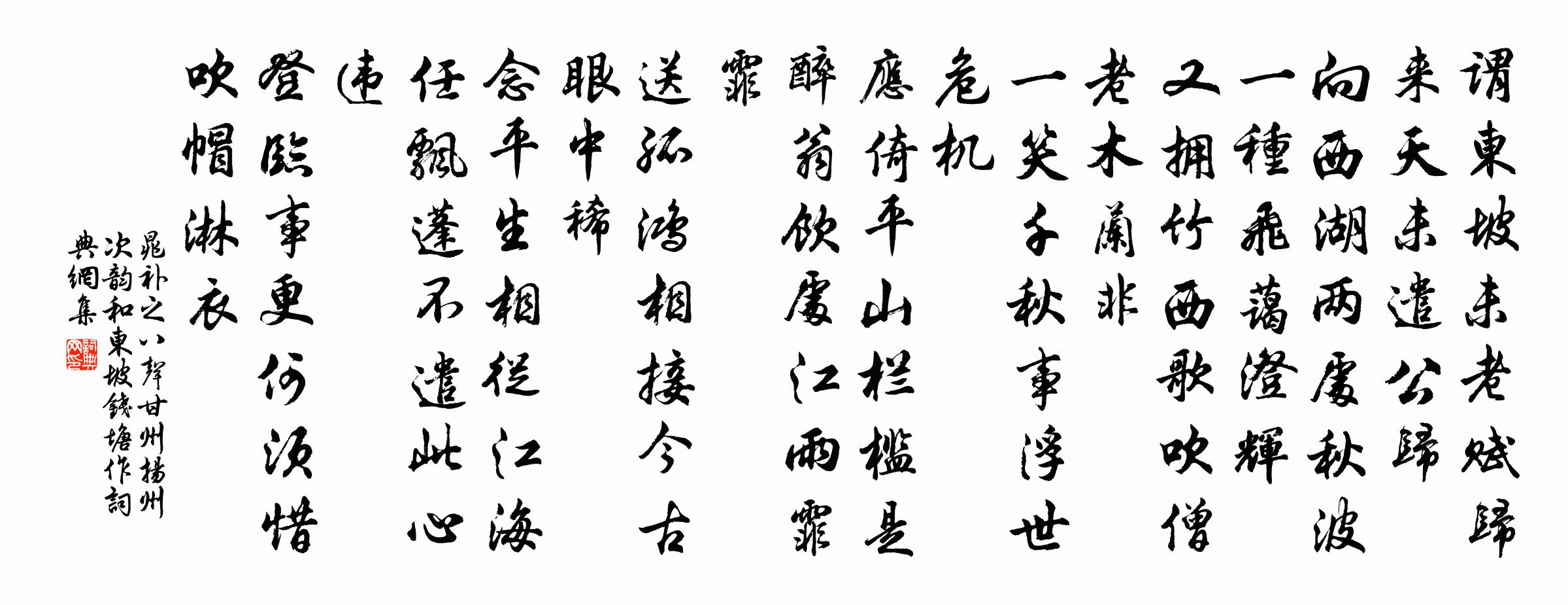 謂東坡、未老賦歸來,天未遣公歸。向西湖兩處秋波一種,飛藹澄輝。