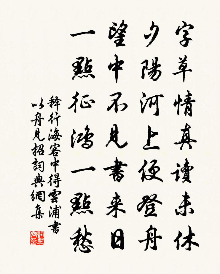 詩詞名句歷史字典書法欣賞書法字典國語詞典說文解字康熙字典古漢語字典標 題 作 者 詩 句 客中得雲浦書以舟見招作者:釋行海 朝代:宋代客中得雲浦書以舟見招原文字草情真讀未休,夕陽河上便登舟。望中不見書來日,一點征鴻一點愁。詩詞問答問:客中得雲浦書以舟見招的作者是誰?答:釋行海問:客中得雲浦書以舟見招寫於哪個朝代?答:宋代釋行海客中得雲浦書以舟見招書法欣賞客中得雲浦書以舟見招書法作品詩詞推薦窮秋對雨錢起〔唐代〕晦日連苦雨,動息更邅回。生事萍無定,愁心雲不開。翟門悲暝雀,墨灶上寒苔。始信宣城守,乘流畏曝腮。挽辛憲若五首徐元傑〔宋代〕十載居間學,瓢泉映潔清。陶潛 * 趣,杜老白鷗盟。雲自無心出,春隨有腳行。知非古巴蜀,使指若為情。秋晚白居易〔唐代〕煙景淡濛濛,池邊微有風。覺寒蛩近壁,知暝鶴歸籠。長貌隨年改,衰情與物同。夜來霜厚薄,梨葉半低紅。和李尚書畫射虎圖歌獨孤及〔唐代〕飢虎呀呀立當路,萬夫震恐百獸怒。彤弓金鏃當者誰,鳴鞭飛控流星馳。居然畫中見真態,若務除惡不顧私。時和落梅風珠簾秀〔元代〕山無數,煙萬縷。憔悴煞玉堂人物,倚篷窗一身兒活受苦。恨不得隨大江東去!詩酒王禹偁〔宋代〕白頭郎吏合歸耕,猶戀君恩典郡城。已覺功名乖素志,祗憑詩酒送浮生。剛腸減後微微諷,病眼昏來細細傾。樽杓偈頌四十一首釋普寧〔宋代〕目前無法,意在目前。東西十萬,南北八千。達磨不來東土,二祖不往西天。點檢將來,只見一邊。明皇祀圜丘樂章。太和佚名〔唐代〕郊壇齋帝,禮樂祀天。丹青寰宇,宮徵山川。神祇畢降,行止重旋。融融穆穆,納祉洪延。和叔父九日後樓集陳普〔宋代〕霞邊鶩表見羅浮,左右東南數十州。天近先看洗光日,地高略數下灘漚。乾坤廣大千峰玉,人物英雄百尺樓。衰暮江神子(夜涼對景)趙長卿〔宋代〕彩雲飛盡楚天空。碧溶溶。一簾風。吹起荷花,香霧噴人濃。明月淒涼多少恨,恨難許,我情鍾。相思魂夢幾時窮戴帥初九日無憀以滿城風雨近重陽為韻七首袖陳著〔宋代〕邇來三五年,處處罹過兵。誰能宴龍山,無復游彭城。今茲九日至,正爾百感生。仰天破帽落,失笑還自驚。天章閣成應制次韻李呂〔宋代〕寶構雲屯珍木才,璇題金榜倚天開。高連 * 非非境,光動星躔兩兩台。上帝圖書開玉府,從臣冠佩繼麟台。詔音冬夜飲散悵然有感宋祁〔宋代〕{拖扌換酉}顏夜酌釂蘭卮,悵憶彫年事半違。雪墅隴雲寒寡色,霜天幌月暗通輝。素書有恨隨鴻遠,蘧夢無成伴送無作上人之四明釋行海〔宋代〕天涯彼此一閒身,同看梅花幾度春。寒怕山川行色近,夜圍燈火別情真。君還西上當何日,我欲東歸示有因。鄉社江村二首董嗣杲〔宋代〕荒村雨過炊煙收,誰擊月下籬根舟。風葉半夜摐摐響,老犬獨吠空江秋。早雪章甫〔宋代〕賤夫流落來淮海,兩紀悠然忘凍餒。烏薪白粲不論錢,近歲山林禁樵採。去年差官打炭窯,淮民畏事誰敢燒。官軍次韻賀子忱春事王之望〔宋代〕老境流年速,春風幾日晴。清尊花下怯,白髮鏡中明。蝴蝶迷幽夢,倉庚愧好聲。良辰一尊酒,鐘鼎可忘情。蝶戀花(春感)黃升〔宋代〕百計留春春不住。褪粉吹香,日日催教去。心事欲憑鶯語訴。流鶯劃地無憑據。綠玉闌乾圍綺戶。一點柔紅,應在次仲庸初冬即事二首裘萬頃〔宋代〕常歲霜天分外晴,一溪如煉浸冰輪。今年風雨寧無夜,誰與溪梅作小春。皇太后合春帖子六首蘇頌〔宋代〕九扈方司啟,潛陽已發春。瑤觴進椒柏,眉壽祝靈椿。名句推薦父兄有惡行,子弟學之則無不肖王永彬《圍爐夜話·第三三則》 使殺生之機,奪予之要在大臣,如是者侵。韓非及後人《韓非子·三守》 綴玉聯珠六十年,誰教冥路作詩仙。李忱《吊白居易》 舊時王謝堂前燕,飛入尋常百姓家。劉禹錫《烏衣巷》 人事有代謝,往來成古今。孟浩然《與諸子登峴山》 不盡眼中青,是愁來時節張元乾《石州慢·寒水依痕》 白日麗飛甍,參差皆可見。謝朓《晚登三山還望京邑》 淡黃楊柳暗棲鴉。玉人和月摘梅花。賀鑄《減字浣溪沙·樓角初銷一縷霞》 月明船笛參差起,風定池蓮自在香。秦觀《納涼》 畫船撐入花深處,香泛金卮。歐陽修《採桑子·荷花開後西湖好》