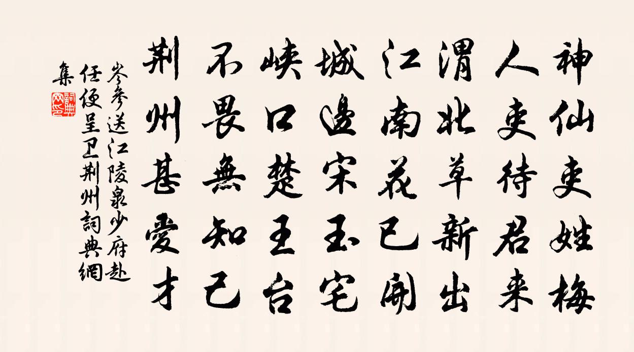 詩詞名句歷史字典書法欣賞書法字典國語詞典說文解字康熙字典古漢語字典標 題 作 者 詩 句 送江陵泉少府赴任,便呈衛荊州作者:岑參 朝代:唐代原文神仙吏姓梅,人吏待君來。渭北草新出,江南花已開。城邊宋玉宅,峽口楚王台。不畏無知己,荊州甚愛才。詩詞問答問:《送江陵泉少府赴任,便呈衛荊州》的作者是誰?答:岑參問:該詩寫於哪個朝代?答:唐代問:岑參的名句有哪些?答:岑參名句大全書法欣賞送江陵泉少府赴任,便呈衛荊州書法作品注釋全唐詩:卷200_70詩詞推薦石頭城李群玉〔唐代〕伯業隨流水,寒蕪上古城。長空橫海色,斷岸落潮聲。八極悲扶拄,五湖來止傾。東南天子氣,掃地入函京。黃花道宋祁〔宋代〕驛道雲山里,悠悠千騎行。猿禽互啼嘯,崖嶺各陰晴。樹合天疑窄,川回地忽平。錦官何日到,菖葉已催耕。早春周弼〔宋代〕連朝微雪暗消凝,始覺春風逐旋增。今早畫檐偏有意,數條吹折曬殘冰。洞仙歌朱彝尊〔清代〕崔微風貌,信十分姚冶。八尺吳綃問誰借。悔丹青不學,殺粉調鉛,呈花面輸與畫工傳寫。乘閒思掛壁,分付裝池竹枝歌孫嵩〔宋代〕峽山削出青嵯峨,峽水勻成綠不波。屯平山林未能得,奈此猿聲朝夕何。久旱得雨項安世〔宋代〕不羨二十四考中書令,不羨萬八千戶冠軍侯,千羨萬羨朝來雨。黃金白璧尚可求,去年大熟市無米。官船載使資他用韻呈明叔趙蕃〔宋代〕白鷗自倚占深灣,亦有幽人此照顏。豈但襟斯非世俗,要知吟嘯奪天慳。江天見處從教闊,松竹栽成不要刪。我若白鳩辭(一作夷則格上白鳩拂舞辭)李白〔唐代〕鏗鳴鐘,考朗鼓。歌白鳩,引拂舞。白鳩之白誰與鄰,霜衣雪襟誠可珍。含哺七子能平均。食不噎,性安馴。首農學詩吟十首方回〔宋代〕我陟匡廬山,想像淵明廬。我游永嘉郡,康樂茲佩魚。學詩六十載,鑽仰二老且。白首恐無成,嗟哉腹空虛。邇來和胡端約岩桂六首蔡戡〔宋代〕萬妃蕊佩影珊珊,沉水薰肌粟玉顏。曾記廣寒呂里見,誰移仙種下人間。袁長官女詩(題峽山僧壁)佚名〔唐代〕剛被恩情役此心,無端變化幾湮沈。不如逐伴歸山去,長笑一聲煙霧深。開孫滿月陸游〔宋代〕夜夢奇童拜且言,今乃幸得生高門。夢後一日得開孫,虎兒墮地百獸奔。未論頭角與眉宇,但聽啼聲誰敢侮!就令七十九吟十首劉克莊〔宋代〕多作惡詩供世笑,晚持孤論誰予同。才名壓倒豁□老,官職火迫乖崖翁。再次前韻蘇頌〔宋代〕巋然華屋四開扉,經構初憑佛大威。最是一州孤絕處,不因嘉客到應稀。凌虛自覺雲梯近,銷暑聊將玉盞飛。人士下邽感舊韋莊〔唐代〕昔為童稚不知愁,竹馬閒乘繞縣游。曾為看花偷出郭,也因逃學暫登樓。招他邑客來還醉,儳得先生去始休。今日句蘇轍〔宋代〕仿佛城南路,繁香撲市橋。象弈各有等級四絕品四人高下文天祥〔宋代〕坐踞河南百戰雄,少年飛槊健如龍。世間只畏兩人在,上有高公下慕容。中奉大夫直徽猷閣致仕邵及之輓詞二首周必大〔宋代〕廉甚仍知止,高風似孔戣。北歸垂橐日,南省掛冠時。清白傳諸子,安閒閱十期。今誰主文字,好繼退之碑。送衢州崔員外薛逢〔唐代〕笑分銅虎別京師,嶺下山川想到時。紅樹暗藏殷浩宅,綠蘿深覆偃王祠。風茅向暖抽書帶,露竹迎風舞釣絲。休指雪庭釋了惠〔宋代〕玉砌曉光寒,家風個樣生。須知平白處,著腳是深坑。名句推薦弟妹蕭條各何在,干戈衰謝兩相催!杜甫《九日五首·其一》 公乎躍馬揚玉鞭,滅沒高蹄日千里。溫庭筠《拂舞詞 / 公無渡河》 談歡則字與笑並,論戚則聲共泣偕劉勰《文心雕龍·誇飾》 亂點碎紅山杏發,平鋪新綠水蘋生。白居易《南湖早春》 千古江山,英雄無覓孫仲謀處。辛棄疾《永遇樂·京口北固亭懷古》 歡言得所憩,美酒聊共揮。李白《下終南山過斛斯山人宿置酒》 悲懷感物來,泣涕應情隕。潘安《悼亡詩三首》 夜中不能寐,起坐彈鳴琴。阮籍《詠懷八十二首·其一》 日照新妝水底明,風飄香袂空中舉。李白《採蓮曲》 天清一雁遠,海闊孤帆遲。李白《送張舍人之江東》