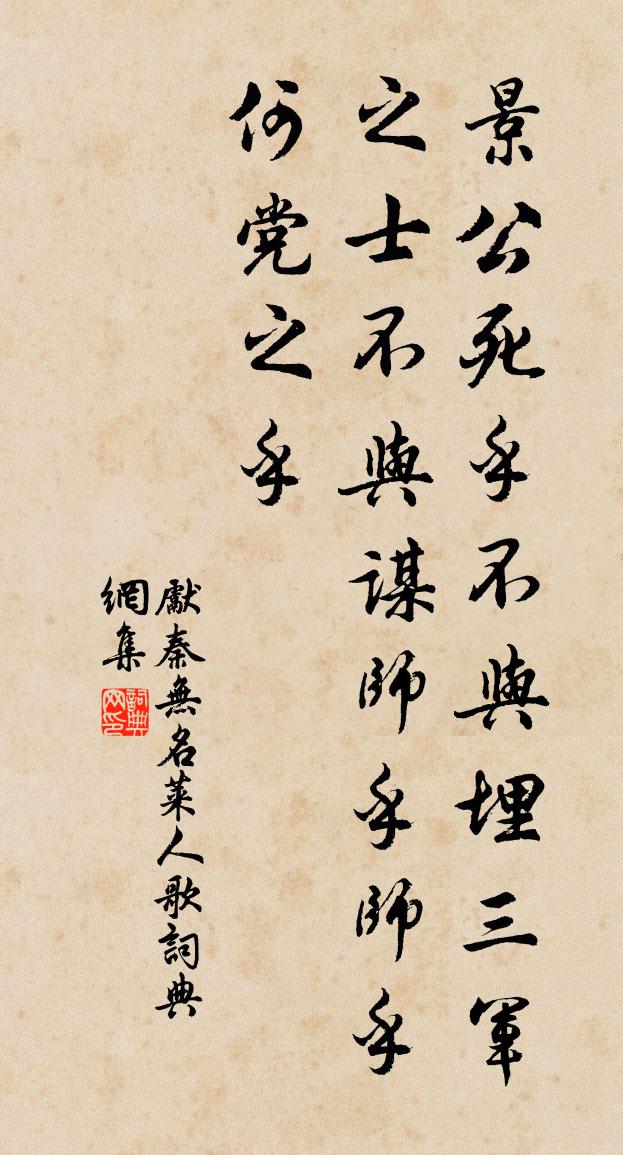 詩詞名句歷史字典書法欣賞書法字典國語詞典說文解字康熙字典古漢語字典標 題 作 者 詩 句 萊人歌作者:先秦無名 朝代:先秦萊人歌原文景公死乎不與埋。三軍之士不與謀。師乎師乎。何黨之乎。詩詞問答問:萊人歌的作者是誰?答:先秦無名問:萊人歌寫於哪個朝代?答:先秦問:萊人歌是什麼體裁?答:樂府先秦無名萊人歌書法欣賞萊人歌書法作品詩詞推薦途中逢李道實游蔡州張祜〔唐代〕征馬漢江頭,逢君上蔡游。野橋經亥市,山路過申州。僻地人行澀,荒林虎跡稠。殷勤話新守,生物賴諸侯。題許公塞驛王之道〔宋代〕遐想清游意欲飛,巢湖西畔碧山圍。高城別後騷人到,小驛春回燕子歸。壁上新詩留醉墨,庭前飛絮點征衣。窮愁滿江紅呂勝己〔宋代〕檀扳頻催,雙拈袖、飛來趁拍。錦裀上、嬌抬粉面,淺蛾脈脈。鸞觀鶯窺秋水淨,鴻驚鳳翥祥雲白。看妖嬈、體態淮上喜雨聊句蘇舜元〔宋代〕江淮經歲旱,春暮忽然雨。亂點逾廣津,散灑入原土。萬物氣稍蘇,厲妖莫能聚。群山洗故塵,紫翠坐可數。昏如梅邊方岳〔宋代〕野人暖入狼頭帽,雪後寒生鶴膝枝。杖屨與峰迴路轉,溪山又物換星移。酒能作崇可忘酒,詩不窮人未是詩。筆走游龍光寺胡大成〔宋代〕香宇依空結,虛軒傍水開。沙明鴻影度,逕靜竹風來。午磬傳清梵,晴花點綠苔。寥寥人境外,宴坐送餘杯。冬至夜宿顒口市李新〔宋代〕寧辭舉棹頻,不覺又黃昏。有感逢冬節,無窮宿水村。客心愁待旦,杯酒強開樽。共祝同歡慶,亨途莫我論。雨二首杜甫〔唐代〕青山澹無姿,白露誰能數。片片水上雲,蕭蕭沙中雨。殊俗狀巢居,曾台俯風渚。佳客適萬里,沈思情延佇。掛帆和富公權宗丞十站王之道〔宋代〕嗟予少也戇無奇,才力而今老更衰。文陣異時逢大敵,猶能斬將復搴旗。及第胡則〔宋代〕金榜名傳四海知,太平時合稱男兒。五言似劍裁鱗角,七字如刀斫桂枝。御苑得題朝帝日,家鄉佩印拜親時。小花送青神宰樊允南解官次杜應求韻史堯弼〔宋代〕從昔安平易,無心問疾遲。才知中自守,不逐世多岐。赫赫寧期譽,悠悠去有思。豐碑人口是,看取祖行詩。題法華山天衣寺曾會〔宋代〕十里湖光十里松,松陰路到十高峰。窗看渡口隨湖月,樓聽雲門度嶺鍾。梁帝缽含山雨潤,普賢台鏁蘚花重。誰人月下笛張炎〔宋代〕萬里孤雲,清游漸遠,故人何處。寒窗夢裡,猶記經行舊時路。連昌約略無多柳,第一是、難聽夜雨。謾驚回淒悄晚行青村李公明〔宋代〕關關新鳥逐聲啼,群鷺沖寒帖水飛。最恨山雲去如織,不教春色著征衣。追懷曾文清公呈趙教授趙近嘗示詩陸游〔宋代〕憶在茶山聽說詩,親從夜半得玄機。常憂老死無人付,不料窮荒見此奇。律令合時方帖妥,工夫深處卻平夷。人間送何萬下第歸蜀二首司馬光〔宋代〕十上終無就,才高定復論。清時守儒術,白首在丘園。遠樹隱殘日,孤煙生暮村。揚鞭萬里去,幾許不銷魂。登賞心亭陸游〔宋代〕蜀棧秦關歲月遒,今年乘興卻東遊。全家穩下黃牛峽,半醉來尋白鷺洲。黯黯江雲瓜步雨,蕭蕭木葉石城秋。孤臣北窗梧葉坐間落四五有感陸游〔宋代〕高梧一葉脫,便覺秋不遠。晨起發滿梳,梧衰孰雲晚。古來追電足,歷塊或小踠。金鼓譟陣間,此任豈駑蹇。女子句王逸〔宋代〕他年館閣同游處,榮路方蹤繼二孫。題南寺吟軒李新〔宋代〕市聲幽鳥幾相呼,指點前村認有無。初見江山懷子美,更因樓閣夢姑蘇。慣看渡口飛桃葉,細結籬根護木奴。蹙得名句推薦丹陽城南秋海陰,丹陽城北楚雲深。王昌齡《芙蓉樓送辛漸二首》 典盡客衣三尺雪,煉精詩句一頭霜。王建《維揚冬末寄幕中二從事》 棗花至小能成實,桑葉雖柔解吐絲。王溥《詠牡丹》 花似伊。柳似伊。花柳青春人別離。歐陽修《長相思·花似伊》 亂鴉三四點,愁坐話無憀。陳維崧《臨江仙·寒柳》 人告之以有過則喜。孟子《孟子·公孫丑章句上·第八節》 亂則國危,治則國安。荀子《荀子·王霸》 江闊雲低、斷雁叫西風。蔣捷《虞美人·聽雨》 為奏薰琴唱,仍題寶劍名。張九齡《奉和聖制送尚書燕國公赴朔方》 籌邊獨坐,豈欲登覽快雙眸。戴復古《水調歌頭·題李季允侍郎鄂州吞雲樓》
