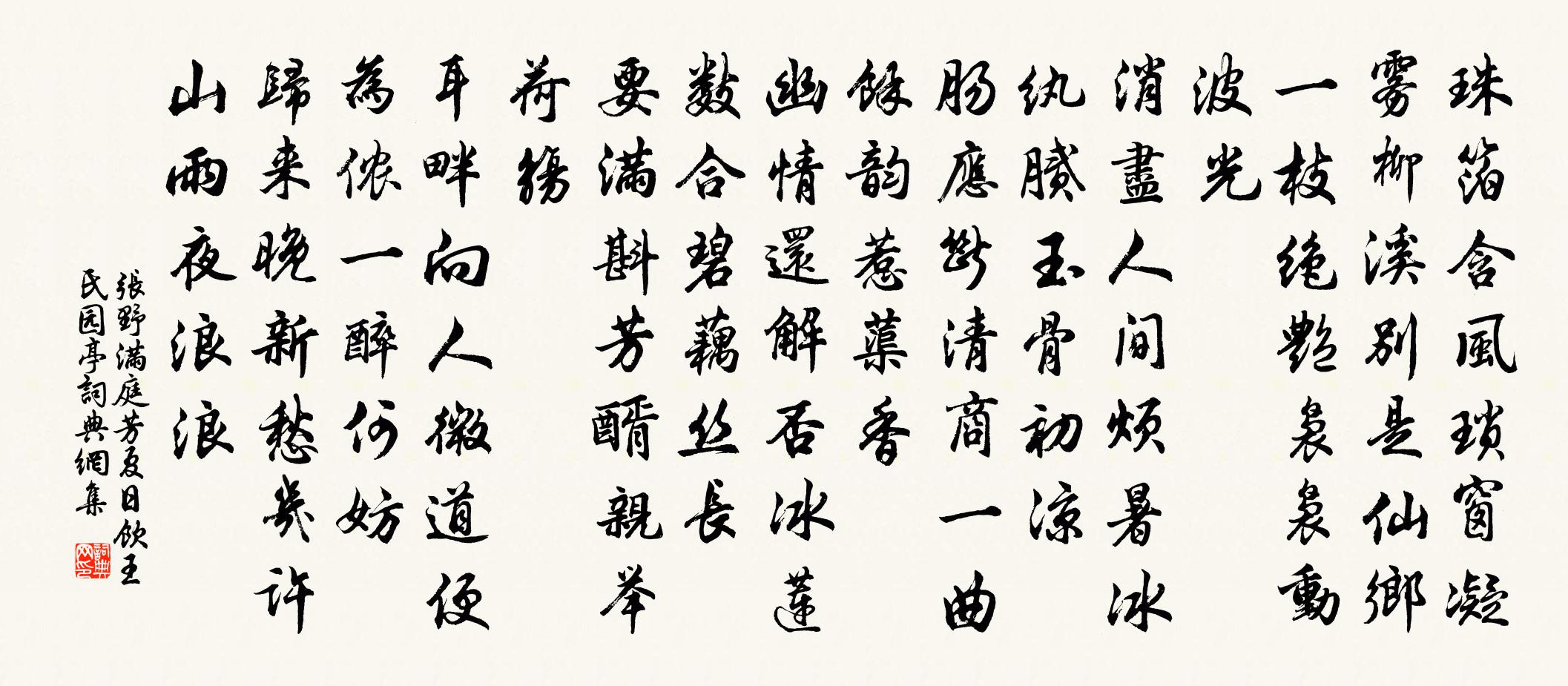 詩詞名句歷史字典書法欣賞書法字典國語詞典說文解字康熙字典古漢語字典標 題 作 者 詩 句 滿庭芳 夏日飲王氏園亭作者:張野 朝代:元代滿庭芳 夏日飲王氏園亭原文珠箔含風,瑣窗凝霧,柳溪別是仙鄉。一枝絕艷,裊裊動波光。消盡人間煩暑,冰紈膩、玉骨初涼。腸應斷,清商一曲,餘韻惹蕖香。幽情還解否,冰蓮數合,碧藕絲長。要滿斟芳醑,親舉荷觴。耳畔向人微道,便為儂、一醉何妨。歸來晚,新愁幾許,山雨夜浪浪。詩詞問答問:滿庭芳 夏日飲王氏園亭的作者是誰?答:張野問:滿庭芳 夏日飲王氏園亭寫於哪個朝代?答:元代問:滿庭芳 夏日飲王氏園亭是什麼體裁?答:詞張野滿庭芳 夏日飲王氏園亭書法欣賞滿庭芳 夏日飲王氏園亭書法作品詩詞推薦懷古亭范成大〔宋代〕朝來寫得故人書,雙鯉難尋雁亦無。付與離堆江水去,解從郫縣到成都。皇太后閣六首蘇軾〔宋代〕寶冊瓊瑤重,新庭松桂香。雪消春未動,碧瓦麗朝陽。和宋宰立春雨虞儔〔宋代〕鏡里朱顏一寸埃,感時懷抱向誰開。典衣餖飣盤心菜,貰酒留連眼底梅。三月鶯花勞問訊,幾家幡勝帶能回。新來酬皇甫賓客白居易〔唐代〕閒官兼慢使,著處易停輪。況欲逢新歲,仍初見故人。冒寒尋到洛,待暖始歸秦。亦擬同攜手,城東略看春。寄東麓趙贊府二首楊公遠〔宋代〕佐邑{左氵右貲}陽綽有聲,文章政事冠群英。南牆松想乘閒詠,北海樽聞已戒傾。橫笛倚樓襟度逸,攜琴帶鶴宦夏日訪友唐彥謙〔唐代〕堤樹生晝涼,濃陰撲空翠。孤舟喚野渡,村疃入幽邃。高軒俯清流,一犬隔花吠。童子立門牆,問我向何處?主人擬古黃庚〔宋代〕山中怪物變,草木自四時,秋水照短髮,血氣日已衰。寒藤不知枯,青表上疏籬。繁陰縱有托,已迫風霜期。餘生鷓鴣天(腹疾困睡和朱希真詞)劉克莊〔宋代〕前度看花白髮郎。平生痼疾是清狂。幸然無事污青史,省得教人奏赤章。遊俠窟,少年場。輸他群謝與諸王。居人鶴沖天(張仲宗以秋香酒見寄並詞,次其韻)李彌遜〔宋代〕篘玉液,釀花光。來趁北窗涼。為君小摘蜀葵黃。一似嗅枝香。飲中仙,山中相。也道十分宮樣。一般時候最宜嘗夜坐張嵲〔宋代〕地爐火暖壁燈青,虛閣風驚鐸亂鳴。門掩上方山月黑,北窗危坐聽松聲。吳少由惠詩百篇久未及謝又以委貺勉次來韻樓鑰〔宋代〕江左一世稱名公,首出劉惔與王-濛。自高直以天自況,何止數仞言高墉。虛聲一傳實何在,但知景附而風從。我秋晚舟泊桐江趙湘〔唐代〕嚴子陵邊水自流,夕陽無語倚松舟。乍逢風月羞為客,及到溪山識盡秋。移樹斷蟬初過雨,立沙孤雁偶隨鷗。鄉心道州途中即事呂溫〔唐代〕零桂佳山水,滎陽舊自同。經途看不暇,遇境說難窮。疊嶂青時合,澄湘漫處空。舟移明鏡里,路入畫屏中。岩壑道士步虛詞 七庾信〔南北朝〕道生乃太乙。守靜即玄根。中和煉九氣。甲子謝三元。居心受善水。教學重香園。鳧留報關吏。鶴去畫城門。更以山中寄友人杜荀鶴〔唐代〕深山多隙地,無力及耕桑。不是營生拙,都緣覓句忙。破窗風翳燭,穿屋月侵床。吾友應相笑,辛勤道未光。漫興二首劉克莊〔宋代〕身似著冠狂賀監,面如留髮老盧能。無丹灶地燒鉛汞,有海潮音話葛藤。龍象聾觀俱讚嘆,犬雞痴望共飛升。門前鳲鳩連文鳳〔宋代〕時兮呼婦來,時兮驅婦去。呼來知天晴,驅去知天雨。一去或一來,非為新與故。白雲變蒼狗,人事何錯迕。不念寄張郎中文同〔宋代〕常慚無才動有權,十年鄉里但留連。養成答颯人應笑,學得支離自謂賢。三館舊遊層漢上,一麾今守亂峰前。幸逢寄梅臞胡仲參〔宋代〕別去忽經旬,春風閱二分。幾番吟對雨,獨自暗思君。客里加頻病,愁邊駭近聞。倚欄商不得,心目亂於雲。覽夢得所藏李伯時畫吳中三賢像因各書絕句趙楷〔宋代〕杞菊蕭條繞屋春,不教鵝鴨惱比鄰。滿身花影猶沈醉,真是江湖一散人。名句推薦花開紅樹亂鶯啼,草長平湖白鷺飛。徐元傑《湖上》 留連光景惜朱顏,黃昏獨倚闌。李煜《阮郎歸·呈鄭王十二弟》 莫遣只輪歸海窟,仍留一箭射天山。李益《塞下曲》 失之東隅,收之桑榆。范曄《後漢書·列傳·馮岑賈列傳》 父為考,母為妣。佚名《爾雅·釋親》 山城過雨百花盡,榕葉滿庭鶯亂啼。柳宗元《柳州二月榕葉落盡偶題》 日光下澈,影布石上,佁然不動;柳宗元《小石潭記》 今夕不登樓,一年空過秋。高觀國《菩薩蠻·何須急管吹雲暝》 梅子留酸軟齒牙,芭蕉分綠與窗紗。楊萬里《閒居初夏午睡起》 那年離別日,只道住桐廬。劉采春《囉嗊曲·那年離別日》