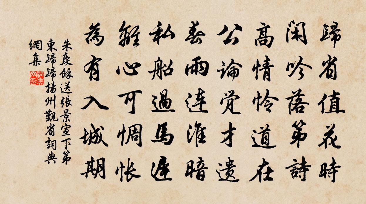 詩詞名句歷史字典書法欣賞書法字典國語詞典說文解字康熙字典古漢語字典標 題 作 者 詩 句 送張景宣下第東歸(歸揚州覲省)作者:朱慶餘 朝代:唐代原文歸省值花時,閒吟落第詩。高情憐道在,公論覺才遺。春雨連淮暗,私船過馬遲。離心可惆悵,為有入城期。詩詞問答問:《送張景宣下第東歸(歸揚州覲省)》的作者是誰?答:朱慶餘問:該詩寫於哪個朝代?答:唐代書法欣賞送張景宣下第東歸(歸揚州覲省)書法作品注釋全唐詩:卷514-29詩詞推薦漁家傲佚名〔宋代〕天涯。理性本來長自在。靈通昭徹光無礙。因被無明風惱害。真如海。等床吹動波千派。五蘊山頭雲靉靆。遮藏心奉答張寺丞再招游薛園韓維〔宋代〕名都富游踐,所歷多異境。貪奇事穹覽,一過不再省。茲園獨勤來,三盡晝刻永。目清林葉淨,耳快石泉冷。如錢聽田順兒歌白居易〔唐代〕戛玉敲冰聲未停,嫌雲不遏入青冥。爭得黃金滿衫袖,一時拋與斷年聽?短歌行唐寅〔明代〕樽酒前陳,欲舉不能。感念疇昔,氣結心冤。日月悠悠,我生告遒。民言無欺,秉燭夜遊。昏期在房,蟋蟀登當。筍陳普〔宋代〕書窗媚幽獨,萬竹真我儀。冰霜茂摧挫,生意自有時。斐亹弄月陰,挺拔出風姿。鳳吟逐神郁,春筍效珍奇。山林范百嘉百歲昆仲輓詞二首蘇轍〔宋代〕季子尤高爽,顏家早哭回。白頭生便爾,黃壤遽相催。舊草誰收拾,新松利插栽。悲傷有伯氏,諸子尚嬰孩。富春至嚴陵山水甚佳紀昀〔清代〕濃似春雲淡似煙,參差綠到大江邊。斜陽流水推蓬坐,翠色隨人慾上船。采菖蒲釋文珦〔宋代〕雁盪高寒處,穿雲採得來。豈能同野草,容易有花開。瘦節偏宜石,纖叢不受埃。幽人知爾性,曉澗汲泉杯。娟峰陳造〔宋代〕當年金華小家兒,神遊九天狹八維。房陵之山秀而奇,蔚藍一山群山推。兒肯下顧停軿輜,珠貝作宮瓊門楣。門前和進櫻桃上宜諭近臣洛中今年進櫻桃甚大當是李復〔宋代〕四月櫻桃始爛紅,拜章馳驛歲常同。留都舊事修邦貢,薦廟清朝廣孝風。翠籠摘從西後宛,彩奩進入大明宮。近臣過京口以南見竹林楊萬里〔宋代〕行從江北別梅兄,歸到江南見竹君。卻憶西湖湖上寺,梅花如雪竹如雲。喜遷鶯(守歲)史浩〔宋代〕雪消春淺。聽爆竹送窮,椒花待旦,系馬合簪,鳴鴉列炬,幾處玳筵開宴。介我百千眉壽,齊捧玉壺金盞。最奇絕題中川張氏所居薛嵎〔宋代〕鷗鳥往來處,此翁甘隱淪。地因人物著,名入郡圖新。夜月情懷淡,茅茨意態真。高風無識拔,老卻採薇身。主薦後喧訟不已宋庠〔宋代〕昔賁丘園聘,今嗟勢利趨。何嘗輕九九,自欲較銖銖。鉤百勞筋敗,朝三怒氣粗。因聲謝鄉校,真賞愧非夫。送朱扆釋希晝〔宋代〕別業滄波外,秋風歸去心。玉繩天闕遠,金柝海城深。素瑟沈幽意,寒螿共苦吟。鄰漁知有約,乘月夜相尋。贈唐衢韓愈〔唐代〕虎有爪兮牛有角,虎可搏兮牛可觸。奈何君獨抱奇材,手把鋤犁餓空谷。當今天子急賢良,匭函朝出開明光。胡不送羅機宜秩滿東歸三首項安世〔宋代〕風髯飛動儼長身,縹緲襟期不受塵。豈是契然忘應物,亦知蕞爾漫勞人。若非事業驚當仁,也合文章作近臣。此外春日雜興王同祖〔宋代〕迢迢清夜靜無嘩,月色千門噪亂鴉。坐久忽驚寒力重,不知殘雪在梅花。蜀路二首張說〔唐代〕雲埃夜澄廓,山日曉晴鮮。葉落蒼江岸,鴻飛白露天。磷磷含水石,冪冪覆林煙。客心久無緒,秋風殊未然。徭蜀句釋擇璘〔宋代〕弔古有心懷短李,拂塵無力看豐碑。名句推薦於事事物物上求至善,卻是義外也。王陽明《傳習錄·卷上·徐愛錄》 榮寵有初,鮮有終者;吉凶無常,智者少禍。來俊臣《羅織經·固榮卷第六》 酹酒蒼茫,倚歌平遠,亭上玉虹腰冷。吳文英《十二郎·垂虹橋》 長恨去年今夜雨,灑離亭。晏幾道《愁倚闌令·花陰月》 春已歸來,看美人頭上,裊裊春幡。辛棄疾《漢宮春·立春日》 大風起兮雲飛揚。威加海內兮歸故鄉。安得猛士兮守四方!劉邦《大風歌》 畫虎畫皮難畫骨,知人知面不知心。佚名《增廣賢文·上集》 棹動芙蓉落,船移白鷺飛。蕭綱《採蓮曲》 又似賈客蜀道間,千鐸萬磬鳴空山牛殳《琵琶行》 松花釀酒,春水煎茶。張可久《人月圓·山中書事》
