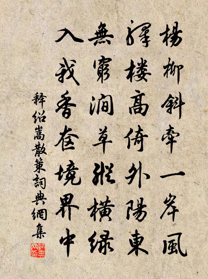 詩詞名句歷史字典書法欣賞書法字典國語詞典說文解字康熙字典古漢語字典標 題 作 者 詩 句 散策作者:釋紹嵩 朝代:宋代散策原文楊柳斜牽一岸風,驛樓高倚外陽東。無窮澗草縱橫綠,入我香奩境界中。詩詞問答問:散策的作者是誰?答:釋紹嵩問:散策寫於哪個朝代?答:宋代釋紹嵩散策書法欣賞散策書法作品詩詞推薦藥水岩李新〔宋代〕岩前曾考腐斤樵,洞裡仙人不可招。龍睡有時慳小雨,春長無地覓靈苗。與攻中散平時懶,更沃文園異日消。調鼎傷春四首張耒〔宋代〕嫩紫妖紅惜不得,亂隨風雨點蓬蒿。荒田野草花開晚,主管春光輸爾曹。幽居三詠誠齋楊萬里〔宋代〕浯溪見了紫岩回,獨笑春風盡放懷。謾向世人談昨夢,便來喚我作誠齋。題傅侍郎寒碧十五韻淨涼陳宓〔宋代〕何物擢仙質,天然契吾性。不染濁水泥,明月水中映。只許此君看,風清雨娟淨。簡康侄求先君石山劉學箕〔宋代〕見好山如見高人,遯世冀繭清淨身。見拳石如接佳友,手摩挲愛逾瓊玖。我生嗜好不有冗長物,寓意蕭閒祗在青山送李緗盧綸〔唐代〕舊國仍連五將營,儒衣何處謁公卿。波翻遠水蒹葭動,路入寒村機杼鳴。嵇康書論多歸興,謝氏家風有學名。為問春日雜言十一首趙蕃〔宋代〕買得荒園近塢居,但供樵牧廢犁鋤。漫營籬落今將合,猶恨人工乏剩餘。過衢阻潦宿民家陳杰〔宋代〕暮程聞潦漲,投宿取村斜。涼借保方雨,香來隔浦花。翁分區種粒,婦進圃抽芽。官驛應無此,通宵夢亦佳。送西秦張仲實游大滌洞天林昉〔宋代〕此時仙興發,九鎖訪名峰。玉洞晝飛鼠,石池春浴龍。異人花外見,道士酒邊逢。余欲采芳茗,白云何所從。元日梅堯臣〔宋代〕昔遇風雪時,孤舟泊吳埭。江潮未應浦,盡室坐相對。行庖得海物,鹹酸何瑣碎。久作北州人,食此欣已再。是時寒食離白沙張耒〔宋代〕莫驚客路已經年,尚有青春一半妍。試上芳堤望春野,萬絲楊柳拂晴天。失調名佚名〔宋代〕□□□□□金縷。探聽春來處。三九十九日過松江五絕汪莘〔宋代〕薰風吹夢聽新蟬,又向長橋艤釣船。好剪吳松半江水,袖歸三十六峰前。潤州水樓楊凌〔唐代〕歸心不可留,雪桂一叢秋。葉雨空江月,螢飛白露洲。野蟬依獨樹,水郭帶孤樓。遙望山川路,相思萬里游。過清遠大家峽章才邵〔宋代〕岩頭風急樹欹斜,溪畔漁樵十數家。老盡往來名利客,年年秋水映蘆花。桃源憶故人馬鈺〔元代〕馬風得遇修仙舉。不羨人間富貴。築個環牆居住。且避風霜雨。靈光晝夜常修補。異日功成歸去。得住蓬萊洞府。句朱景玄〔唐代〕塞鴻先秋去,邊草入夏生。句姚揆〔唐代〕獨上西樓四望賒。次韻徐贊府蜚英八首方回〔宋代〕騎入州城出縣城,不須人送不須迎。連峰峻岭崎嶇極,政自胸中掌樣平。贈王仙柯中寤〔唐代〕瞻思不及望仙兄,早晚升霞入太清。手種一株松未老,爐燒九轉藥新成。心中已得黃庭術,頭上應無白髮生。異日名句推薦吾本乘興而行,興盡而返,何必見戴!劉義慶《世說新語·任誕》 又說今夕天津,西畔重歡遇。吳文英《荔枝香近·七夕》 獨立寒秋,湘江北去,橘子洲頭。 * 《沁園春·長沙》 客路青山外,行舟綠水前。王灣《次北固山下》 愁絕行人天易暮,行向鷓鴣聲里住納蘭性德《菊花新·用韻送張見陽令江華》 獨寫菖蒲竹葉杯,蓬城芳草踏初回。湯顯祖《午日處州禁競渡》 賈傳自憐多感慨,東門何意泥孤虛。王惲《送姬仲實隱士北還》 學如不及,猶恐失之。孔子弟子《論語·泰伯篇》 空山梵唄靜,水月影俱沉。納蘭性德《水調歌頭·題西山秋爽圖》 不將辛苦意,難近世間財。馮夢龍《醒世恆言·卷十四》