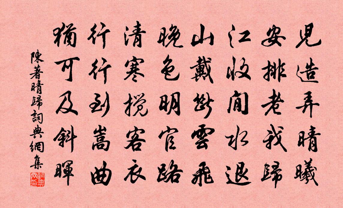 詩詞名句歷史字典書法欣賞書法字典國語詞典說文解字康熙字典古漢語字典標 題 作 者 詩 句 晴歸作者:陳著 朝代:宋代晴歸原文兒造弄晴曦,安排老我歸。江收閒水退,山戴斷雲飛。晚色明官路,清寒攪客衣。行行到嵩曲,猶可及斜暉。詩詞問答問:晴歸的作者是誰?答:陳著問:晴歸寫於哪個朝代?答:宋代陳著晴歸書法欣賞晴歸書法作品詩詞推薦答暢校書當韋應物〔唐代〕偶然棄官去,投跡在田中。日出照茅屋,園林養愚蒙。雖雲無一資,樽酌會不空。且忻百穀成,仰嘆造化功。出入人雁吟張翥〔元代〕雁飛渡江謀稻梁,江人趁熟亦渡江。雁下江中唼苹藻,人飢盡屬江中央。天長水闊羅網多,無衣無食可奈何?人聲宮詞四首吳百生〔宋代〕鈞樂雲中動,鑾輿天上行。百花齊醉日,孤月獨明更。不漏頻催酒,金爐細結甍。春秋有常幸,日日調清平。燭下梅花二首楊萬里〔宋代〕燭下一枝梅,欲開猶未開。渾如玉冠子,戴月上瓊台。興善寺貝多樹張喬〔唐代〕還應毫末長,始見拂丹霄。得子從西國,成陰見昔朝。勢隨雙剎直,寒出四牆遙。帶月啼春鳥,連空噪暝蜩。遠根禪人並化主寫真求贊釋正覺〔宋代〕無言而言,默徹其源。無用而用,虛含其動。理窟之窮通,智機之變弄。夕陽洲渚白鷗盟,韶晝園林蝴蝶夢。喜晴放海棠袁說友〔宋代〕春日海棠早,媚雲開遠嵐。醉容猶未足,睡態已微酣。嫩綠千枝襯,殷紅一點含。東君真有助,落筆為渠談。題張元德著作春秋解二首劉克莊〔宋代〕白頭召寘石渠中,將析微言合異同。靈壽不扶漢庭上,儒衣空立魯門東。誰雲丞相知殷侑,漫費君王遣所忠。猶覺寄浙西李判官杜牧〔唐代〕燕台上客意何如?四五年來漸漸疏。直道莫拋男子業,遭時還與故人書。青雲滿眼應驕我,白髮渾頭少恨渠。唯念述野人語陸游〔宋代〕重重大布敵風霜,籬外桑陰五月涼。軟飯一盂千萬足,那知世有郭汾陽。寄內及兒女二首趙蕃〔宋代〕誰令未得歸,不解忍長飢。歲晏得無感,書來何況遲。雁聞傷北客,梅動是南枝。悵望山庵竹,青青獨守墀。荷花楊巽齋〔宋代〕翠蓋紅幢耀日鮮,西湖佳麗會群仙。波平十里舖雲錦,風度清香趁畫船。出山相釋道沖〔宋代〕天上星,眼中睛。星無悟人之意,睛無矚物之情。以理而會,自誠而明,究竟何曾有道成。挽潛齋王樞相王柏〔宋代〕忠簡流餘慶,文忠印此心。詞章傳世早,事業得君深。不盡風雲會,寧知歲月侵。九重驚殄瘁,讒言舌方瘖。朝回遊城南白居易〔唐代〕朝退馬未困,秋初日猶長。回轡城南去,郊野正清涼。水竹夾小徑,縈迴繞川崗。仰看晚山色,俯弄秋泉光。青松春遊司馬光〔宋代〕人物競紛華,驪駒逐鈿車。此時松與柏,不及道傍花。游金嶴趙園賦海棠梨花呈留宰陳傅良〔宋代〕海棠故作十分紅,梨更超然與雪同。文物英華周盛事,風流玄遠晉餘風。詗斛峰李純父右司趙汝騰〔宋代〕衰拙新來領建安,郡齋夜夢繞餘干。東都得爾名節重,西賊聞之心膽寒。海內四賢尚家食,閩中一叟愧空餐。幔亭惜奴嬌(戲同官)辛棄疾〔宋代〕風骨蕭然,稱獨立、群仙首。春江雪、一枝梅秀。小樣香檀,映朗玉、纖縴手。未久。轉新聲、泠泠山溜。曲里傳檜逕曉步二首楊萬里〔宋代〕老檜陰陰夾古城,露叢迎貫日華明。曉涼無個人分卻,一逕深長獨自行。名句推薦但從今、記取楚樓風,裴台月。辛棄疾《滿江紅·漢水東流》 歸師勿掩,窮寇莫追。羅貫中《三國演義·第九十五回》 星垂平野闊,月涌大江流。杜甫《旅夜書懷》 驚風亂颭芙蓉水,密雨斜侵薜荔牆。柳宗元《登柳州城樓寄漳汀封連四州》 漫惹爐煙雙袖紫,空將酒暈一衫青。納蘭性德《浣溪沙·伏雨朝寒愁不勝》 飛錫離鄉久,寧親喜臘初。錢起《送外甥懷素上人歸鄉侍奉》 天蒼蒼,野茫茫。風吹草低見牛羊。佚名《敕勒歌》 快意事過非快意,自古敗名因敗事。佚名《增廣賢文·下集》 人無善志,雖勇必傷。劉安及其門客《淮南子·主術訓》 亦余心之所善兮,雖九死其猶未悔。屈原《離騷》
