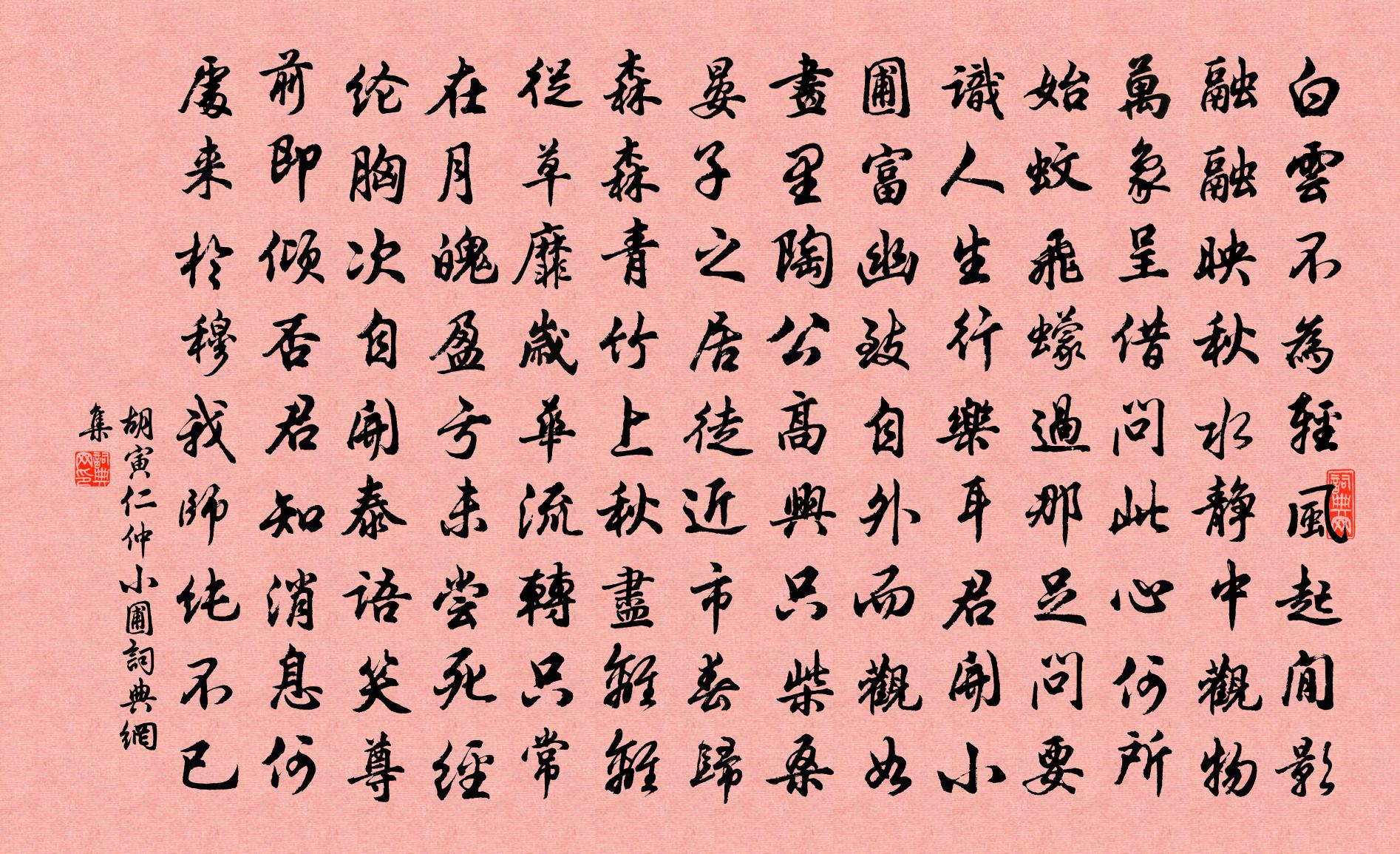 詩詞名句歷史字典書法欣賞書法字典國語詞典說文解字康熙字典古漢語字典標 題 作 者 詩 句 仁仲小圃作者:胡寅 朝代:宋代仁仲小圃原文白雲不為輕風起,閒影融融映秋水。靜中觀物萬象呈,借問此心何所始。蚊飛蠓過那足問,要識人生行樂耳。君開小圃富幽致,自外而觀如畫裡。陶公高興只柴桑,晏子之居徒近市。春歸森森青竹上,秋盡離離從草靡。歲華流轉只常在,月魄盈虧未嘗死。經綸胸次自開泰,語笑尊前即傾否。君知訊息何處來,於穆我師純不已。詩詞問答問:仁仲小圃的作者是誰?答:胡寅問:仁仲小圃寫於哪個朝代?答:宋代胡寅仁仲小圃書法欣賞仁仲小圃書法作品詩詞推薦二月十四日曉起看海棠八首楊萬里〔宋代〕晚得看花訣,丁寧趁絕農。乘他醉眠起,別是一精神。居室姜特立〔宋代〕居室要須存野意,不求輪奐炳丹青。王侯第宅他崇貴,麋鹿山林我性靈。塗山寺獨游白居易〔唐代〕野逕行無伴,僧房宿有期。塗山來去熟,唯是馬蹄知。郭氏山林十六詠壺天閣陸游〔宋代〕吾廬在目中,日可理輕策。乃知壺中天,端勝縮地脈。野亭楊維楨〔元代〕孟郊得野趣,野有真曜廬。魏先得野趣,野有野堂居。雲間沈東氏,■草衣野夫。東屯田可種,西壤水可漁。門無偈傾一百六十九首釋智朋〔宋代〕坐一走七,橫三豎四。大方量人,全身擔負。普化鈴鐸,楊岐驢子。題鶴林寺僧舍李涉〔唐代〕終日昏昏醉夢間,忽聞春盡強登山。因過竹院逢僧話,又得浮生半日閒。誰將王安石〔宋代〕誰將石黛染春潮,復捻黃金作柳條。西崦東溝從此好,筍輿追我莫辭遙。對雪小吟次前韻陳造〔宋代〕翻鴉啅鵲暝爭棲,舞絮郊原雪冰泥。已綴瓏璁分檜柏,並揚光彩賁榱題。{後然}須句好無前勇。索酒人歸有後迷益公和白花青綠牡丹王字韻詩楊萬里〔宋代〕渠是花中異姓王,平園小試染花方。冰霜洗出春風面,翡翠輕棱疊雪裳。夜領素娥酌青女,曉看國色帶天香。更將喜劉伯宣尚書至五首方回〔宋代〕湖海襟期落,山林骨相寒。自慚知道晚,未覺忍窮難。缺米臨炊糴,逢花就擔看。尚能中酒聖,肯諱作詩酸。自貺李商隱〔唐代〕陶令棄官後,仰眠書屋中。誰將五斗米,擬換北窗風。淮上早發蘇軾〔宋代〕澹月傾雲曉角哀,小風吹水碧鱗開。此生定向江湖老,默數淮中十往來。靈照看日早晚圖贊釋心月〔宋代〕明暗雙雙機奪機,阿爺手裡覓便宜。果然老底能輕信,輸卻日輪當午晚。二月八日二首劉克莊〔宋代〕龜筴皆雲二月佳,愁眉攢定幾曾開。不如腐草成螢爝,絕似明珠隔蚌胎。啖月蟆何嘗礫死,銜泥燕卻已歸來。清羸贈成都魯講書樓鑰〔宋代〕君家江發源,我生瀛之壖。相望萬里外,中間幾山川。近聞今子敬,文價驚鸞鵷。何由夢見之,失喜瞻在前。幅巾題嚴陵瀟灑亭徐元傑〔宋代〕天遣溪山付客星,翠屏中界玉澄泓。無邊瀟灑寸心遠,有分登臨雙眼明。淨洗胸中參范老,細於詩里勘元英。千年減字木蘭花沈瀛〔宋代〕工夫莫止。脫得殼兒方是喜。不識真風。只說雙關夾脊通。氤氳似酒。元氣本同天地壽。君可能何。一躍紅樓好處賀黃少府受辟釋紹嵩〔宋代〕天下無雙雙井黃,妙齡聯轡戰文場。東南一尉癯負外,請試君方肘後方。崔愨畫雙鵝引雛張鎡〔宋代〕橫塘暮煙吹雨來,白鵝叫風雙毰毸。鵝兒力小立未定,依母戀哺忘驚猜。炎歊生欲逃天垓,虛堂有此新圖開。蘆梢名句推薦謫仙何處,無人伴我白螺杯。黃庭堅《水調歌頭·遊覽》 三思而後行。孔子弟子《論語·公冶長篇》 江上晚來堪畫處,釣魚人一蓑歸去。馬致遠《壽陽曲·江天暮雪》 出家人莫說在家話。吳承恩《西遊記·第三十二回》 對望中天地,洞然如刷。史達祖《滿江紅·中秋夜潮》 相知無遠近,萬里尚為鄰。張九齡《送韋城李少府》 音塵遠,楚天危樓獨倚。陸游《月上海棠·斜陽廢苑朱門閉》 上交不諂,下交不瀆佚名《易傳·繫辭傳下·第五章》 雞聲茅店月,人跡板橋霜。溫庭筠《商山早行》 多知而無親,博學而無方,好多而無定者,君子不與。荀子《荀子·大略》