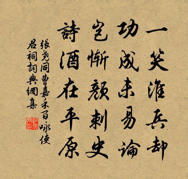 詩詞名句歷史字典書法欣賞書法字典國語詞典說文解字康熙字典古漢語字典標 題 作 者 詩 句 曹嘉禾百詠使君祠作者:張堯同 朝代:宋代曹嘉禾百詠使君祠原文一笑淮兵卻,功成未易論。豈慚顏刺史,詩酒在平原。詩詞問答問:曹嘉禾百詠使君祠的作者是誰?答:張堯同問:曹嘉禾百詠使君祠寫於哪個朝代?答:宋代張堯同曹嘉禾百詠使君祠書法欣賞曹嘉禾百詠使君祠書法作品詩詞推薦題唐師善洪崖圖方回〔宋代〕太白尚不識,洪崖焉肯來。一蹇五獠奴,奸人之所為。得非成方前,獨地雋不疑。至今好仙者,猶為圖畫欺。官宅白居易〔唐代〕紅紫共紛紛,只承老使君。移舟木蘭棹,行酒石榴裙。水色窗窗見,花香院院聞。戀他官舍住,雙鬢白如雲。危見心攜示別去寄謝艾性夫〔宋代〕好客來今雨,長吟出古風。詩神君獨富,文鬼我方窮。湖海飄零外,乾坤感慨中。相逢難袞袞,取別竟匆匆。水調歌頭(中秋)趙長卿〔宋代〕今夕知何夕,秋色正平分。嫦娥此際,底事越樣好精神。已是天高氣肅,那更清風灑灑,萬里沒纖雲。把酒臨風飲遠山吳融〔唐代〕隱隱隔千里,巍巍知幾重。平時未能去,夢斷一聲鍾。同庾信答林法師詩江總〔隋代〕客行七十歲。歲暮遠徂征。塞雲凝不解。隴水凍無聲。君看日遠近。為忖長安城。和遠老韻二首吳芾〔宋代〕欲訪天台帛道猷,夢魂先到石橋頭。箇中直待桃花放,始得從師爛漫遊。漁父詞(其十)趙構〔宋代〕遠水無涯山有鄰。相看歲晚更情親。笛里月,酒中身。舉頭無我一般人。自勉李覯〔宋代〕月欲東生日又西,莫隨兒女醉明時。黃泉一向埋愚鬼,不與人間史筆知。竹張繼先〔宋代〕雨過江皋淨,風來庭檻清。此君故人好,入夜聽秋聲。金城柳馬之純〔宋代〕金城四面柳為營,此日征西路再經。憶昔僅能高咫尺,如今端可拂青冥。清眸漸隔花中霧,綠髮俄懸鏡里星。功業偈傾一百六十九首釋智朋〔宋代〕倒卓須彌,揭翻大海。魚龍變化,禽鳥懽呼。且放佛祖出頭。乘興釋文珦〔宋代〕乘興不拘程,悠悠任意行。小溪橫木渡,何寺遠鐘聲。野茶抽心起,山花照眼明。幽禽亦堪愛,多解自呼名。酬從侄再看詩本(一作酬從侄借詩本)王建〔唐代〕眼暗沒功夫,慵來剪刻粗。自看花樣古,稱得少年無。弟觀喜董稼山至有詩因次韻二首陳著〔宋代〕誤辱高軒訪子云,須知我自是玄真。石心已落千尋海,霜鬢難留一發春。門外道途新舊眼,兵前朋友死生身。如今歸田四時樂春夏二首歐陽修〔宋代〕南風原頭吹百草,草木叢深茅舍小。麥穗初齊稚子嬌,桑葉正肥蠶食飽。老翁但喜歲年熟,餉婦安知時節好。野棠同年秘書丞陳動之輓詞二首歐陽修〔宋代〕場屋當年氣最雄,交遊樽酒涕兄同。文章落筆傳都下,議論生鋒服座中。自古聖賢誰不死,況君門戶有清風。凋零攤破浣溪沙李新〔宋代〕幾度珠簾卷上鉤。折花走馬向揚州。老去不堪尋往事,上心頭。陶令無聊惟喜醉,茂陵多病不勝愁。脈脈春情長不浣溪沙 次韻禮院孟子周僉院秋夜曲二疊虞集〔元代〕天闊秋高 * 長。浮塵消盡霧蒼茫。澄澄孤月轉危牆。金井有聲惟墜露,玉階無色乍疑霜。不聞人語只吟*。幽事陸游〔宋代〕塵抱年來盡掃空,柴門幽事與誰同?水生初漲一溪綠,花落已浮千點紅。愁賴橐泉存舊法,困憑顧渚策新功。故人名句推薦柳梢聽得黃鸝語,此是春來第一聲。楊載《到京師》 行到小溪深處,有黃鸝千百。秦觀《好事近·夢中作》 好風憑藉力,送我上青雲。曹雪芹《臨江仙·柳絮》 塞上秋風鼓角,城頭落日旌旗。元好問《江月晃重山·初到嵩山時作》 虛空落泉千仞直,雷奔入江不暫息。徐凝《廬山瀑布》 肯救人坑坎中,便是活菩薩王永彬《圍爐夜話·第二八則》 正己而不求於人則無怨。上不怨天,下不尤人。子思《中庸·第十四章》 夜來小雨新霽,雙燕舞風斜。万俟詠《訴衷情·送春》 人世幾回傷往事,山形依舊枕寒流。劉禹錫《西塞山懷古》 胡雁哀鳴夜夜飛,胡兒眼淚雙雙落。李頎《古從軍行》