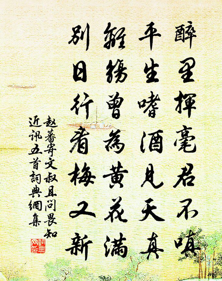 詩詞名句歷史字典書法欣賞書法字典國語詞典說文解字康熙字典古漢語字典標 題 作 者 詩 句 寄文叔且問畏知近訊五首作者:趙蕃 朝代:宋代寄文叔且問畏知近訊五首原文醉里揮毫君不嗔,平生嗜酒見天真。離觴曾為黃花滿,別日行看梅又新。詩詞問答問:寄文叔且問畏知近訊五首的作者是誰?答:趙蕃問:寄文叔且問畏知近訊五首寫於哪個朝代?答:宋代趙蕃寄文叔且問畏知近訊五首書法欣賞寄文叔且問畏知近訊五首書法作品詩詞推薦洞霄宮良泓孫副宮二首岳珂〔宋代〕養生須及早,器破輒難全。鑒止存心地,涵虛詠性天。寓言隨虢虢,至理本淵淵。玩物先觀象,如師況少年。送方楷之官劉克莊〔宋代〕博雅今蕭翼,招延小孟嘗。雖操牙運算元,不廢□□□。秘篋珍儲富,公車薦墨香。惟應猿鶴怨,三載□□房。制乾判院初度載臨謹以梅起興賦三絕句為斯文度正〔宋代〕冰魂玉岳映霜林,四月飛成點點金。遙想清香能止渴,應知此意可為霖。木蘭花令·梧桐葉上三更雨蘇軾〔宋代〕梧桐葉上三更雨。驚破夢魂無覓處。夜涼枕簟已知秋,更聽寒蛩促機杼。夢中歷歷來時路。猶在江亭醉歌舞。尊前偈頌一百四十一首釋師範〔宋代〕今朝九月九,談禪不開口。若是陶淵明,攢眉便回首。籬邊 * 正芬披,一枝兩枝三枝四五六七枝。行香子明本〔元代〕玉殿瓊樓。金鎖銀鉤。總不如、岩谷清幽。 * 紙帳,瓦缽磁甌。卻不知春,不知夏,不知秋。萬事俱休。名利都秦淮官柳二首之一賀鑄〔宋代〕秦淮兩潮西復東,淮邊楊柳酣薰風。送春白花去漠漠,避日黃鳥啼怱怱。陶彭澤多倦官嘆,桓琅邪今衰病翁。此身減字木蘭花尹志平〔元代〕安禪聚落。難免區區閒把捉。聚落安禪。佛祖常憂恐落緣。山林縱臥。無慮無思真快活。縱臥山林。一點靈光無物田家紀事舒岳祥〔宋代〕蒙蒙土霧連三日,父老傳經十七年。蠶月人家多忌諱,麥秋時候好安眠。桑鳩逐婦應嫌雨,社燕依人不避煙。短策西江月蘇軾〔宋代〕點點樓頭細雨,重重江外平湖。當年戲馬會東徐,今日淒涼南浦。莫恨黃花未吐,且教紅粉相扶。酒闌不必看茱萸當可台鄧士將赴類試作詩餞之因效其體郭印〔宋代〕丹山采鳳群鳴集,雲外舒張覽輝翼。錦屏相望不千里,音中簫韶有人識。朝家選舉專一科,翰墨之工拔士多。好將水調歌頭(送叔永文昌)吳潛〔宋代〕才惜季方去,又更別元方。驚心天上雙鳳,接翅下高岡。萬里瞿塘煙浪,一片昭亭雲月,渺渺正相望。夜雨連風壑追和下若大雄寺汪內相陳朝檜詩李洪〔宋代〕斮骨刳心操凜然,盤根厚地老逾堅。八千椿木應同壽,十五堯蓂莫紀年。辱井已荒傷故國,瓊枝無復盜春權。六朝和李二秀才張耒〔宋代〕羨君年少盛遊春,顧我無聊似厄陳。東市車牛泥到領,不勞舉袂障京塵。念奴嬌(廣漢士民送別用韓推官韻為謝)魏了翁〔宋代〕萬人遮道,撥不斷、爭挽房湖逐客。臣罪既盈應九死,全荷君王矜惻。況是當年,曾將愚技,十字街頭立。恩波浩南堂納涼陸游〔宋代〕環坐列胡床,兒曹共此涼。風生桐葉墬,露下稻花香。老幸返初服,窮宜歸故鄉。已無纓可濯,清嘯對滄浪。和子忱惠八月青梅曹勛〔宋代〕神仙聞水部。妙物與長生。鼎飪元滋味,山樊好弟兄。佳音當有象,短韻已馳兵。試咽甘酸處,行看雪裡英。有惠江南帳中香者戲答六言二首黃庭堅〔宋代〕螺甲割崑崙耳,香材屑鷓鴣斑。欲雨鳴鳩日永,下帷睡鴨春閒。詠寒松詩范雲〔南北朝〕修條拂層漢。密葉障天潯。凌風知勁節。負雪見貞心。贈江處士徐仲雅〔唐代〕門在松陰里,山僧幾度過。藥靈丸不大,棋妙子無多。薄霧籠寒徑,殘風戀綠蘿。金烏兼玉兔,年幾奈公何。名句推薦明月淨松林,千峰同一色。歐陽修《自菩提步月歸廣化寺》 海闊山遙,未知何處是瀟湘柳永《玉蝴蝶·望處雨收雲斷》 喜遇重陽,更佳釀今朝新熟。宋江《滿江紅·喜遇重陽》 桂林之一枝,崑山之片玉。房玄齡《晉書·列傳·第二十二章》 少無適俗韻,性本愛丘山。陶淵明《歸園田居·其一》 笑漸不聞聲漸悄,多情卻被無情惱。蘇軾《蝶戀花·春景》 午夢初回,捲簾盡放春愁去。周晉《點絳唇·訪牟存叟南漪釣隱》 仁遠乎哉?我欲仁,斯仁至矣。孔子弟子《論語·述而篇》 風引龍虎旗,歌鐘昔追攀。李白《登邯鄲洪波台置酒觀發兵》 可憐日暮嫣香落,嫁與春風不用媒。李賀《南園十三首》