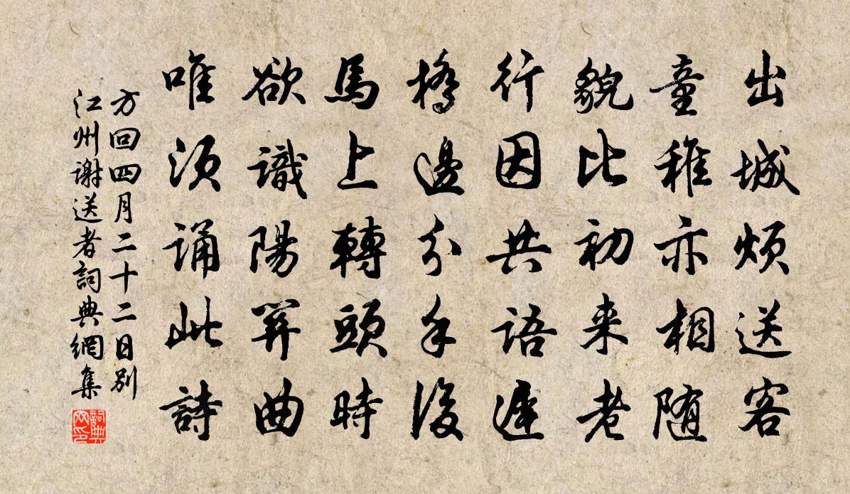 詩詞名句歷史字典書法欣賞書法字典國語詞典說文解字康熙字典古漢語字典標 題 作 者 詩 句 四月二十二日別江州謝送者作者:方回 朝代:宋代四月二十二日別江州謝送者原文出城煩送客,童稚亦相隨。貌比初來老,行因共語遲。橋邊分手後,馬上轉頭時。欲識陽關曲,唯須誦此詩。詩詞問答問:四月二十二日別江州謝送者的作者是誰?答:方回問:四月二十二日別江州謝送者寫於哪個朝代?答:宋代方回四月二十二日別江州謝送者書法欣賞四月二十二日別江州謝送者書法作品詩詞推薦停雲 其三陶淵明〔魏晉〕東園之樹,枝條載榮。競用新好,以招余情。人亦有言,日月於徵,安得促席,說彼平生。故刑部李尚書輓詞三首張九齡〔唐代〕仙宗出趙北,相業起山東。明德嘗為林,嘉謀屢作忠。論經 * 殿,獻賦甘泉宮。與善今何在,蒼生望已空。宿昔感白蓮花白居易〔唐代〕白白芙蓉花,本生吳江濆。不與紅者雜,色類自區分。誰移爾至此,姑蘇白使君。初來苦憔悴,久乃芳氛氳。月月端午連文鳳〔宋代〕相傳楚俗試蘭湯,一枕南薰日正長。門掩綠陰無個事,起來燒過午時香。張夫人輓詞張耒〔宋代〕世德簪纓貴,家風孝友傳。承夫知不忌,愛子故親賢。飄忽人間夢,生平物外緣。諸天清淨報,可但閟重泉。梅詩冥漠子〔宋代〕紅苞紫萼曾欺雪,素艷清香解動人。自有風傳枝上意,肯教蝶見蕊中真。達磨贊釋法薰〔宋代〕孟流到梁朝,不契梁朝意。放過一著,走入魏地。神光謾說安心,未兔失卻一臂。曹娥江邵梅溪〔宋代〕客舟艤盡江頭月,忍聽寒潮聲哽噎。那知江上無情波,總是曹娥眼中血。送稅官仇副使詩十首熊禾〔宋代〕儒道未易行,挽首為祿仕。仕而不得祿,卓哉見廉吏。金陵雜興二百首蘇泂〔宋代〕一曲清溪一首詩,風流千載憶僧施。小姑溪上平安否,容我騎魚作伴嬉。答祖擇之遺新羅墨梅堯臣〔宋代〕海上老松苑,霹靂燒瘦龍。胡人犀皮膠,團煤煙膏濃。色奪陽烏翅,來涉溟渤重。君獲乃為贈,我謬蟲鳥蹤。且作句諶祜〔宋代〕笳鼓宮商塞外歸,似此殊勛古難匹。後來渭上朝正月,尚憶祁連冢中骨。和施耕進士憶竹強至〔宋代〕夫子臥古屋,趣敵岩谷深。六籍環一身,口誦頭不簪。瘦碧久去眼,寂寞清風心。朝思蔭之醉,暮思繞以吟。秋空和伯氏胡宏〔宋代〕為園非是學樊須,鋤罷歸來又讀書。董子不窺緣底事,陶公成趣愛吾廬。華枝瘦日應抬舉,草色回春莫劃除。長遣送舉人徐璋〔宋代〕揭陽多士天下都,聲名籍籍南海隅。往往能騎龍馬駒,唾手可捋於菟須。大食刀聽赤瓠壺,綠沈弓迸金僕姑。太阿好事近(紅梅)韓淲〔宋代〕春色入芳梢,點綴萬枝紅玉。莫道怕愁貪睡,倚新妝如束。紛紛桃李太妖嬈,相對夜闌燭。記取疏花橫處,有暗香引東泉作元結〔唐代〕東泉人未知,在我左山東。引之傍山來,垂流落庭中。宿霧含朝光,掩映如殘虹。有時散成雨,飄灑隨清風。眾源贈楊著(一作著作)徐夤〔唐代〕藻麗熒煌冠士林,白華榮養有曾參。十年去里荊門改,八歲能詩相座吟。李廣不侯身漸老,子山操賦恨何深。釣魚侍宴華光殿曲水奉勑為皇太子作詩 二謝朓〔南北朝〕大橫將屬。會昌已命。國步中徂。宸居膺慶。璽劍先傳。龜玉增映。宗堯有緒。復禹無競。何公橋蘇軾〔宋代〕天壤之間,水居其多。人之往來,如鵜在河。順水而行,雲馳鳥疾。維水之利,千里咫尺。亂流而涉,過膝則止。名句推薦流星透疏木,走月逆行雲。賈島《宿山寺》 已向丹霞生淺暈,故將清露作芳塵。睦石《玉蘭》 雨歇梧桐淚乍收,遣懷翻自憶從頭。納蘭性德《浣溪沙·雨歇梧桐淚乍收》 君子不重則不威,學則不固。主忠信,無友不如己者,過,則勿憚改。孔子弟子《論語·學而篇》 安上治民,莫善於禮。孔子及其弟子《孝經·廣要道》 北風夜卷赤亭口,一夜天山雪更厚。岑參《天山雪歌送蕭治歸京》 須愁春漏短,莫訴金杯滿。韋莊《菩薩蠻·勸君今夜須沈醉》 月兒彎彎照九州,幾家歡樂幾家愁。佚名《月兒彎彎照九州》 乘興南遊不戒嚴,九重誰省諫書函。李商隱《隋宮》 群芳爛不收,東風落如糝歐陽修《春日西湖寄謝法曹歌》