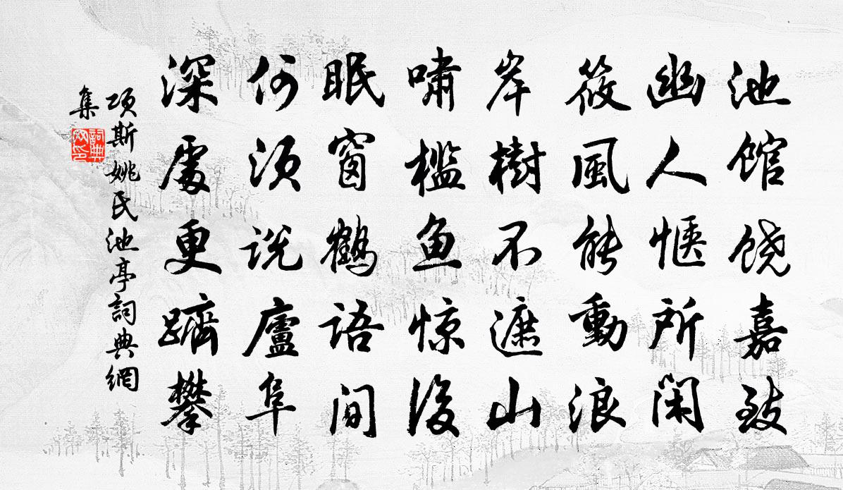 詩詞名句歷史字典書法欣賞書法字典國語詞典說文解字康熙字典古漢語字典標 題 作 者 詩 句 姚氏池亭作者:項斯 朝代:唐代姚氏池亭原文池館饒嘉致,幽人愜所閒。筱風能動浪,岸樹不遮山。嘯檻魚驚後,眠窗鶴語間。何須說廬阜,深處更躋攀。詩詞問答問:姚氏池亭的作者是誰?答:項斯問:姚氏池亭寫於哪個朝代?答:唐代問:姚氏池亭是什麼體裁?答:五律項斯姚氏池亭書法欣賞姚氏池亭書法作品注釋全唐詩:卷554-62詩詞推薦山村經行因施藥陸游〔宋代〕逆旅人家近野橋,偶因秣蹇暫消搖。村翁不解讀本草,爭就先生辨藥苗。枕上作晁說之〔宋代〕年華又已暮,客恨更難裁。寒雁背潮去,鐘聲隨雨來。離騷今我讀,時命昔人哀。但喜歸期近,寧論白髮催。月夜聽琴汪元量〔宋代〕如此良夜,秋空月圓。君彈山鬼,我拊水仙。醉落魄晏幾道〔宋代〕滿街斜月,垂鞭自唱陽關徹。斷盡柔腸思歸切,都為人人,不許多時別。南橋昨夜風吹雪,短長亭下征塵歇。歸時旅遊陸游〔宋代〕壯志蹉跎雪滿頭,久將余日付滄洲。閒雲不入老人夢,鄰笛似知孤客愁。小築聊須傍蘭渚,片帆那復到梓樓?生涯西原曾極〔宋代〕衰草寒雲雁一行,牽愁水似九迴腸。遊人欲問千官事,翁仲無言臥夕陽。和松坡劉迂詩四首廖行之〔宋代〕白雲飛處祝融墟,心切平安一紙書。浪走毛生慚捧檄,清貧羊續漫懸魚。銀蟾浮彩秋尤好,金粟含香桂欲野。指日寄陸郎中姜特立〔宋代〕整整平頭七十春,兩翁可是太陳陳。世間過眼無非故,唯有詩情老更新。同永叔子聰游嵩山賦十二題其二拜馬澗梅堯臣〔宋代〕王子昔凌霓,國人茲拜馬。依稀日夜笙,聲入寒泉瀉。空傳七日期,飛鶴何時下。賀鄭漕三首黃公度〔宋代〕天子欲寬南顧憂,繡衣曾是舊人求。山川不改元負采,父老能言昔政猷。襦褲疲民應枕奠,紀綱新度覺錢流。年靈寄題楊先輩霧隱姜特立〔宋代〕猛虎樹摩癢,更為蟲所蝕。玄熊擲崖木,正坐勇與力。爾豹居其間,而復有二德。既不眩文采,亦知身足惜。衣錦題漢陽寓舍老桑賀鑄〔宋代〕曾無沃若飽吳蠶,腹蠹聊供啄木饞。底事殷勤喭元緒,不應有意附炎炎。送殷大入蜀陳子昂〔唐代〕禺山金碧路,此地饒英靈。送君一為別,棲斷故鄉情。片雲生極浦,斜日隱離亭。坐看征騎沒,惟見遠山青。毛君惠溫柑荔支二絕蘇轍〔宋代〕楚山黃橘彈丸小,未識洞庭三寸柑。不有風流吳越客,誰令千里送江南。荔子生紅無奈遠,陳家曬白到猶難。雖無河傳溫庭筠〔唐代〕同伴,相喚。杏花稀,夢裡每愁依違。仙客一雲燕已飛,不歸,淚痕空滿衣。天際雲鳥引情遠,春已晚,煙靄渡南壽曹大博以東憲台治新築亭館扁榜寄意鶯花程公許〔宋代〕涪江花駛清瀏,花四山玉連花環。中有花一掌平,萬井浮晴煙。鶯花隨世界,妙語發天慳。公來抉其秘,作堂娛燕長安書事寄盧綸李端〔唐代〕弱冠家廬岳,從師歲月深。翻同老夫見,殊寡少年心。及此時方晏,因之名亦沈。趨途非要路,避事樂空林。素業古斷腸曲三十首周端臣〔宋代〕催花一霎雨依微,芳逕泥香草色萋。可是一春天氣冷,牡丹開了未鶯啼。舶使王會溪太守趙見泰九日領客枉顧山中賦采蒲壽宬〔宋代〕百年豈非長,流光迅飛電。月渚愁濱鴻,風檐淒去燕。鴻燕胡獨乖,參辰豈相見。念此霜中英,良時不妨殿。九日題越州光孝觀壁趙蕃〔宋代〕小檻叢花未肯香,客中我亦忘重陽。要酬風雨滿城句,旱合四郊塵政黃。名句推薦思君如滿月,夜夜減清輝。張九齡《賦得自君之出矣》 黃鶴一去不復返,白雲千載空悠悠。崔顥《黃鶴樓 / 登黃鶴樓》 青溪水,流得到紅橋。張景祁《小重山·幾點疏雅謄柳條》 亞夫營畔柳濛濛,隋主堤邊四路通。汪遵《楊柳》 寒夜客來茶當酒,竹爐湯沸火初紅。杜耒《寒夜》 夭紅過眼隨榮謝,菊秀蘭香自占春。王汝舟《詠歸堂隱鱗洞》 誰憐旅愁荏苒。謾長門夜悄,錦箏彈怨。張炎《解連環·孤雁》 可憐報國無路,空白一分頭。楊炎正《水調歌頭·登多景樓》 細草軟沙溪路、馬蹄輕。蘇軾《南歌子·寓意》 仁人之於弟也,不藏怒焉,不宿怨焉,親愛之而已矣。孟子《孟子·萬章章句上·第三節》