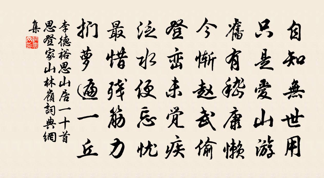 詩詞名句歷史字典書法欣賞書法字典國語詞典說文解字康熙字典古漢語字典標 題 作 者 詩 句 思山居一十首思登家山林嶺作者:李德裕 朝代:唐代思山居一十首思登家山林嶺原文自知無世用,只是愛山游。舊有嵇康懶,今慚趙武偷。登巒未覺疾,泛水便忘憂。最惜殘筋力,捫蘿遍一丘。詩詞問答問:思山居一十首思登家山林嶺的作者是誰?答:李德裕問:思山居一十首思登家山林嶺寫於哪個朝代?答:唐代李德裕思山居一十首思登家山林嶺書法欣賞思山居一十首思登家山林嶺書法作品注釋全唐詩:卷475-59詩詞推薦廖子晦以通書及龜山道鄉晦庵帖見惠曹彥約〔宋代〕文公垂憲墨淋浪,鼎立龜山更道鄉。家有一焉猶冠絕,寶茲三者見珍藏。來從疊嶂層巒里。置在光風霽月傍。收拾南歌子(荊溪寄南徐故人)趙長卿〔宋代〕春思濃如酒,離心亂似綿。一川芳草綠生煙。客里因循、重過艷陽天。屈指歸期近,愁眉淚洒然。無端還被此情牽青玉案劉一止〔宋代〕小山遮斷藍橋路。恨短夢、難飛去。長記修眉縈曲度。約花開檻,映風招袖,總是憐渠處。追歡我已傷遲暮。猶有臨洛水李世民〔唐代〕春蒐馳駿骨,總轡俯長河。霞處流縈錦,風前漾卷羅。水花翻照樹,堤蘭倒插波。豈必汾陰曲,秋雲發棹歌。初入淮河四絕句楊萬里〔宋代〕船離洪澤岸頭沙,入到淮河意不佳。何必桑乾方是遠,中流以北即天涯。效王建詩體三首趙希丙〔宋代〕王釵半落珊瑚枕,金屋低垂翡翠簾。莫喚女醫來問病,逢春自是可曾忺。嘲趙謙光賀遂涉〔唐代〕員外由來美,郎中望亦優。寧知粉署里,翻作土山頭。和利州鮮于轉運公劇八詠寶峰亭司馬光〔宋代〕孤亭冠山椒,正視物不隔。六合縱心賞,萬家窮目力。髻鬟烏奴翠,衣帶嘉陵碧。霞生白水尾,日沒九隴脊。煙凝水調歌頭佚名〔宋代〕早是玉堂客,猶著侍臣冠。便為霖去亦晚,何況此身閒。胸次光風霽月,意味滿庭芳草,體用兩相關。坐對粵山好【中呂】喜春來_鑑湖春日雁張可久〔元代〕鑑湖春日雁啼秋水移冰柱,蟻泛春波倒玉壺,綠楊花謝燕將雛。人笑語,游遍賀家湖。金華客舍落紅小雨蒼苔徑,內鄉兼隱亭邵雍〔宋代〕兼隱詫來書,於時特起予。民淳無訟聽,縣僻類山居。簿領杯盤外,官聯談笑余。不知當此際,傍邑更誰知。題明遠軒李新〔宋代〕聊能半日止游韁,拂拂塵裾未滌黃。山掩豀光龍脊斷,谷傳天籟虎風涼。亂雲過眼不妨好,細逕入村何限長。獨酌送保慧大地釋心月〔宋代〕生在如來家,須學如來行。諸念入正念,有諍歸無諍。少林佛圖不再見,台山大會堪憑□。彼何人哉我何人,眨起句武三思〔唐代〕雲螭非易匹,月駟本難儔。(詠馬,見《海錄碎事》)別林肅翁陳藻〔宋代〕滿懷裝貨出門前,多寡相酬應世緣。取友無他惟會理,逢僧只此是談禪。樂生個裡慚愧,用向稠中足裹纏。便謝化題竹溪近藁二首劉克莊〔宋代〕□上翁新授□□,□□字字費精研。韓嬰豈敢為□□,郭象安能□□□。曾是嘔心多警語,或疑枕膝有奇傳。溪□和三兄立冬祠太乙二首韓維〔宋代〕樓外蘭班曉斗垂,霜晴宮瓦濕琉璃。珠幢羽節嚴仙杖,桂酒椒漿潔祠儀。寒氣導迎通律管,神光飛動屬壇壝。定聞浣溪沙(自適)蘇軾〔宋代〕傾蓋相逢勝白頭。故山空復夢松楸。此心安處是菟裘。賣劍買牛吾欲老,乞漿得酒更何求。願為辭社宴春秋。又和洪咨夔〔宋代〕青女籠晴試小春,門前沙路淨無塵。平洲水竹因依好,白鷺飛來不避人。搗練子 贈雲中子蘇鉉馬鈺〔元代〕雲中子,是蘇公,聽予休要頭*松。頂華陽,巾九峰。當行化,代山侗。雲遊西北訪崆峒。闡善緣,立教風。名句推薦侈而墮者貧,而力而儉者富。韓非及後人《韓非子·顯學》 腳踏車欲問邊,屬國過居延。王維《使至塞上》 貧者士之常也,死者人之終也,處常得終,當何憂哉?列子及其弟子《列子·天瑞》 欲知卻老延齡藥,百草摧時始起花。蘇軾《趙昌寒菊》 坐愁群芳歇,白露凋華滋。李白《秋思》 明月如霜,好風如水,清景無限。蘇軾《永遇樂·彭城夜宿燕子樓》 玉在櫝中求善價,釵於奩內待時飛。曹雪芹《紅樓夢·第一回》 夭夭園桃,無子空長。曹丕《煌煌京洛行》 西風稍急喧窗竹,停又續,膩臉懸雙玉。閻選《河傳·秋雨》 寂寂柴門村落里,也教插柳記年華。趙鼎《寒食》