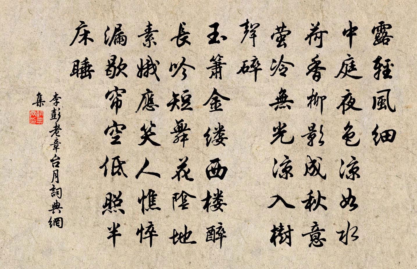 詩詞名句歷史字典書法欣賞書法字典國語詞典說文解字康熙字典古漢語字典標 題 作 者 詩 句 章台月/一斛珠作者:李彭老 朝代:宋代章台月/一斛珠原文露輕風細。中庭夜色涼如水。荷香柳影成秋意。螢冷無光,涼入樹聲碎。玉簫金縷西樓醉。長吟短舞花陰地。素娥應笑人憔悴。漏歇簾空,低照半床睡。詩詞問答問:章台月/一斛珠的作者是誰?答:李彭老問:章台月/一斛珠寫於哪個朝代?答:宋代問:章台月/一斛珠是什麼體裁?答:詞李彭老章台月/一斛珠書法欣賞章台月/一斛珠書法作品詩詞推薦樵青歌 為黃仙裳作杜濬〔清代〕當時同學十數人,兩人引頸先朝露。一人萬里足重繭,一個入海隨煙霧。三人滅跡逃空門,四人牆東長閉戶。一人送春歸(元和十一年三月三十日作)白居易〔唐代〕送春歸,三月盡日日暮時。去年杏園花飛御溝綠,何處送春曲江曲。今年杜鵑花落子規啼,送春何處西江西。帝城次韻趙表之道中見梅之作二首李彌遜〔宋代〕近水疏籬竹半侵,枝南枝北弄晴陰。不因老眼分明見,辜負凌寒一寸心。鉅鹿道中作陳維崧〔清代〕雄關花上郡,看花城根削花,土花埋鏃。十月悲風如箭叫,此地人稱鉅鹿。白浪轟豗,黃沙蒼莽,霜蝕田夫屋。車水龍吟 代玄覽和東泉學士自壽之作 案此張雨〔元代〕古來宰相神仙,有誰得似東泉老。今朝佳宴,楊枝解唱,花枝解笑。鐘鼎山林,同時行輩,故人應少。問功成身退點絳唇 初度作謝應芳〔元代〕七十年前,抱麟虛負雙親夢。一襟空洞。生世曾何用。老我東門,瓜也無心種。松醪雍。瀉如鉛汞。時與漁樵共。尋勝趙汝鐩〔宋代〕老子攜筇杖,小童挑酒壺。遍尋泉石勝,引路倩樵夫。題東坡竹石黃庭堅〔宋代〕怪石岑崟當路,幽篁深不見天。此路若逢醉客。應在萬仞峰前。望蓬萊 紙旗上書王哲〔元代〕邊境靜,乞覓得便宜。戰鼓復為韶樂鼓,征旗還作化緣旗。便見太平時。那減舍,第一莫遲遲。王哲害風無憂子,六十蔡戡〔宋代〕六十不歸何日歸,人生七十古來稀。憂愁疾病常相半,十載光陰轉矚非。奉和襲美夏景無事因懷章來二上人次韻陸龜蒙〔唐代〕檐外青陽有二梅,折來堪下凍醪杯。高杉自欲生龍腦,小弁誰能寄鹿胎。麗事肯教饒沈謝,談微何必減宗雷。還聞頌二首釋慧南〔宋代〕生緣斷處伸驢腳,驢腳伸時佛手開。為報五湖參學者,三關一一透將來。四時讀書樂翁森〔宋代〕昨夜庭前葉有聲,籬豆花開蟋蟀鳴。不覺商意滿林薄,蕭然萬籟涵虛清。床前賴有短檠在,及此讀書功更倍。讀書國香(中宮生辰)曹勛〔宋代〕紅染芙蓉。似曉霞麗日,秋滿珠宮。瑞彩朝來,都做和氣蔥蔥。共慶龜台降祉,化均鳳歷同風。昇平助陰化,奉養奉和族祖紫嚴翁謾興十首汪炎昶〔宋代〕氣節固難量,出處已可視。一挽節致之,定非棟樑哭。文王不親屈,漁竿老於渭。南鄉子黃庭堅〔宋代〕臥稻雨餘收。處處遊人簇遠洲。白髮又扶紅袖醉,戎州。亂折黃花插滿頭。青眼想風流。畫出西樓一幀秋。還把去將渡江張斛〔金代〕無數飛花委路塵,不堪重醉楚城春。明朝回首江南岸,煙雨昏昏不見人。七日發嶽麓道中尋梅不獲至十日遇雪賦比林用中〔宋代〕昨日來時萬里林,長江雪厚侵猶深。蒼茫不見梅花意,重對晴天豁晚襟。寄左省杜拾遺岑參〔唐代〕聯步趨丹陛,分曹限紫微。曉隨天仗入,暮惹御香歸。白髮悲花落,青雲羨鳥飛。聖朝無闕事,自覺諫書稀。懷古李涉〔唐代〕尼父未適魯,屢屢倦迷津。徒懷教化心,紆鬱不能伸。一遇知己言,萬方始喧喧。至今百王則,孰不挹其源。名句推薦問弄雪飄枝,無雙亭上,何日重遊。鄭覺齊《揚州慢·瓊花》 焉知後之視今,不如今之視昔也?王通《中說·卷七·述史篇》 微暈嬌花濕欲流,簟紋燈影一生愁。納蘭性德《浣溪沙·詠五更和湘真韻》 致虛極;守靜篤。萬物並作,吾以觀復。老子《老子·道經·第十六章》 還作一段相思,冷波葉舞愁紅,送人雙槳。吳文英《解蹀躞·醉雲又兼醒雨》 為上者疑,為下者懼。上下背德,禍必興焉。來俊臣《羅織經·事上卷第二》 水天清話,院靜人銷夏。項鴻祚《清平樂·池上納涼》 落花水香茅舍晚,斷橋頭賣魚人散。馬致遠《壽陽曲·遠浦帆歸》 飛花兩岸照船紅,百里榆堤半日風。陳與義《襄邑道中》 我家洗硯池邊樹,朵朵花開淡墨痕。王冕《墨梅》