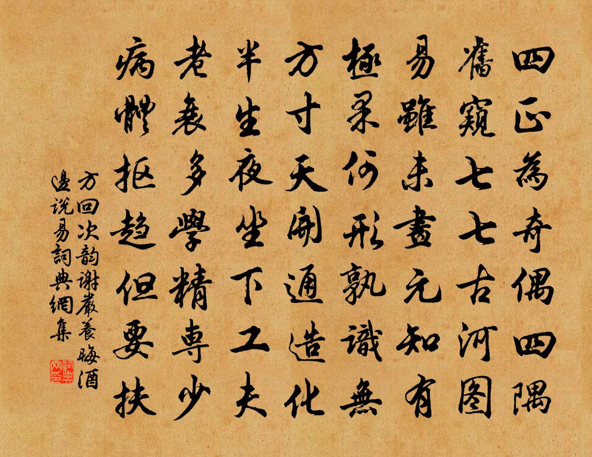 詩詞名句歷史字典書法欣賞書法字典國語詞典說文解字康熙字典古漢語字典標 題 作 者 詩 句 次韻謝嚴養晦酒邊說易作者:方回 朝代:宋代次韻謝嚴養晦酒邊說易原文四正為奇偶四隅,舊窺七七古河圖。易雖未畫元知有,極果何形孰識無。方寸天開通造化,半生夜坐下工夫。老衰多學精專少,病體摳趨但要扶。詩詞問答問:次韻謝嚴養晦酒邊說易的作者是誰?答:方回問:次韻謝嚴養晦酒邊說易寫於哪個朝代?答:宋代方回次韻謝嚴養晦酒邊說易書法欣賞次韻謝嚴養晦酒邊說易書法作品詩詞推薦山居書事周文璞〔宋代〕荼醾架倒無人架,全似老夫狂醉時。昨夜一場溪雨橫,又漂苔蘚到花枝。眼兒媚黎廷瑞〔宋代〕暖雲挾雨洗塵埃。剗地峭寒翠。燕兒知否,鶯兒知否,廝句春回。小樓日日重簾卷,應是把人猜。杏花如許,桃花五更仇遠〔宋代〕杭城打六更,市樓已攢點。流年莫催人,老色將冉冉。道愛堂孫夢觀〔宋代〕多幸廛居辱鎮臨,政平底用減科箴。昔聞偃室弦歌化,今見邦君撫字心。簾度荷香供永晝,水寒山影瀉清音。從來栽竹種紅蕉後數日阻雨不見賦小詩鄭剛中〔宋代〕瘦竹犯寒扶直節,蕉花垂老抱丹心。小園半月隔風雨,搔首相望空苦吟。與趙莒茶宴錢起〔唐代〕竹下忘言對紫茶,全勝羽客醉流霞。塵心洗盡興難盡,一樹蟬聲片影斜。試墨張耒〔宋代〕金案冰窗淨絕塵,硯寒龍尾縠生紋。澄江清淺汀洲靜,忽有蒼螭下吐雲。邊情張蠙〔唐代〕窮荒始得靜天驕,又說天兵擬渡遼。聖主尚嫌蕃界近,將軍莫恨漢庭遙。草枯朔野春難發,冰結河源夏半銷。惆悵【雙調】夜行船_院宇深沉人佚名〔元代〕院宇深沉人靜悄,冷清清寶獸煙消。四壁秋蟲,一簾疏雨,兩般兒斗來相惱。 【麼】一夜先爭十歲老,悶厭厭代陸平原君子有所思行鮑照〔南北朝〕西上登雀台。東下望雲闕。層閣肅天居。馳道直如發。繡甍結飛霞。璇題納行月。築山擬蓬壺。穿池類溟渤。選色虔州呂倚承事年八十三讀書作詩不已好收古今蘇軾〔宋代〕揚雄老無子,馮衍終不遇。不識孔方兄,但有靈照女。家藏古今帖,墨色照箱筥。飢來據空案,一字不堪煮。枯腸蕪湖王敦城下作賀鑄〔宋代〕斗立孤城日四圍,賊奴曾未懾天威。風生虎帳豺聲厲,塵犯龍顏魚服歸。首揭大航遺臭在,歌流樂府舊音非。當時虞美人邵亨貞〔元代〕天涯綠遍王孫草。魂夢長飛繞。長安無復麗人行。只有青山,依舊向人明。平泉金谷俱陳跡。古路荒苔碧。金鞍去午日三首梅堯臣〔宋代〕百草堪為藥,舟行不及收。岸旁蕭與艾,從聽到寒休。玉田八景玉灘夜月李堪〔宋代〕鳴玉灘頭片月生,波光掩映釣舟橫。何人隔岸吹長笛,一曲涼州恰二更。劉道祖江程萬丘順甫講易孟子拾其意為二十韻劉子翬〔宋代〕吾初讀七篇,未領躍如義。晚而窺大易,稍解寂然意。乃知平放著,的的目前事。盡心則無餘,窮神忽超詣。以斯華陽洞辭游九言〔宋代〕河漢澈,碧霄晴,九華仙子到凡塵。涼夜山頭吹玉笛,纖雲卷盡月分明。與參寥師行園中得黃耳蕈蘇軾〔宋代〕遣化何時取眾香,法筵齋缽久淒涼。寒蔬病甲誰能采,落葉空畦半已荒。老楮忽生黃耳菌,故人兼致白芽姜。蕭然湘妃廟李涉〔唐代〕斑竹林邊有古祠,鳥啼花發盡堪悲。當時惆悵同今日,南北行人可得知。送僧聰歸蜀司馬光〔宋代〕翠柏老精舍,紅塵倦帝城。千山一錫遠,萬里片雲輕。江棧紆還直,天星縱復橫。聽猿應更喜,還是故鄉聲。名句推薦女也不爽,士貳其行。士也罔極,二三其德。佚名《氓》 獻賦十年猶未遇,羞將白髮對華簪。錢起《贈闕下裴舍人》 心心視春草,畏向階前生。王維《雜詩三首 / 雜詠三首》 君子敬以直內,義以方外,敬義立而德不孤。佚名《易傳·文言傳·坤文言》 雪似梅花,梅花似雪。似和不似都奇絕。呂本中《踏莎行·雪似梅花》 前村深雪裡,昨夜一枝開。齊己《早梅》 偷彈清淚寄煙波,見江頭故人,為言憔悴如許。袁去華《劍器近·夜來雨》 見了你朝霞的顏色,便感到我落月的沉哀戴望舒《山行(見了你朝霞的顏色)》 紫萸一枝傳賜,夢誰到、漢家陵。姚雲文《紫萸香慢·近重陽》 伏波惟願裹屍還,定遠何鬚生入關。李益《塞下曲》
