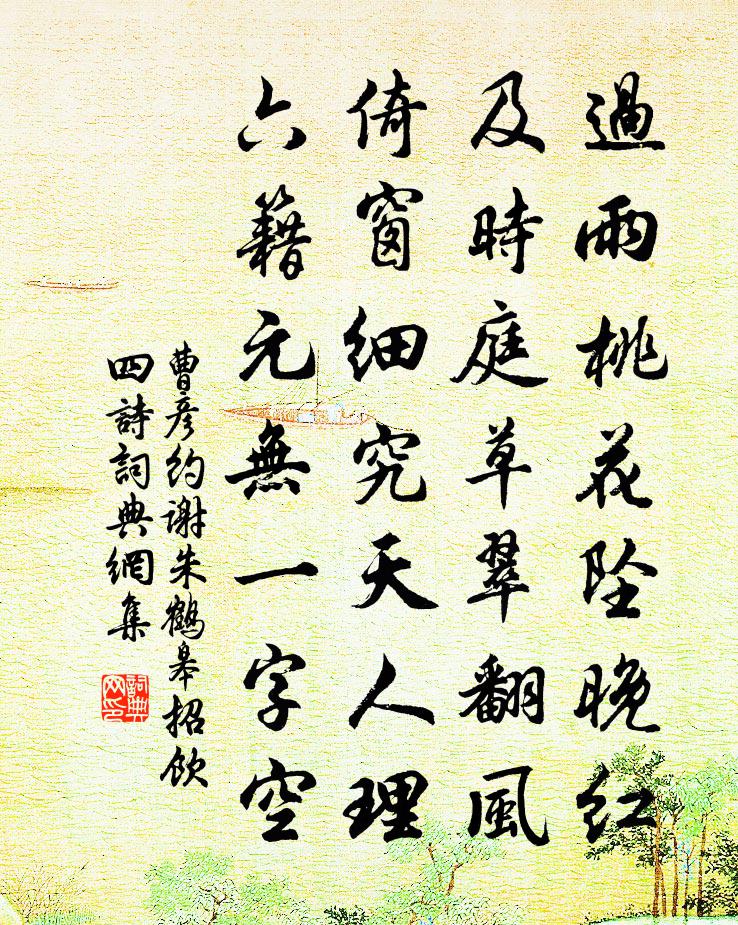 詩詞名句歷史字典書法欣賞書法字典國語詞典說文解字康熙字典古漢語字典標 題 作 者 詩 句 謝朱鶴皋招飲四詩作者:曹彥約 朝代:宋代謝朱鶴皋招飲四詩原文過雨桃花墜晚紅,及時庭草翠翻風。倚窗細究天人理,六籍元無一字空。詩詞問答問:謝朱鶴皋招飲四詩的作者是誰?答:曹彥約問:謝朱鶴皋招飲四詩寫於哪個朝代?答:宋代曹彥約謝朱鶴皋招飲四詩書法欣賞謝朱鶴皋招飲四詩書法作品詩詞推薦聽叫居親求語釋紹曇〔宋代〕幼把儒冠颺壁根,朅來巾侍乳峰僧。吟詩清苦規寒子,舂確辛勤慕老能。錦鏡閒看花瑣碎,瀑崖戲擊玉稜層。惜分送徐漕移憲浙東二首周必大〔宋代〕一去中台十九年,愛君憂國得華顛。久疑使節留江上,稍喜除書近日邊。寒碧軒窗餘舊句,汗青簡冊奏新篇。文章同李侍御萼、李判官集陸處士羽新宅皎然〔唐代〕素風千戶敵,新語陸生能。借宅心常遠,移籬力更弘。釣絲初種竹,衣帶近裁藤。戎佐推兄弟,詩流得友朋。柳陰題長江圖三絕王柏〔宋代〕魚腹江邊八陣圖,嶙峋於此豈良謨。後來浪道長蛇勢,用勢還須烈丈夫。笑題明月池乾隆〔清代〕盤轉山腰至山寺,蒼松怪石清絕倫。寺額明月池三字,尋勝笑昔題非真。一泓椀大隱石罅,日間那乃瞻水輪。設雲心老久許為作畫未果以詩督之陳與義〔宋代〕布衲王摩詰,禪余寄筆端。試將能事迫,肯作畫工難。秋入無聲句,山連欲雨寒。平生夢想處,奉乞小巑岏。月到梧桐上吟邵雍〔宋代〕月到梧桐上,風來楊柳邊。院深人復靜,此景共誰言。送靈武范司空權德輿〔唐代〕上略在安邊,吳鉤結束鮮。三公臨右地,七萃擁中堅。舊壘銷烽火,新營辨井泉。伐謀師以律,賈勇士爭先。塞迥偈頌一百零四首釋紹曇〔宋代〕有一物,全機用。塵勞之儔,如來之種。輕若鴻毛輕,重若丘山重。乳峰信手拈來,點破勞生塵夢。剛被秋蟲落葉夢王安石〔宋代〕知世如夢無所求,無所求心普空寂。還似夢中隨夢境,成就河沙夢功德。次韻元卿二首陳造〔宋代〕君自才高與世疎,我頑能使此溪愚。醫師久已肱三圻,賦客枵然屋四隅。莫道十年同好惡,相過一笑間憂虞。胸中二十六弟寄和江子我竹夫人詩一首愛其巧思戲晁說之〔宋代〕寥寥故國謾玄盧,內子可憐殊不模。擬比封君寧有實,欲為節婦亦何疏。且休深妒斫桃樹,枉是多愁織錦書。貧士池上早春即事招夢得白居易〔唐代〕老更驚年改,閒先覺日長。晴薰榆莢黑,春染柳梢黃。雪破山呈色,冰融水放光。低平穩船舫,輕暖好衣裳。白角宜春台朱繼芳〔宋代〕定王米換長安土,北望長安日幾廻。更有築台歸未得,憑高卻望定王台。朝南以詩送巴石研屏香幾用韻研屏洪咨夔〔宋代〕首鼠年來困兩端,石屏空照鬢絲斑。歸舟莫道全無物,分得蓬婆小雪山。【正宮】小梁州_朱顏綠鬢少貫雲石〔元代〕朱顏綠鬢少年郎,都變做白髮蒼蒼。盡教他花柳自芬芳,無心賞,不趁燕鶯忙。 【麼】東家醉了東家唱,西家寶林寺王英孫〔宋代〕飛來幾千載,台殿壓岧嶢。落日飛仙鼠,秋風下健雕。山腰危露石,海眼暗通潮。堪嘆玄英後,詩名竟寂寥。郴州劉奉世〔宋代〕當年賈傅去長沙,吊屈無靈賦楚些。萬里不忘宣室夜,未舒三策不成家。西去瀟湘南嶽麓,名城疊疊紆盤谷。岣嶁立秋日禱雨宿靈隱寺同周徐二令蘇軾〔宋代〕百重堆案掣身閒,一葉秋聲對榻眠。床下雪霜侵戶月,枕中琴築落階泉。崎嶇世味嘗應遍,寂寞山棲老漸便。惟有朱厓令女楊維楨〔元代〕關朱爭兩死,兩死獨誰當。關吏不垂泣,青天應雨霜。名句推薦卦也者,著天下之時也。爻也者,效天下之動也。王通《中說·卷七·述史篇》 莫辭盞酒十分勸,只恐風花一片飛。程顥《郊行即事》 胭脂淚,相留醉,幾時重。李煜《相見歡·林花謝了春紅》 禍褔無不自己求之者。孟子《孟子·公孫丑章句上·第四節》 淥水淨素月,月明白鷺飛。李白《秋浦歌十七首》 人有喜慶,不可生妒忌心;人有禍患,不可生喜幸心。朱柏廬《朱子家訓·全文》 夜深靜臥百蟲絕,清月出嶺光入扉。韓愈《山石》 霰雪紛其無垠兮,雲霏霏而承宇。屈原《九章》 三萬里河東入海,五千仞岳上摩天。陸游《秋夜將曉出籬門迎涼有感》 書卷多情似故人,晨昏憂樂每相親。于謙《觀書》