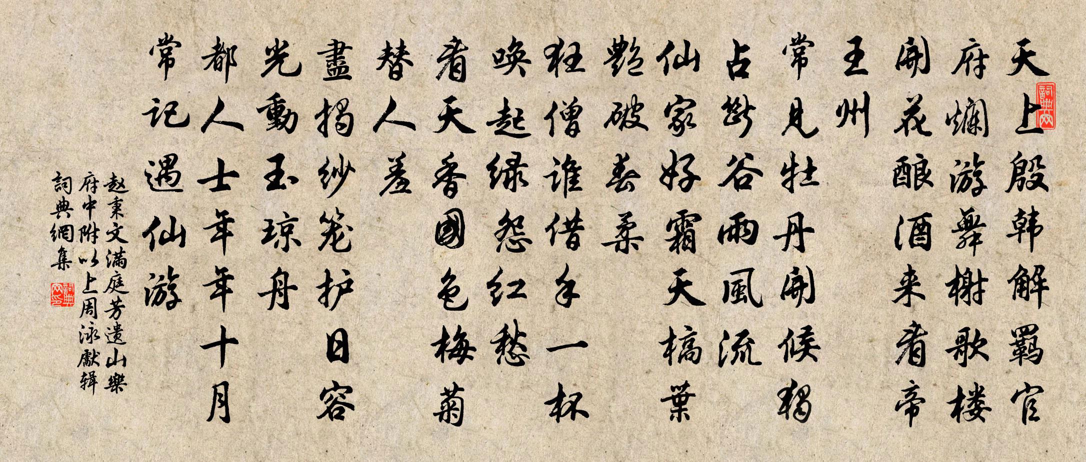 詩詞名句歷史字典書法欣賞書法字典國語詞典說文解字康熙字典古漢語字典標 題 作 者 詩 句 滿庭芳 遺山樂府中附以上周泳先輯作者:趙秉文 朝代:金代原文天上殷韓,解羈官府,爛游舞榭歌樓。開花釀酒,來看帝王州。常見牡丹開候,獨占斷、穀雨風流。仙家好,霜天槁葉,艷破春柔。狂僧誰藉手,一杯喚起,綠怨紅愁。看天香國色,梅菊替人羞。盡揭紗籠護日,容光動、玉瓊舟。都人士,年年十月,常記遇仙遊。詩詞問答問:《滿庭芳 遺山樂府中附以上周泳先輯》的作者是誰?答:趙秉文問:該詩寫於哪個朝代?答:金代問:該詩是什麼體裁?答:詞書法欣賞滿庭芳 遺山樂府中附以上周泳先輯書法作品詩詞推薦冬日病中即事呂溫〔唐代〕牆下長安道,囂塵咫尺間。久牽身外役,暫得病中閒。背喜朝陽滿,心憐暮鳥還。吾廬在何處,南有白雲山。定侍者奔乃師喪諸公以偈乃求題其後釋紹曇〔宋代〕五逆從前恨阿斧,幾思吞併老屍骸。無端更被人攛掇,憤憤扶鍬去活埋。湖天暮景五首楊萬里〔宋代〕斷腸浪說賀方回,未抵秦郎翦水才。欲向湖邊問遺唱,鴛鴦鸚鵡兩相推。木蘭花晏幾道〔宋代〕初心已恨花期晚,別後相思長在眼。蘭衾猶有舊時香,每到夢回珠淚滿。多應不信人腸斷,幾夜夜寒誰共暖。欲將儀坤廟樂章佚名〔唐代〕酌郁既灌,取蕭方爇,籩豆靜器,簠簋芬飶。魚臘薦美,牲牷表絜。是戢是將,載迎載列。西江月王千秋〔宋代〕心事幾多白髮,客情無數青山。廉纖細雨褪餘寒。正是花期酒限。一自瓶簪信杳,空留鈿帶香殘。我今多病寄江乾念奴嬌衛時敏〔宋代〕春風桃李,問耐寒何似,霜松雪柏。珍重撥煩京兆手,早歲聲名霹靂。收卷經論,擺遺榮利,物外多間適。熊經龜晚思范成大〔宋代〕蘚牆莎砌響幽蟲,睡起翻書覺夢中。殘暑一窗風不動,秋陽入竹碎青紅。題吉州聶倅談風月軒曾豐〔宋代〕黃堂指顧了凡最,紅幕賓士了苛碎。更無可了別駕翁,贏得徜徉是非外。未有可偷風月天,崢嶸新起東偏廢。風含浣溪沙 晉祠石刻二闋姜彧〔元代〕方丈堆空瞰碧潭。潭光山影靜相涵。開軒千里供晴嵐。流水桃花疑物外,小橋煙柳似江南。挽將風月入醺酣。宿江館朱慶餘〔唐代〕江館迢遙處,知音信漸賒。夜深鄉夢覺,窗下月明斜。起雁看荒草,驚波尚白沙。那堪動鄉思,故國在天涯。農家陸游〔宋代〕租犢耕蕎地,呼船取荻薪。蒼頭供井臼,赤腳解縫紉。僧乞銘師塔,巫邀賽土神。心常厭多事,謝病又經旬。題淨明寺周日明〔宋代〕幽幽古寺中,石徑受苔封。白日無一事,青山只四峰。野蔬為佛供,澗水替人舂。僧因煎新茗,林間拾墜松。題畢叔文所藏趙祖文畫趙蕃〔宋代〕數月湖山路,未看湖上山。塵埃苦相敗,疾病亦多關。見此微茫畫,如行慘澹間。小舟帆正飽,何日載余還。貢院樓北新栽小松李正封〔唐代〕青蒼初得地,華省植來新。尚帶山中色,猶含洞裡春。近樓依北戶,隱砌淨游塵。鶴壽應成蓋,龍形未有鱗。為梁頌證道歌證道歌釋印肅〔宋代〕誰能向外夸精進,五千退席聞無信。我寧速入於涅磐,莫教墮落聲聞性。海棠陸游〔宋代〕誰道名花獨故宮,東城盛麗足爭雄。橫陳錦障闌乾外,盡吸紅雲酒醆中。貪看不辭持夜燭,倚狂直欲擅春風。拾遺有感王冕〔元代〕江南有古客,布衣狂而愚。區區許何為?竊比莘野夫。養素體良貴,順適無覬覦。宵旰覿黎民,戢戢愁釜魚。去古句鄭伯熊〔宋代〕胡床倚春風,池亭自花柳。村居日飲酒對梅花醉則擁紙衾熟睡甚自適也陸游〔宋代〕江村歲晚掩柴荊,地僻久無車馬聲。孤寂惟尋麴道士,一寒仍賴楮先生。醡頭珠滴愁先破,帳底春回夢易成。莫笑名句推薦今夜送歸燈火冷,河塘,墮淚羊公卻姓楊。蘇軾《南鄉子·和楊元素時移守密州》 門外垂楊岸側,畫橋誰系蘭舟。万俟詠《木蘭花慢·恨鶯花漸老》 四海十年兵不解,胡塵直到江城。陳克《臨江仙·四海十年兵不解》 淇園春竹美,軍宴日椎牛。司馬光《送龔章判官之衛州·新及第》 秦樓月,年年柳色,灞陵傷別。李白《憶秦娥·簫聲咽》 雨荒深院菊,霜倒半池蓮。杜甫《宿贊公房》 以小人尚民而威,以非所取於民而巧,是傷國之大災也。荀子《荀子·王霸》 人之過誤宜恕,而在己則不可恕洪應明《菜根譚·概論》 庭前雪壓松桂叢,廊下點點懸紗籠。劉禹錫《更衣曲》 春花秋月何時了?往事知多少。李煜《虞美人·春花秋月何時了》