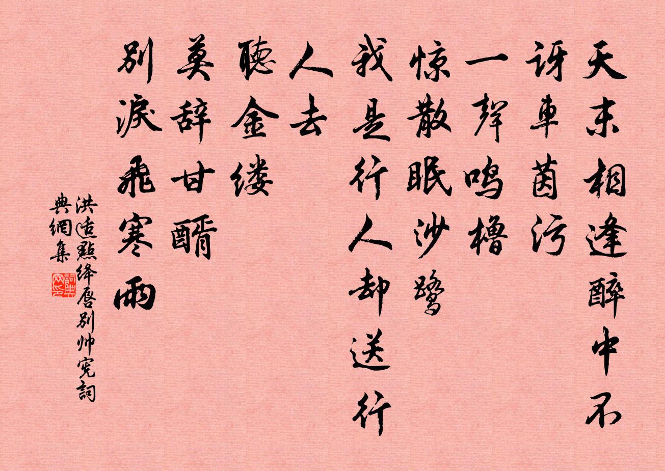 詩詞名句歷史字典書法欣賞書法字典國語詞典說文解字康熙字典古漢語字典標 題 作 者 詩 句 點絳唇(別帥憲)作者:洪适 朝代:宋代點絳唇(別帥憲)原文天末相逢,醉中不訝車茵污。一聲鳴櫓。驚散眠沙鷺。我是行人,卻送行人去。聽金縷。莫辭甘醑。別淚飛寒雨。詩詞問答問:點絳唇(別帥憲)的作者是誰?答:洪适問:點絳唇(別帥憲)寫於哪個朝代?答:宋代問:點絳唇(別帥憲)是什麼體裁?答:詞洪适點絳唇(別帥憲)書法欣賞點絳唇(別帥憲)書法作品詩詞推薦依韻和楊直講九日有感梅堯臣〔宋代〕也持 * 蕊,時望白衣人。苜蓿從來厭,茱萸卻乍親。護霜雲不散,吹帽客何貧。莫要悲搖落,秋花更勝春。洞庭題詠十一首宿靈佑觀謝沈君王阮〔宋代〕鳳翅出滄溟,扁舟過洞庭。銀河萬頃白,螺髻兩山青。凡隔幽墟洞,神傳岳瀆經。不須尋上界,只此是青冥。真定舞范成大〔宋代〕虜樂悉變中華,惟真定有京師舊樂工,尚舞高平曲破。紫袖當棚雪鬢凋,曾隨廣樂奏雲韶。老來未忍耆婆舞,猶倚梁園歌,送河南王說判官岑參〔唐代〕君不見梁孝王修竹園,頹牆隱轔勢仍存。嬌娥曼臉成草蔓,羅帷珠簾空竹根。大梁一旦人代改,秋月春風不相待。除夜次慶符胡銓〔宋代〕白髮無端苦見尋,十年孤負醉花陰。可憐獨鶴輕浮海,未及昏鴉日伴林。天末醉眠千嶺寂,江南夢繞五雲深。一杯思大禪師贊釋慧開〔宋代〕一生討頭不見,二生骨露皮穿。三生造成地獄,全身活陷黃泉,七十二峰俱坐斷,口吞佛祖在機先。延安道中作司馬光〔宋代〕羈旅兼邊思,川原蹀血新。煙雲長帶雨,草樹不在春。細水淘沙骨,驚飈轉路塵。今朝見烽火,白首太平人。劉百十六兄送梅花大鯽新酒以詩將和其韻四首杜范〔宋代〕塵鬢三年繡水湄,詩懷久矣負良時。門前喜鵲來相報,知有騷人委色絲。新晴陸游〔宋代〕兼甸不雨亦常陰,一日新晴抵萬金。浦面波紋春縠細,橋頭柳色麴麈深。關山滿眼愁千斛,歲月催人雪一簪。猶有宮詞一百首岳珂〔宋代〕近僚三館集簪緌,後苑千花簇水涯。御綱紅絲躍金鯉,龍韜更待釣璜師。城南胡宿〔唐代〕昨夜輕陰結夕霏,城南十里有香泥。初聞山鳥驚新哢,遙見林花識舊蹊。盪槳遠從芳草渡,墊巾還傍綠楊堤。羅敷送賀蘭上人賈島〔唐代〕野僧來別我,略坐傍泉沙。遠道擎空缽,深山蹋落花。無師禪自解,有格句堪夸。此去非緣事,孤雲不定家。蔡子應郎中輓詩二首李彌遜〔宋代〕獨秀聲名楚水東,妙年騰達俊游中。文昌寓直風雲近,神武歸來猿鶴同。居士人非禪板寂,少微星暗寶函空。知心豐城道中鄧深〔宋代〕西風著衣袂,涼意曉來加。宿露眩光彩,朝陽濕精華。人煙互疏密,物色興嘆嗟。喧囂鴨子市,蕭索漁人家。皂裙君異鄭兄出示舊詩蓋紹定初所信筆也挽仰三十吳潛〔宋代〕彈指江湖三十年,淋漓舊墨尚依然。人生未必堅如紙,心事淒涼雪滿顛。洞庭湖宋之問〔唐代〕地盡天水合,朝及洞庭湖。初日當中涌,莫辨東西隅。晶耀目何在,瀅熒心欲無。靈光晏海若,游氣耿天吳。張樂次韻章宰陳造〔宋代〕游舊多厭絕,怪君終眷知。帳留仍碧酒,紵獻更清詩。風義固難及,月評無乃私。相從文字樂,悔作十年遲。檥舟當利口待風累日懷寄城中朋游二首之二賀鑄〔宋代〕離憂不可解,罷酒獨登臨。潮落江空闊,雲繁歲晏陰。愁鴟守漁罧,怒犬突神林。觸目增淒斷,聊為澤畔吟。歸去來引佚名〔唐代〕歸去來,歸期不可違。相見旋明月,浮雲共我歸。送春吳錫疇〔宋代〕紅襯晴霞一角天,小樓重上眺前川。莫言春去無蹤跡,盡在枝頭嫩綠邊。名句推薦林暗草驚風,將軍夜引弓。盧綸《和張僕射塞下曲·其二》 曉霧將歇,猿鳥亂鳴;陶弘景《答謝中書書》 女為君子儒,無為小人儒。孔子弟子《論語·雍也篇》 花紅易衰似郎意,水流無限似儂愁。劉禹錫《竹枝詞·山桃紅花滿上頭》 藍橋何處覓雲英。只有多情流水、伴人行。蘇軾《南歌子·寓意》 謝公最小偏憐女,自嫁黔婁百事乖。元稹《遣悲懷三首·其一》 日暮蒼山遠,天寒白屋貧。劉長卿《逢雪宿芙蓉山主人》 禍與福同門,利與害同城。佚名《增廣賢文·下集》 有誰知我此時情,枕前淚共階前雨,隔個窗兒滴到明。聶勝瓊《鷓鴣天·別情》 白水明田外,碧峰出山後。王維《新晴野望》