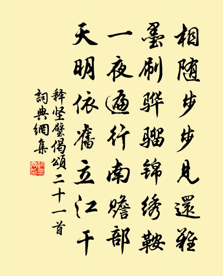 詩詞名句歷史字典書法欣賞書法字典國語詞典說文解字康熙字典古漢語字典標 題 作 者 詩 句 偈頌二十一首作者:釋堅璧 朝代:宋代偈頌二十一首原文相隨步步見還難,墨刷驊騮錦繡鞍。一夜遍行南贍部,天明依舊立江乾。詩詞問答問:偈頌二十一首的作者是誰?答:釋堅璧問:偈頌二十一首寫於哪個朝代?答:宋代釋堅璧偈頌二十一首書法欣賞偈頌二十一首書法作品詩詞推薦和汪元思喜雨韻王柏〔宋代〕龍蟄金瓶小,神驅雨陣斜。建瓴飛素練,走澗舞生蛇。風使開雲磨,雷香隱砲車。農人有驕色,一飽不須賒。槐影許月卿六〔宋代〕槐影本來惟戴日,蟬聲固自未知秋。斜陽薄雨羊歸徑,冷月橫星人倚樓。菩薩蠻(代歌者怨)晁補之〔宋代〕絲篁斗好鶯羞巧。紅檀微映燕脂小。當□斂雙蛾。曲中幽恨多。知君憐舞袖。舞要歌成就。獨舞不成妍。因歌舞可句高似孫〔宋代〕硯濕舂鋤雨,罏腥郭索泥。南徐道中范成大〔宋代〕生憎行路與心違,又逐孤帆擘浪飛。吳岫涌雲穿望眼,楚江浮月冷征衣。長歌悲似垂垂淚,短夢紛如草草歸。若有初授贊善大夫早朝寄李二十助教白居易〔唐代〕病身初謁青宮日,衰貌新垂白髮年。寂寞曹司非熟地,蕭條風雪是寒天。遠坊早起常侵鼓,瘦馬行遲苦費鞭。一種和陶飲酒二十首蘇軾〔宋代〕民勞吏無德,歲美天有道。暑雨避麥秋,溫風送蠶老。三咽初有聞,一溉未濡槁。詔書寬積欠,父老顏色好。再拜縱筆陸游〔宋代〕一點湛空明,居然萬事輕。菜元勝肉食,車豈異徒行。幻境終何在,金丹本自成。信能如是解,土苴亦長生。溪橋梅方蒙仲〔宋代〕一陣曉風寒,驚飛點去鞍。行人易愁絕,便作柳花看。愁韋莊〔唐代〕避愁愁又至,愁至事難忘。夜坐心中火,朝為鬢上霜。不經公子夢,偏入旅人腸。借問高軒客,何鄉是醉鄉?含香韋莊〔唐代〕含香高步已難陪,鶴到清霄勢未回。遇物旋添芳草句,逢春寧滯碧雲才。微紅幾處花心吐,嫩綠誰家柳眼開。卻去和臥龍招隱吟釋道璨〔宋代〕武侯花與晦翁,花千載兩名花流。各以花一臂力,能鎮百世浮。神遊天地間,或為山阿留。心期有佳人,駕言寫幽題曹仲本出楊萬里〔宋代〕德壽宮前春晝長,宮中花開宮外香。太皇頤神玉霄上,都人久不瞻清光。今晨忽見肅天仗,翠華黃屋從天降。一聲禪人並化主寫真求贊釋正覺〔宋代〕面此微紫,眸子深青。默臻閫奧,妙得門庭。徹見二儀成一體,明知萬像不他形。張麗華墓吳龍翰〔宋代〕金井轆轤春夢殘,香魂飛不到長安。君王為虜妾為土,夜月空分兩地寒。送周尚書赴滑台張祜〔唐代〕楚謠襦袴整三年,喉舌新恩下九天。鼓角雄都分節鉞,蛇龍舊國罷樓船。昆河已在兵鈐內,堂柳空留鶴嶺前。多病加頌蜀僧雪頌釋印肅〔宋代〕總是吾家入道門,無說說中聞不聞。步步透關田地穩,須彌{左足右孛}跳撞崑崙。鹽城阻冰雪贈陳德美三首陳造〔宋代〕身口真相累,風霜得備嘗。即今歌匪兕,未憗反屠羊。辟謗規閒口,因衰再覆觴。不知詩酒外,何計逭悲涼。挽張郴州四首曾豐〔宋代〕四海鄭元樞,三朝范石湖。利光騰鶚表,自足濟鵬圖。芝檢豈欺我,朱轓何負作。幸而廉吏傳,名與泰山俱。送大兄兼寄趙團練陳師道〔宋代〕貧有分離苦,官無早晚宜。又為千里別,未覺十年遲。日與江山遠,風連草木悲。平生劉子政,見可只論詩。名句推薦怯於邑斗,而勇於寇戰。商鞅《商君書·戰法》 幸回郎意且斯須,一年中別今始初。王建《七夕曲》 風雨如晦,雞鳴不已。佚名《風雨》 凡與敵戰,若敵人勢實,我當嚴兵以備之,則敵人必不輕動。佚名《百戰奇略·第五卷·實戰》 一寸柔腸情幾許?薄衾孤枕,夢回人靜,徹曉瀟瀟雨。惠洪《青玉案·絲槐煙柳長亭路》 天地之大也,人猶有所憾。故君子語大,天下莫能載焉,語小,天下莫能破焉。子思《中庸·第十二章》 燕簾鶯戶,雲窗霧閣,酒醒啼鴉。張炎《朝中措·清明時節》 豪傑向簡淡中求,神仙從忠孝上起。陳繼儒《小窗幽記·集醒篇》 輪台九月風夜吼,一川碎石大如斗,隨風滿地石亂走。岑參《走馬川行奉送出師西征 / 走馬川行奉送封大夫出師西征》 誰向若耶溪上,倩美人西去,麋鹿姑蘇。辛棄疾《漢宮春·會稽蓬萊閣懷古》