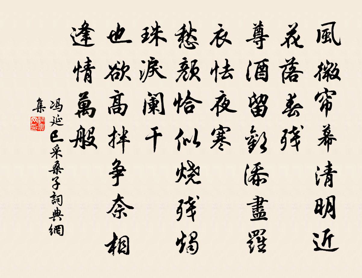 詩詞名句歷史字典書法欣賞書法字典國語詞典說文解字康熙字典古漢語字典標 題 作 者 詩 句 採桑子作者:馮延巳 朝代:唐代採桑子原文風微簾幕清明近,花落春殘。尊酒留歡,添盡羅衣怯夜寒。愁顏恰似燒殘燭,珠淚闌乾。也欲高拌,爭奈相逢情萬般。詩詞問答問:採桑子的作者是誰?答:馮延巳問:採桑子寫於哪個朝代?答:唐代問:採桑子是什麼體裁?答:詞問:馮延巳的名句有哪些?答:馮延巳名句大全馮延巳採桑子書法欣賞採桑子書法作品詩詞推薦拾得贊釋普度〔宋代〕生掃箒,用得親。休指注,枉辛勤。本來田地絕纖塵。野夕答孫郎折詩何遜〔南北朝〕山中氣色滿。墟上生煙露。杳杳星出雲。啾啾雀隱樹。虛館無賓客。幽居乏歡趣。思君意不窮。長如流水注。歸雁范仲淹〔宋代〕稻梁留不得,一一起江天。帶雪南離楚,和春北入燕。依依前伴侶,歷歷舊山川。林葉程猶遠,梅花信可傳。子規避難東歸,依韻和黃秀才見寄徐鉉〔唐代〕戚戚逢人問所之,東流相送向京畿。自甘逐客紉蘭佩,不料平民著戰衣。樹帶荒村春冷落,江澄霽色霧霏微。時危清平樂吳則禮〔宋代〕雪餘寒退。惟有青松在。春不加榮寒不悴。用舍如公都耐。流肪磊落龜蛇。會留紅日西斜。欲助我公壽骨,蟠桃等范掌書丘葵〔宋代〕出佐繡衣使,八州人共歡。一句司光筆,六計問周官。雁鶩手持進,豺狼膽自寒。豈惟重台省,風采動朝端。過宜賓見夷中亂山蘇軾〔宋代〕江寒晴不知,遠見山上日。朦朧含高峰,晃蕩射峭壁。橫雲忽飄散,翠樹紛歷歷。行人挹孤光,飛鳥投遠碧。蠻荒侍香金童趙長卿〔宋代〕一種春光,占斷東君惜。算穠李、昭華爭並得。粉膩酥融嬌欲滴。端的尊前,舊曾相識。向夜闌、酒醒霜濃寒又力解連環(橄欖)王沂孫〔宋代〕萬珠懸碧。想炎荒樹密,□□□□。恨絳娣、先整吳帆,政鬟翠逞嬌,故林難別。歲晚相逢,薦青子、獨夸冰頰。水調歌頭(題晉臣真得歸、方是閒二堂)辛棄疾〔宋代〕十里深窈窕,萬瓦碧參差。青山屋上,流水屋下綠橫溪。真得歸來笑語,方是閒中風月,剩費酒邊詩。點檢歌舞了次松坡梅花韻胡仲弓〔宋代〕滿樹苔痕帶老芬,水邊籬落月昏黃。丁寧僮子休教折,只聽枝頭獨自香。報劉一丈書宗臣〔明代〕數千里外,得長者時賜一書,以慰長想,即亦甚幸矣;何至更辱饋遺,則不才益 將何以報焉?書中情意甚殷,即思善堂張舜民〔宋代〕春風長萬物,棘子猶卷然。及至華實稠,已悲霜露先。功隨四時去,不待三牲全。所以陟屺人,設身常舍旃。夏初臨曹冠〔宋代〕也,初夏恢台,園林茂密。瀑泉鏜XXXX,松韻笙簫。巒翠波光,上下相映。佳山句在,我思古人,對景興懷,依韻和令綽兄弟春日出郊強至〔宋代〕春色才從野外知,柳陰花氣暖霏霏。出林啼鳥逢人住,掠路游蜂傍馬飛。薄宦塵埃空自哂,長吟風物阻相依。弟酬句胡僧〔宋代〕何年飲著聲聞酒,直到而今醉不醒。何事將軍封萬戶,卻教紅粉去和戎。端午內中帖子詞太上皇后閣王珪〔唐代〕漢殿炎風少,輕涼已動衣。每來觀織室,不許夜停機。送僧釋重顯〔宋代〕雪殘春島路迢迢,水靜雲開見碧霄。別後誰同此深意,祇應孤月共寥寥。挽何南坡王柏〔宋代〕少公稟氣後三年,易簀翻居三日先。學數弟兄猶間有,壽隨父母獨誰全。悲哉易感精神往,造化難憑禍福遷。應恨寄獻鄜州行軍司馬宋侍郎王禹偁〔宋代〕鉅賢如木鐸,一振聲蓋代。丈人文曲星,譴謫落下界。辭源發崑崙,意盡若到海。昔在神德朝,少秀負文彩。擢第名句推薦前村深雪裡,昨夜一枝開。齊己《早梅》 誠知此恨人人有,貧賤夫妻百事哀。元稹《遣悲懷三首·其二》 三五年時三五月,可憐杯酒不曾消。黃景仁《綺懷》 國無義,雖大必亡;人無善志,雖勇必傷。劉安及其門客《淮南子·主術訓》 吏呼一何怒,婦啼一何苦。杜甫《石壕吏》 別來半歲音書絕,一寸離腸千萬結。韋莊《應天長·別來半歲音書絕》 夕陽鳥外,秋風原上,目斷四天垂。柳永《少年游·長安古道馬遲遲》 兄弟叔侄,須分多潤寡;長幼內外,宜法肅辭嚴。朱柏廬《朱子家訓·全文》 至善是心之本體。只是明明德到至精至一處便是。然亦未嘗離卻事物。王陽明《傳習錄·卷上·徐愛錄》 寒日蕭蕭上瑣窗,梧桐應恨夜來霜。李清照《鷓鴣天·寒日蕭蕭上瑣窗》