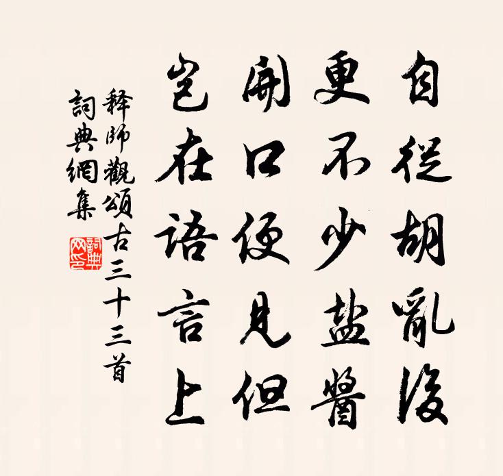 詩詞名句歷史字典書法欣賞書法字典國語詞典說文解字康熙字典古漢語字典標 題 作 者 詩 句 頌古三十三首作者:釋師觀 朝代:宋代頌古三十三首原文自從胡亂後,更不少鹽醬。開口便見但,豈在語言上。詩詞問答問:頌古三十三首的作者是誰?答:釋師觀問:頌古三十三首寫於哪個朝代?答:宋代釋師觀頌古三十三首書法欣賞頌古三十三首書法作品詩詞推薦花朝楊公遠〔宋代〕花朝恰了一分春,雨雪陰霾占兩旬。物態未妍寒瑟縮,人生易老事因循。洗瓷杯酌浮蛆酒,擁地爐燒詩帶薪。翻憶晨起有感二首周必大〔宋代〕楚尹三為禮未衰,湯衡五就欲持危。翱翔不作奔陳計,接淅何堪去魯時。沁園春 憶故人王結〔元代〕蓋世英雄,谷口躬耕,商山采芝。甚野情自愛,山林枯槁,癯儒那有,廓廟英姿。落魄狂游,故人不見,藹藹停雲竹趙葵〔宋代〕風竹蕭蕭梧葉黃,相思寸寸斷人腸,一聲塞管來何處,雁帶秋聲入故鄉。冬夜戲書陸游〔宋代〕老樹霜余已盡紅,縱橫落葉滿庭中。一鉤澹澹西南月,萬鼓憑憑東北風。賒酒每慚添舊券,讀書何計策新功?蓬窗寓南昌僧舍翁卷〔宋代〕突兀禪宮何代余,閒同衲客聽鍾魚。身如野鶴棲無定,愁似頑藤拘不除。舊隱定多新長竹,遠交全乏近來書。爐香再用韻述懷虞儔〔宋代〕少年發憤欲忘餐,信木能鑽透石盤。燈火半生徒自苦,虀鹽並日不嫌單。嗟來未肯低頭拜,臭腐那須著眼看。何物句史堯弼〔宋代〕四歲尚少房玄齡,七步未饒曹子建。賦得古蓮塘陳陶〔唐代〕闔閭宮娃能採蓮,明珠作佩龍為船。三千巧笑不復見,江頭廢苑花年年。宿囊山懷堅師林泳〔宋代〕伏虎岩頭向上層,袈裟幾度憶同登。薜荔石屋應無恙,風雨誰明徹夜燈。木犀五首清張明中〔宋代〕冶蕊倡花浪說馨,艷姚妖魏眩雙明。黃金四出薰蘭麝,個是花中第一清。為歸雲師賦野航薛嵎〔宋代〕遇坎與乘流,誰能舍跡求。即空皆是境,大渡本無舟。風流隨機息,乾坤任光浮。可憐迷岸者,漂蕩幾時休。熏蚊效宛陵先生體陸游〔宋代〕澤國故多蚊,乘夜吁可怪。舉扇不能卻,燔艾取一快。不如小忍之,驅逐吾已隘。寧聞大度士,變色為蜂蠆?景祐元年親享景靈宮二首真宗〔宋代〕椒漿尊享,珍饌精祈。睟容杳邈,瑤略霞飛。思平泉樹石雜詠一十首白鷺鶿李德裕〔唐代〕余心憐白鷺,潭上日相依。拂石疑星落,凌風似雪飛。碧沙常獨立,清景自忘歸。所樂惟煙水,徘徊戀釣磯。古越謠歌無名〔元代〕君乘車,我戴笠,他日相逢下車揖。君擔簦,我跨馬,他日相逢為君下。白贊釋智遇〔宋代〕不開罵人口,難以見其慈,不徵衲子病,難以青其師。似之則殃門添禍,否這則賦予林噬之。畫工筆熟不識伊,白水龍吟(方蒙仲、王景長和余丙辰、丁已二詞,走筆答之)劉克莊〔宋代〕先生避謗山棲,戒門不納高軒客。誰歟來者,吟詩張碧,詼諧侯白。禮數由他,謝郎著帽,王郎穿屐。且問花隨柳頌十玄談還源釋印肅〔宋代〕明月堂前枯梅華,太陽門下雪交加。寶樓閣裹多怪敗,達哩摩尼吽{左口右發}吒。雜詠一百首王子晉劉克莊〔宋代〕宿有驂鸞約,飄然遡碧霄。不為君主鬯,卻伴女 * 。名句推薦處世讓一步為高,退步即進步的張本洪應明《菜根譚·概論》 舉頭紅日近,回首白雲低。寇準《詠華山》 應憐屐齒印蒼苔,小扣柴扉久不開。葉紹翁《遊園不值》 青山如黛遠村東,嫩綠長溪柳絮風。高珩《春日雜詠》 滿眼韶華,東風慣是吹紅去。幾番煙霧,只有花難護。陳子龍《點絳唇·春日風雨有感》 墉集欺貓鼠,林藏逐雀鸇。徐威《中秋詠懷借杜子美秋日述懷一百韻和寄柳州假鳴桑先生》 語之所貴者意也,意有所隨。意之所隨者,不可言傳也。莊子《莊子·外篇·天道》 小處不滲漏,暗處不欺隱,末路不怠荒,才是真正英雄。洪應明《菜根譚·概論》 雲移雉尾開宮扇,日繞龍鱗識聖顏。杜甫《秋興八首》 離宮絕曠,身體摧藏,志念沒沉,不得頡頏。王昭君《怨詞》