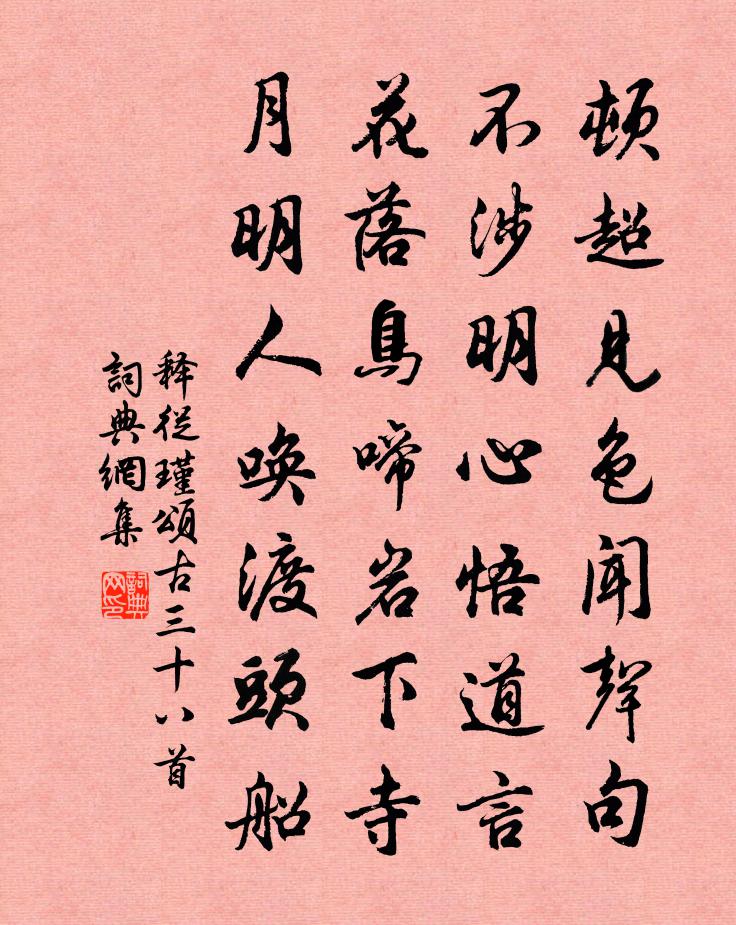詩詞名句歷史字典書法欣賞書法字典國語詞典說文解字康熙字典古漢語字典標 題 作 者 詩 句 頌古三十八首作者:釋從瑾 朝代:宋代頌古三十八首原文頓超見色聞聲句,不涉明心悟道言。花落鳥啼岩下寺,月明人喚渡頭船。詩詞問答問:頌古三十八首的作者是誰?答:釋從瑾問:頌古三十八首寫於哪個朝代?答:宋代釋從瑾頌古三十八首書法欣賞頌古三十八首書法作品詩詞推薦挽方惠粹劉克莊〔宋代〕家譜推賢裔,鄉評號吉人。佩銀成短夢,冠玉漫長身。朱軫鸞膠斷,青林鶴表新。空令柱下史,反惜幕中賓。正月初四後十餘日病嗽不能出雜書十首方回〔宋代〕夏日客此樓,買冰敵炎暵。沍寒不買冰,輟費用買炭。冰炭役浮生,倏忽涼燠換。故山饒甘泉,落葉足炊爨。曷不次韻單君范寄梅行陳著〔宋代〕洛陽今何辰,姚黃委沙塵。豈無桃李花,荊棘相仆臣。咄咄歲成晚,山空水粼粼。化為萬葉飛,目斷無可人。誰知苦學涪翁夜過其家戲作舒煥〔宋代〕先生堂前雪月苦,弟子讀書喧兩廡。撞門入室書縱橫,蠟紙燈籠似雲母。送天台李令庭芝梅堯臣〔宋代〕吾聞天台久,未見天台狀。去海知幾里,去天知幾丈。峰嶺隱與出,岩壑背與向。雲雷反在下,泉暴反在上。幽深侍宴長寧公主東莊劉憲〔唐代〕公主林亭地,清晨降玉輿。畫橋飛渡水,仙閣涌臨虛。晴新看蛺蝶,夏早摘芙蕖。文酒娛游盛,忻叨侍從餘。偈頌一百零二首釋紹曇〔宋代〕公燈不照私,渡水不濕腳。連累老北堂,北錯非常錯。功回位轉,偏正中來。鳳宿龍巢金殿曉,香車應不碾宸苔。讀杜紫微集崔道融〔唐代〕紫微才調復知兵,長覺風雷筆下生。還有枉拋心力處,多於五柳賦閒情。八公山王安石〔宋代〕淮山但有八公名,鴻寶燒金竟不成。身與仙人守都廁,可能雞犬得長生。懷詹伯遠謝應芳〔元代〕蝌蚪殘書補未全,齋居一榻坐來穿。楊花繞屋白如雪,溪水出湖青接天。冠蓋不來騎馬客,鷗鳧長傍釣魚船。多時次韻王得淦和兒泌西山所作二首陳著〔宋代〕門徑不為深,溪山巧帶襟。老來無過計,貧極見初心。兒漫煮飢字,甥能賡醉吟。不羞狂脫帽,無發可勝簪。武夷九曲葉夢鼎〔宋代〕興窮九折更悠然,棹轉船頭障去川。留取洞中無盡意,桃花水暖鱖魚天。城上吟子蘭〔唐代〕古冢密於草,新墳侵官道。城外無閒地,城中人又老。醉落托李彌遜〔宋代〕霜林變綠。畫簾桂子排香粟。一聲檀板驚飛鶩。弦管樓高,誰在闌乾曲。人生一笑難相屬。滿堂何必堆金玉。但求東風何應龍〔宋代〕和徹詩篇得暫閒,落梅香里立欄乾。新裁白紵春衫薄,猶怯東風一陣寒。梅川莫令君拉蒼山諸葛亮詩友用予松風首句為利登〔宋代〕此行為山來,至此事已非。雲火四地動,御風誰與期。剝床漸及膚,欲去迷所之。蒼黃走澗谷,勝游翻在斯。石梯曉過萬里橋陸游〔宋代〕曉出錦江邊,長橋柳帶煙。豪華行樂地,芳潤養花天。擁路看欹帽,窺門笑墜鞭。京華歸未得,聊此送流年。酬潘景玉林景熙〔宋代〕讀史雙眸夜炯然,一聲江雁落燈前。馬非汗血材終下,木或青黃性不全。風月未容詩入務,乾坤應許酒為年。寒城閏九十四程珌〔宋代〕午夜青衣海上還,八年兩度雪封山。如今一水平如鏡,好釣桐江五百灘。古意釋文珦〔宋代〕老梅何偃蹇,雪時方始花。自守歲寒性,不肯隨春華。隱人適然見,稱植溪水涯。瘦影無陽艷,清香絕淫邪。閒靜名句推薦莫道君行早,更有早行人。佚名《增廣賢文·上集》 漢甲連胡兵,沙塵暗雲海。李白《經亂離後天恩流夜郎憶舊遊書懷贈江夏韋太守良宰》 疏雨池塘見,微風襟袖知。陰陰夏木囀黃鸝賀鑄《南歌子·疏雨池塘見》 說大人,則藐之,勿視其巍巍然。孟子《孟子·盡心章句下·第三十四節》 冰合井泉月入閨,金缸青凝照悲啼。李白《夜坐吟》 鳥雀呼晴,侵曉窺檐語。周邦彥《蘇幕遮·燎沉香》 秦地羅敷女,採桑綠水邊。李白《子夜吳歌·春歌》 凡天下禍篡怨恨,其所以起者,以不相愛生也,是以仁者非之。墨子《墨子·15章 兼愛(中)》 身無彩鳳雙飛翼,心有靈犀一點通。李商隱《無題·昨夜星辰昨夜風》 秋到長門秋草黃。畫梁雙燕去,出宮牆。薛昭蘊《小重山·秋到長門秋草黃》