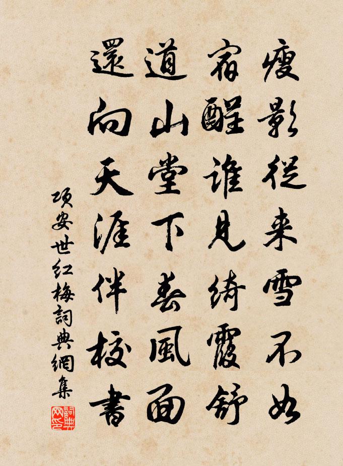 詩詞名句歷史字典書法欣賞書法字典國語詞典說文解字康熙字典古漢語字典標 題 作 者 詩 句 紅梅作者:項安世 朝代:宋代紅梅原文瘦影從來雪不如,宿酲誰見綺霞舒。道山堂下春風面,還向天涯伴校書。詩詞問答問:紅梅的作者是誰?答:項安世問:紅梅寫於哪個朝代?答:宋代項安世紅梅書法欣賞紅梅書法作品詩詞推薦山齋早起鄧深〔宋代〕推枕凌晨起,添衣奈冷何。新霜浮瓦薄,缺月掛檐多。野燒猶殘焰,鄰雞尚凍歌。撥灰添宿火,一快爇松柯。卜運算元劉克莊〔宋代〕四大因緣做,苦海憑船渡。一€清風到岸頭,得上無生路。人嘆風貧苦,我步閒閒趣。脫體全空沒一文,勝似石崇和賈閣老三首胡寅〔宋代〕來朝杲日破頑陰,共指秋成喜不禁。寸碧遙岑供眺望,長空飛鳥自消沉。四時景物千鍾酒,萬古功名一寸心。尚愧芭蕉仕女圖唐寅〔明代〕佳人春睡倚含章,一瓣梅花點額黃。起對鏡自添百媚,至今都學壽陽妝。寄舊山隱者姚合〔唐代〕別君性須臾間,性曆日兩度性新。念彼性白日長,復值人事並。未改當時居,心事如野雲。朝朝恣行坐,百事都不丙寅中秋詠月晏殊〔宋代〕玉籥秋初半,冰輪歲有期。苦吟含翰久,清宴下樓遲。雁怯波光動,蛩愁葉影危。烘簾頻卷押,溫酎旋凝澌。皎外題牟節叟介壽堂和劉左史韻魏了翁〔宋代〕兒大詩書敵富強,婦供滫瀡養尊章。照盤曉日龍為炙,介壽春風玉作堂。禮物皆由天賦分,家榮亦使里生光。人生從獵晚歸馬上默成奉呈承旨端明王學士宋庠〔宋代〕天子乘冬校獵回,鉤陳平野轉瑤魁。萬蹄未暮先追日,疊鼓非春已作雷。得攜風毛隨禁仗,犒勤霞液出仙杯。詞臣下第出關投鄭拾遺杜荀鶴〔唐代〕丹霄桂有枝,未折未為遲。況是孤寒士,兼行苦澀詩。杏園人醉日,關路獨歸時。更卜深知意,將來擬薦誰?書事戴復古〔宋代〕打鼓行船未有期,恰如江上阻風時。詩中一段閒公事,幸不妨人吃荔枝。菩薩蠻(乙巳冬前間舉似前作,因和之)辛棄疾〔宋代〕錦書誰寄相思語。天邊數遍飛鴻數。一夜夢千回。梅花入夢來。漲痕紛樹發。霜落沙洲白。心事莫驚鷗。人間千萬奉和御製筆歌夏竦〔宋代〕製之精兮漢宮之雙管,鋒之妙兮趙國之修毫。自承掌握濟群用,觚與槧兮難施勞。古今岡不達,淑慝將何逃。深仰便風經雁汊宿荻港是日舟行四百里三首岳珂〔宋代〕羊角摶扶日,鴻毛迅順時。天心應有為,吾道復何疑。岸燎開戎捷,磯神助好詞。倚檣聊一笑,且試楚襟披。廣德初鑾駕出關後登高愁望二首錢起〔唐代〕長安不可望,遠處邊愁起。輦轂混戎夷,山河空表里。黃雲壓城闕,斜照移烽壘。漢幟遠成霞,胡馬來如蟻。不知次韻蘇公謁告三絕陳師道〔宋代〕紙帳薰爐作小春,青奴白牯對忘言。更無人問維摩詰,始是東坡不二門。送宋知錄葉適〔宋代〕與子比鄰計未疎,河梁新駕月明初。老人輕作三年別,強記難忘一鑒余。節相喜材添局務,寺丞引類借朝裾。只愁春近陸游〔宋代〕短褐枯筇老病身,龍鍾也復喜新春。已知不解多年住,且作都無一事人。檐角鳥聲呼醉夢,室中花氣襲衣巾。朝來倬彼我系王勃〔唐代〕倬彼我系,出自有周。分疆錫社,派別支流。居衛仕宋,臣嬴相劉。乃武乃文,或公或侯。晉歷崩坼,衣冠擾弊。和用明梅十三絕胡寅〔宋代〕漫說瓊花淮海陽,要知蘭蕙不能香。人間草木如相對,寧遣詩仙引興長。西江月 勸眾減睡尹志平〔元代〕夏日勤修寶殿,冬天好煉頑心。三更不縱睡魔侵。便是先生戒禁。學道休迷妄想,修真莫失叢林。無為功滿恣歌吟名句推薦因依老宿發心初,半學修心半讀書。王建《寄舊山僧》 舞殿冷袖,風雨淒淒。杜牧《阿房宮賦》 曉月暫飛高樹里,秋河隔在數峰西韓翃《宿石邑山中》 我軍青坂在東門,天寒飲馬太白窟。杜甫《悲青坂》 平皋行雁下,曲渚雙鳧出。崔元翰《奉和聖制重陽旦日百寮曲江宴示懷》 劃然長嘯,草木震動,山鳴谷應,風起水涌蘇軾《後赤壁賦》 特君不以為政,而士不以為行故也。墨子《墨子·15章 兼愛(中)》 聖人不能為時,時至而弗失。劉向《戰國策·秦三·秦客卿造謂穰侯》 二分塵土,一分流水蘇軾《水龍吟·次韻章質夫楊花詞》 空對著,山中高士晶瑩雪曹雪芹《終身誤》