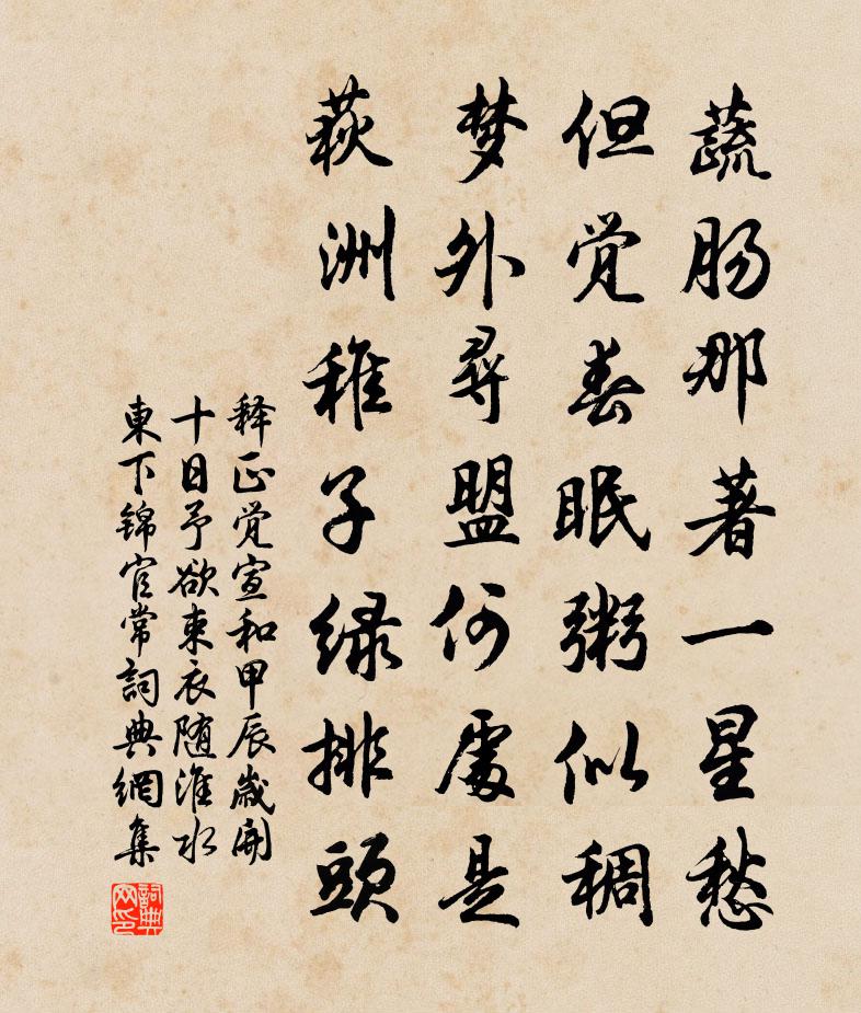 詩詞名句歷史字典書法欣賞書法字典國語詞典說文解字康熙字典古漢語字典標 題 作 者 詩 句 宣和甲辰歲開十日予欲束衣隨淮水東下錦官常作者:釋正覺 朝代:宋代原文蔬腸那著一星愁,但覺春眠粥似稠。夢外尋盟何處是,荻洲稚子綠排頭。詩詞問答問:《宣和甲辰歲開十日予欲束衣隨淮水東下錦官常》的作者是誰?答:釋正覺問:該詩寫於哪個朝代?答:宋代書法欣賞宣和甲辰歲開十日予欲束衣隨淮水東下錦官常書法作品詩文賞析【原題】:宣和甲辰歲開十日予欲束衣隨淮水東下錦官常禪人且合掌請語因留三絕詩詞推薦客枕王大受〔宋代〕山居猿狖最多情,嘯月旋風伴醉醒。昨夜靈敏聲霜外,元來不比在家聽。惠穆呂公輓詞二首蘇轍〔宋代〕風俗非平昔,賢豪棄此時。新阡長宿草,行路拜豐碑。惠術遐方記,嘉猷信史知。悲涼哭墳客,不為受恩私。百字謠 海棠周權〔元代〕輕陰滯雨,正社燕新來,東風院落。十萬紅妝梳洗罷,翠袖春寒猶薄。富貴天姿,風流睡足,酒暈潮紅玉。個般艷送自然子夏德甫何夢桂〔宋代〕子以自然名,詰我自然理。至理本無言,有言已非是。畏隹時怒號,厲風從何起。晚得復怒生,春雨果誰使。使然有感十首吳芾〔宋代〕河山關塞一萬里,文武衣冠二百年。四海蕭條宮殿去,無人解道取幽燕。阻風又成數語呈江朝宗吳芾〔宋代〕平生航浙河,不知幾往返。豈不或滯留,有時容倖免。未若此番來,所向輒相反。順水即值風,便風還阻淺。夜來獲硯劉克莊〔宋代〕二硯溫如玉琢成,信知天地有精英。馬肝紫潤尤宜沐,鵒眼青圓宛似生。未愛潘郎呼作友,便教米老拜為兄。今年次韻自詠項安世〔宋代〕雜劇只如此,古人誰不然。渭南尋竹塢,杜曲賣桑田。石裂山銜羽,松明火帶煙。夜深隨射虎,歸路恐迷阡。定西番溫庭筠〔唐代〕捍撥紫槽金襯,雙秀萼,兩回鸞。齊學漢宮妝樣,競嬋娟。三十六弦蟬鬧,小弦蜂作團。聽盡昭君幽怨,莫重彈。文宣王及其弟子贊宋高宗〔宋代〕兄弟之邦,士有廉庸。涵泳素教,表揭儒宗。杏壇探頤,洙泗從容。作興一時,莒父其封。游長安諸寺聯句。宣陽坊靜域寺。三階院聯句段成式〔唐代〕密密助堂堂,隋人歌檿桑。雙弧摧孔雀,一矢隕貪狼。 ——段成式百步望雲立,九規看月張。獲逢江客問南中故人因以詩寄司空曙〔唐代〕南客何時去,相逢問故人。望鄉空淚落,嗜酒轉家貧。疏懶辭微祿,東西任老身。上樓多看月,臨水共傷春。五柳幽居夏日陸游〔宋代〕內史蘭亭晚卜鄰,永和風月凜如新。功名不入閒人夢,詩酒猶關老子身。檐淺時時聞霣籜,池清一一見潛鱗。正令明復作文房四物詩因用其韻郭印〔宋代〕銳精文字里,今古嘆毛錐。職在中書貴,功因大手奇。楮君頻借重,墨客最相知。絕跡頭童日,麟經萬世師。題畫九首唐寅〔明代〕騎犢歸來澆葑田,角端輕掛漢編年。無人解得悠悠意,行過松陰懶著鞭。夏雨陳與義〔宋代〕三伏過幾日,坐數令人癭。片雲忽西行,庭樹生光景。須臾萬銀竹,壯觀發異境。天公終老手,一笑破日永。龍公李宮人琵琶引王士熙〔元代〕越羅蜀錦舊衣裳,贏得旁人識賜香。莫對琵琶思往事,聲聲彈出斷人腸。送楊屯田通判永興王禹偁〔宋代〕長安棄廢比藩方,通理猶宜占省郎。入洛才名齊二陸,有唐門戶本三楊。袖中丹桂家聲在,道畔豐碑祖德光。莫向至日雪後簡在伯二首趙蕃〔宋代〕一雪頓能晴,江山萬里明。故勝茅屋底,空聽滴檐聲。送錢守歸朝除大農二首唐仲友〔宋代〕賤跡歸田裡,高懷不世情。細傾憂國酒,頻話及時耕。紫橐恩將近,茅茨計未成。攀轅無好語,所願達時英。名句推薦寧可枝頭抱香死,何曾吹落北風中。鄭思肖《畫菊》 日夕涼風至,聞蟬但益悲。孟浩然《秦中感秋寄遠上人 / 秦中寄遠上人》 置酒長安道,同心與我違。王維《送綦毋潛落第還鄉 / 送別》 圓荷浮小葉,細麥落輕花。杜甫《為農》 君子之守,修其身而天下平。孟子《孟子·盡心章句下·第三十二節》 無分者,人之大害也; 有分者,天下之本利也荀子《荀子·富國》 遙憶獨眠人,早寒驚夢頻。顧貞觀《菩薩蠻·山城夜半催金柝》 露濕晴花春殿香,月明歌吹在昭陽。李益《宮怨》 樹陰滿地日當午,夢覺流鶯時一聲。蘇舜欽《夏意》 酒意詩情誰與共?淚融殘粉花鈿重。李清照《蝶戀花·暖雨晴風初破凍》