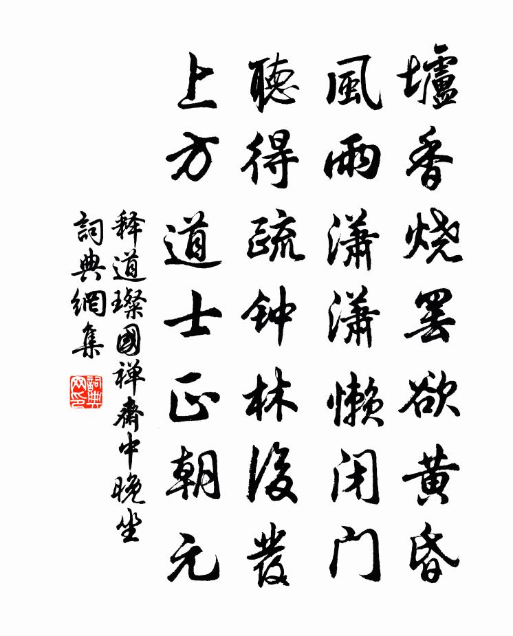 詩詞名句歷史字典書法欣賞書法字典國語詞典說文解字康熙字典古漢語字典標 題 作 者 詩 句 國禪齋中晚坐作者:釋道璨 朝代:宋代國禪齋中晚坐原文壚香燒罷欲黃昏,風雨瀟瀟懶閉門。聽得疏鍾林後發,上方道士正朝元。詩詞問答問:國禪齋中晚坐的作者是誰?答:釋道璨問:國禪齋中晚坐寫於哪個朝代?答:宋代釋道璨國禪齋中晚坐書法欣賞國禪齋中晚坐書法作品詩詞推薦和仁仲春日十絕胡寅〔宋代〕陋巷當年只屢空,於今還詠舞雩風。已推寶瑟鏗然後,莫認青春醉眼中。夜分讀書有感陸游〔宋代〕光陰百歲已中分,擬結茅茨老白雲。萬里誰憐新臥疾,九重猶記舊能文。枕邊得句題屏疊,馬上看山隔帽裙。終恨謝新恩·冉冉秋光留不住李煜〔唐代〕冉冉秋光留不住,滿階紅葉暮。又是過重陽,台榭登臨處。茱萸香墮,紫菊氣,飄庭戶,晚煙籠細雨。雍雍新雁咽送潤卿博士還華陽皮日休〔唐代〕雪打篷舟離酒旗,華陽居士半酣歸。逍遙只恐逢雪將,恬淡真應降月妃。仙市鹿胎如錦嫩,陰宮燕肉似酥肥。公車水龍吟呂岩〔唐代〕目前咫尺長生路,多少愚人不悟。愛河浪闊,洪波風緊,舟船難渡。略聽仙師語,到彼岸,只消一句。鍊金丹換了虞美人(席上贈王提刑)陳師道〔宋代〕城南觀閣連雲起。形像丹青里。使君笳鼓渡江來。盡帶江南春色、放春回。青春欲住風催去。流水花無數。尊前觸讀書陸游〔宋代〕束 * 交一世豪,暮年憔悴困蓬蒿。文辭博士書驢券,職事參軍判馬曹。病里猶須看周易,醉中亦復讀離騷。若為白雲樓張俞〔宋代〕城上新開百尺樓,白雲人伴白雲留。山川半倚三吳勝,江漢常吞七澤流。洛中士君子多以平泉見呼愧獲方外方之名…奉寄劉賓客李德裕〔唐代〕非高柳下逸,自愛竹林閒。才異居東里,愚因在北山。徑荒寒未掃,門設晝長關。不及鴟夷子,悠悠煙水間。過陂子逕五十餘里,喬木蔽天,遣悶七絕句楊萬里〔宋代〕為憐上轎齧人肩,下轎行來腳底穿。客子心心愁欲暮,碧雲偏作半陰天。答黃藪富道王令〔宋代〕角角適時足,力走猶或遲。從而不逮人,不若坐視之。而予始用此,已無先人思。間自念斯世,固亦未易為。以其資政入村造壽器謾賦陳宗遠〔宋代〕功成身退從來少,綠野超然洗俗埃。閒出西疇營六檟,勝傳南極映三槐。迎門村婦攜兒拜,遮道田翁帶犬回。競喜卜運算元姜夔〔宋代〕月上海雲沈,鷗去吳波回。行過西泠有一枝,竹暗人家靜。又見水沈亭,舉目悲風景。花下鋪氈把一杯,緩飲春風洲上吳錫疇〔宋代〕藜杖步芳洲,風花點碧流。詩情鳧泛泛,心事水悠悠。有約山長翠,無名草自幽。聲聲啼布穀,夜雨足西疇。奉和聖制立春日侍宴內殿出翦彩花應制上官昭容〔唐代〕密葉因裁吐,新花逐翦舒。攀條雖不謬,摘蕊詎知虛。春至由來發,秋還未肯疏。借問桃將李,相亂欲何如。金人捧露盤(送范東叔給事帥維揚)高似孫〔宋代〕下明光,違宣曲,上揚州。玉帳暖、十萬貔貅。梅花照雪,月隨歌吹到江頭。牙檣錦纜,聽雁聲、夜宿瓜州。南山送馮八將軍奏事畢歸滑台幕府崔峒〔唐代〕王門別後到滄洲,帝里相逢俱白頭。自嘆馬卿常帶疾,還嗟李廣不封侯。棠梨宮裡瞻龍袞,細柳營中著虎裘。想到壽潁季蘇泂〔宋代〕有屋鬚生子,為家要及時。雲山千態度,弓冶幾書詩。壽日能佳事,秋風況捷期。長年一杯酒,吾與菊花知。頌古一○一首釋子淳〔宋代〕妙圓無相劫前人,隨類權分百億身。月夜御樓才報曉,平明六國盡逢春。浣溪沙王哲〔元代〕一個詞兒十二金。修行謹按日時尋。急將猿馬緊牢擒。五戶自然開闡盡,玉花叢里洞門深。舊來那個是知音。名句推薦前村深雪裡,昨夜一枝開。齊己《早梅》 行盡江南,不與離人遇。晏幾道《蝶戀花·夢入江南煙水路》 歲雲暮矣多北風,瀟湘洞庭白雪中。杜甫《歲晏行》 蜂爭粉蕊蝶分香,不似垂楊惜金縷。溫庭筠《惜春詞》 秋至搗羅紈,淚滿未能開。江淹《悼室人》 何處寄想思,南風搖五兩。王維《送宇文太守赴宣城》 愁無限,消瘦盡,有誰知?閒教玉籠鸚鵡念郎詩。納蘭性德《相見歡·落花如夢淒迷》 微雨靄芳原,春鳩鳴何處。韋應物《東郊》 雲收雨過波添,樓高水冷瓜甜,綠樹陰垂畫檐。白樸《天淨沙·夏》 暮雨忽來鴻雁杳,莽關山、一派秋聲里。龔自珍《金縷曲·癸酉秋出都述懷有賦》