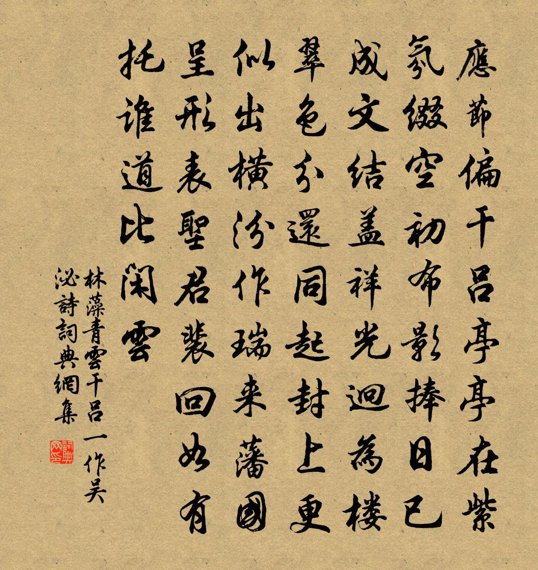詩詞名句歷史字典書法欣賞書法字典國語詞典說文解字康熙字典古漢語字典標 題 作 者 詩 句 青雲乾呂(一作吳泌詩)作者:林藻 朝代:唐代青雲乾呂(一作吳泌詩)原文應節偏乾呂,亭亭在紫氛。綴空初布影,捧日已成文。結蓋祥光迥,為樓翠色分。還同起封上,更似出橫汾。作瑞來藩國,呈形表聖君。裴回如有托,誰道比閒雲。詩詞問答問:青雲乾呂(一作吳泌詩)的作者是誰?答:林藻問:青雲乾呂(一作吳泌詩)寫於哪個朝代?答:唐代問:青雲乾呂(一作吳泌詩)是什麼體裁?答:五排林藻青雲乾呂(一作吳泌詩)書法欣賞青雲乾呂(一作吳泌詩)書法作品注釋全唐詩:卷319-25詩詞推薦寄閻記室譚用之〔唐代〕織錦歌成下翠微,豈勞西去問支機。未開水府珠先見,不掘豐城劍自輝。鰲逐玉蟾攀桂上,馬隨青帝踏花歸。相逢上章納祿恩畀外祠遂以五月初東歸陸游〔宋代〕身似霜松老不枯,乞骸猶得待清都。百錢濁酒渾家醉,六月飛蚊徹曉無。美睡不愁閒客攪,出遊自有小兒扶。買山呂朝散輓詩二首李廌〔宋代〕金馬玉堂高步宜,中年遂與水雲期。太沖早擅三都賦,叔度難量萬頃陂。夜壑藏舟今孰在,白駒過隙事堪悲。南園清平樂毛滂〔宋代〕天連翠瀲。九折玻璃軟。回抱金堤清宛轉。疑共蓬萊清淺。吾君欲濟如何。唐虞風順無多。自有松舟檜楫,一帆三書情上大尹十兄盧綸〔唐代〕紫陌絕纖埃,油幢千騎來。剖辭紛若雨,奔吏殷成雷。聖澤初憂壅,群心本在台。海鱗方潑剌,雲翼暫徘徊。芳室送姚先生歸宜山三首陳師道〔宋代〕宇定心清面發丹,下床投杖覺輕安。此身已許壺丘子,他日爭尋靖長官。和吳克明廣文賦梅辛棄疾〔宋代〕誰詠寒枝入國風,廣文官冷更詩窮。偶隨岸柳春先覺,試比山樊韻不同。十頃清風明月外,一杯疏影暗香中。遙知詠簾丁謂〔宋代〕南楚佳名舊,西都妙制稀。風輕搖美璧,香細透明機。翠羽翻羅幄,龍文壓錦帷。蘭宮將桂殿,日用覺光輝。鷓鴣天姚述堯〔宋代〕鳳闕朝回曉色分。彩霞輕拂絳衣新。炎烏影里年年好,碧玉枝頭日日春。攜翠斝,對芳尊。東君著意屬詩人。夜深送胡季昭謫象州次王盧溪送澹庵眨新州韻李元實〔宋代〕清名傳播到黃支,直節寧憂趙氏危。虎尾蹈時都不畏,象台到日大為奇。是行廊廟人皆怍,所過山川鬼亦知。官職殘暑招客白居易〔唐代〕雲截山腰斷,風驅雨腳回。早陰江上散,殘熱日中來。卻取生衣著,重拈竹簟開。誰能淘晚熱,閒飲兩三杯。詠史下楊太后陳普〔宋代〕醜短妍長熟用心,國家持換郭槐金。一門姊妹同傾晉,餓死猶輕罪更深。明鑑先生釋心月〔宋代〕支幹念二金釘子,變態無窮無盡時。盡大地人都釘定,先生知後更誰知。李總乾遺詩十四句師於一句之下加頌七句釋印肅〔宋代〕僧家起大屋,枉費他金谷。不是明眼人,真如大地獄。黃葉止孩啼,只要免啼哭。不犯一滴酒,不動一片肉。上廣東漕使黃郎中曾豐〔宋代〕三春弸兮,中氣彭兮。季於孟仲,和之精兮。至精收蒸,天相大明。公生京京,集春之成。上元遇雨淳佑士人〔宋代〕隱隱雷聲天鼓吹,熒熒燈火夜星辰。風流太守明如鏡,何用姮娥作主人。御苑採茶歌十首熊蕃〔宋代〕鳳山日日滃非煙,剩得三春雨露天。棠坼淺紅酣一笑,柳垂淡綠困三眠。海棠黃庭堅〔宋代〕海棠院裡尋春色,日炙薦紅滿院香。不覺風光都過了,東窗渾為讀書忙。感寓三首戴復古〔宋代〕古今通一理,趨鄉自多門。賢士玉成美,貪夫金注昏。誰知身是患,人以道為尊。前輩□□死,姓名千載存。年侵晁公溯〔宋代〕年侵慵更甚,帙亂卷還舒。衰白愁看鏡,雌黃倦校憶。臨風知地爽,映日愛窗虛。近報畲田粟,洿邪亦滿車。名句推薦細雨濕衣看不見,閒花落地聽無聲。劉長卿《別嚴士元》 擬把傷離情緒,待曉寒重說。納蘭性德《好事近·簾外五更風》 松江上,念故人老矣,甘臥閒雲。吳文英《沁園春·送翁賓暘游鄂渚》 臨行挽衫袖,更嘗折殘菊。蘇軾《送頓起》 雲里帝城雙鳳闕,雨中春樹萬人家。王維《奉和聖制從蓬萊向興慶閣道中留春雨中春望之作應制》 接葉巢鶯,平波卷絮,斷橋斜日歸船。張炎《高陽台·西湖春感》 智用於眾人之所不能知,而能用於眾人之所不能見。王詡《鬼谷子·謀篇》 眼前直下三千字,胸次全無一點塵。于謙《觀書》 遊人日暮相將去,醒醉喧譁。歐陽修《採桑子·清明上巳西湖好》 在天成象,在地成形。脫脫《宋史·志·卷五十二》