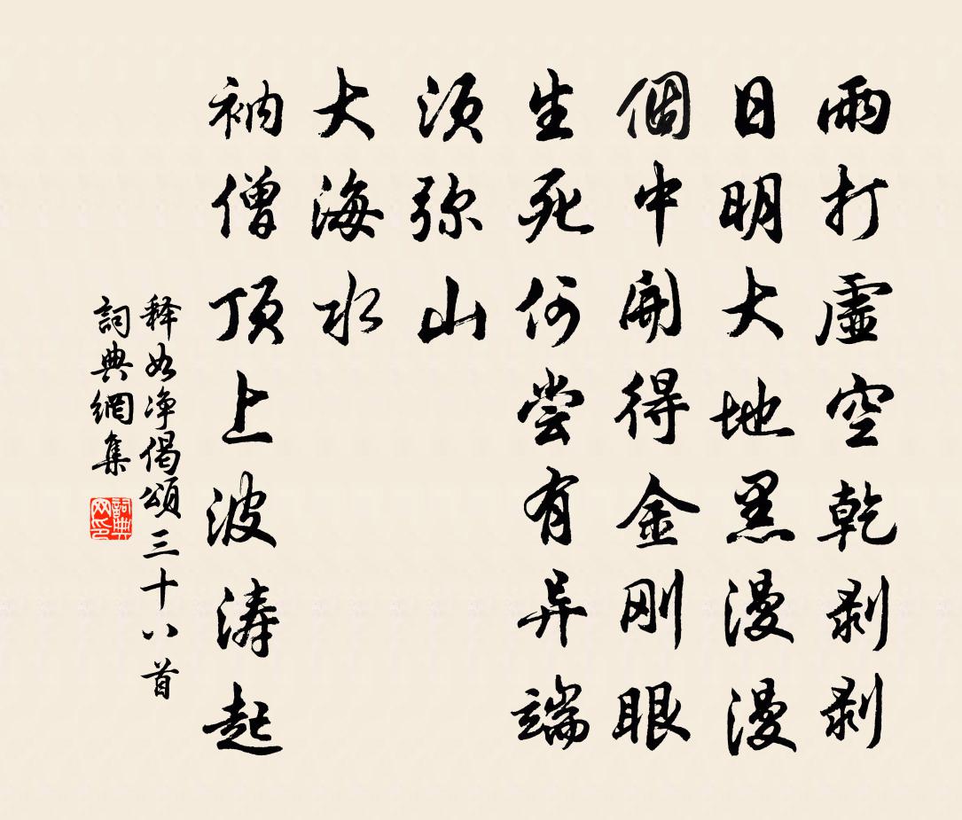 詩詞名句歷史字典書法欣賞書法字典國語詞典說文解字康熙字典古漢語字典標 題 作 者 詩 句 偈頌三十八首作者:釋如淨 朝代:宋代偈頌三十八首原文雨打虛空乾剝剝,日明大地黑漫漫。箇中開得金剛眼,生死何嘗有異端。須彌山,大海水,衲僧頂上波濤起。詩詞問答問:偈頌三十八首的作者是誰?答:釋如淨問:偈頌三十八首寫於哪個朝代?答:宋代釋如淨偈頌三十八首書法欣賞偈頌三十八首書法作品詩詞推薦法曲獻仙音陳允平〔宋代〕風籜晴暄,晝桐陰早,燕閣新香時度。沁月樓台,帶山城郭,西湖翠嬌紅嫵。甚愛此閒中趣,尋盟舊鷗鷺。共容與和劉珵西湖十洲柳汀舒坦〔宋代〕困倚滄波綠動搖,冷煙疏雨共蕭條。誰將輕薄嬌春態,強拂人頭向市橋。閒房釋文珦〔宋代〕閒房近竺岑,四面是清陰。涉物皆成趣,無因廢得吟。蛇蟠枯樹腹,雀乳古亭心。倘或遊人見,猶疑隱欠深。二十三日天氣絕佳西軍還二十四日東如績溪方回〔宋代〕獨會綠陰下,追思秋日春。眠蠶方放大,早麥欲嘗新。豈意賊生賊,忍聞人食人。何時兵遂解,縱遣上城民。春暮思平泉雜詠二十首西嶺望鳴皋山李德裕〔唐代〕高秋對涼野,四望何蕭瑟。遠見鳴皋山,青峰原上出。晨興採薇蕨,向暮歸蓬蓽。詎假數揮金,餐和養余日。贈趙公旦張嵲〔宋代〕少年意氣隘九州,遠別不為兒女愁。只今摧頹落異縣,跬步信宿生離憂。況今送子又千里,使我別緒何能休。憶昔古銅小鼎硯滴銘汪炎昶〔宋代〕泗水沒實鼎,此豈其雲仍。煅頑煉鈍凝,赤精小瓠斷。匯枵以盛篆,細丹霞疑古。銘如蟲齧餘,滲枯青石液。迸雲歲未盡前數日偶題長句陸游〔宋代〕漸近新年日愈長,不辭扶病舉椒觴。了無一事乾靈府,只合終身住醉鄉。門飣春盤兒女喜,搗簁臘藥婢奴忙。蜀州書適陸游〔宋代〕家食身無役,耆年力未衰。寓歡那待酒,隨意或成詩。窮達元非我,冤親竟是誰?惟嗟見事晚,枉卻鬢邊絲。送汪洞書大猷歸鄞司馬伋〔宋代〕日者真奇中,春風畫鷁行。東山須繼起,南浦獨傷情。越岸江山麗,都門祖道榮。里閭高臥際,趣詔逐追程。寄明藏主釋如珙〔宋代〕一顆如來藏里珠,靈光爍破眾人疑。大千沙界無塵土,即是塵勞未脫時。詠蓮杜衍〔宋代〕鑿破蒼苔漲作池,芰荷分得綠參差。曉開一朵煙波上,似畫真婦出浴時。惠崇畫王安石〔宋代〕斷取滄州趣,移來六月天。道人三昧力,變化只和鉛。重入洛陽東門李紳〔唐代〕商顏重命伊川叟,時事知非入洛人。連野碧流通御苑,滿階秋草過天津。每慚清秩容衰齒,猶有華簪寄病身。驅馬二風詩治風詩五篇至理元結〔唐代〕理何為兮,系修文德。加之清一,莫不順則。意彼刑法,設以化人;致使無之,而化益純。所謂代刑,以道去殺。冒雨出省示同舍宋庠〔宋代〕簇雲絲雨共淒迷,紅日應銜苑樹西。陌上絳塗深幾許,羸驂無錦可障泥。題余尚書山居要術祖無擇〔宋代〕張衡已作歸田賦,氾勝仍修種樹書。願借山居精要術,欲將嵩洛葺吾廬。寄昭應王丞楊巨源〔唐代〕武皇金輅輾香塵,每歲朝元及此辰。光動泉心初浴日,氣蒸山腹總成春。謳歌已入雲韶曲,詞賦方歸侍從臣。瑞靄送友人赴鄉舉陳郁〔宋代〕我方治地種秋芳,君亦濡毫擬擅場。待得君歸醉重九,捷旗如我菊花黃。自題山亭三首徐鉉〔唐代〕跂石仍臨水,披襟復持冠。機心忘未得,棋局與魚竿。名句推薦籌邊獨坐,豈欲登覽快雙眸。戴復古《水調歌頭·題李季允侍郎鄂州吞雲樓》 水滿田疇稻葉齊,日光穿樹曉煙低。徐璣《新涼》 晚鴉飛去,一枝花影送黃昏夏完淳《婆羅門引·春盡夜》 新園鎖卻愁陰,露黃漫委,寒香半畝。吳文英《瑞龍吟·送梅津》 儒以文亂法,俠以武犯禁。韓非及後人《韓非子·五蠹》 燕山雪花大如席,片片吹落軒轅台。李白《北風行》 有耳莫洗潁川水,有口莫食首陽蕨李白《行路難三首》 審知四度,可以定天下,可安一國。佚名《黃帝四經·經法·四度》 醉折殘梅一兩枝,不妨桃李自逢時。陸游《落梅》 憶與君別年,種桃齊蛾眉。李白《獨不見》